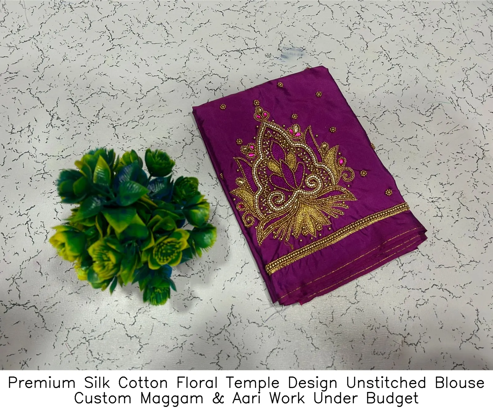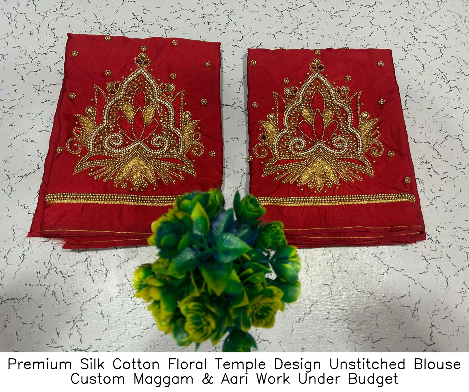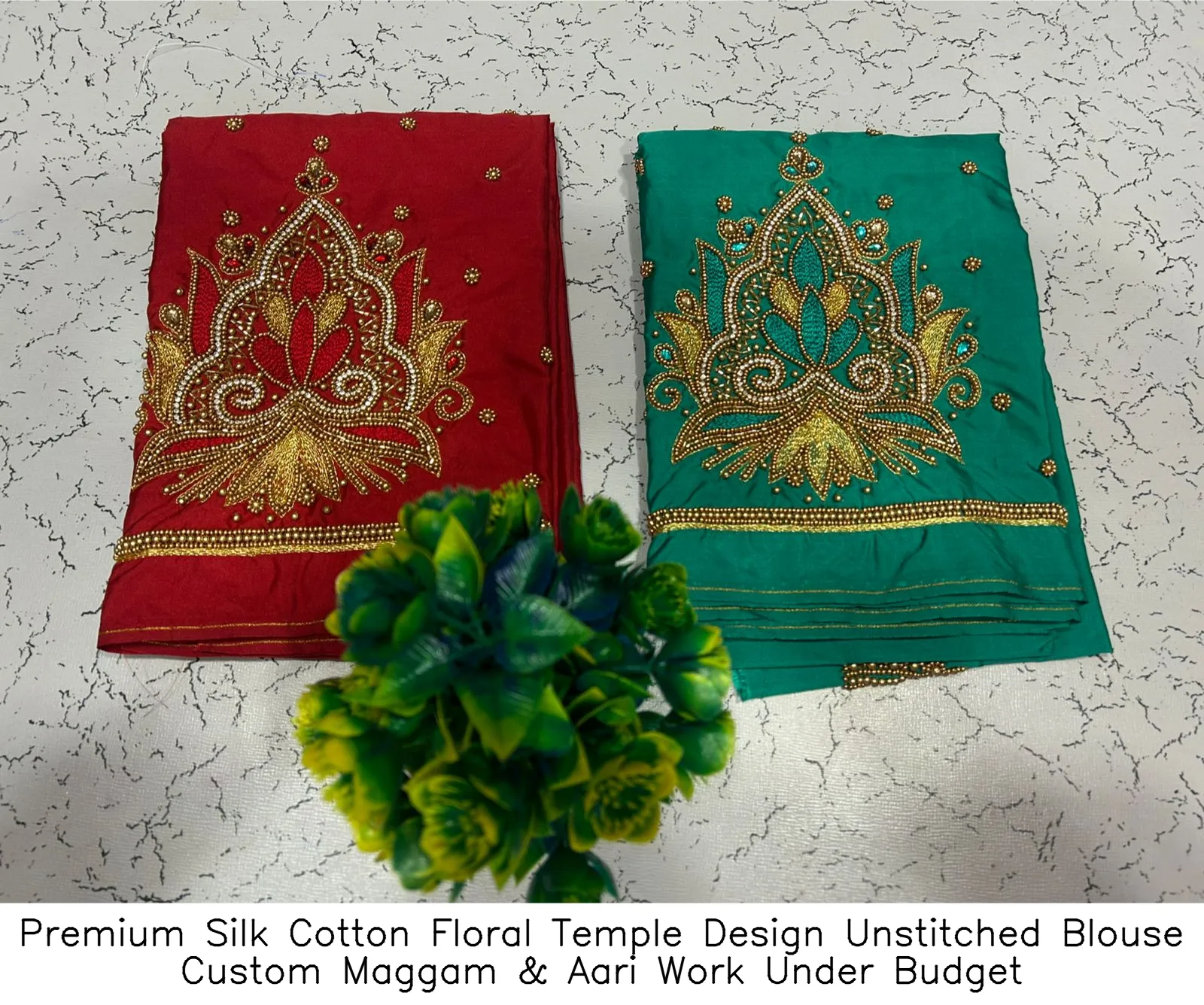Premium Silk Cotton Floral Temple Design Unstitched Blouse – Custom Maggam & Aari Work Under Budget