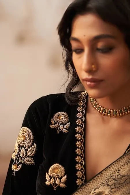 V-Neck Black Zardosi Maggam Work Blouse Elegant Party Wear Under 5K Custom Fit Ready Features and Benefits