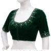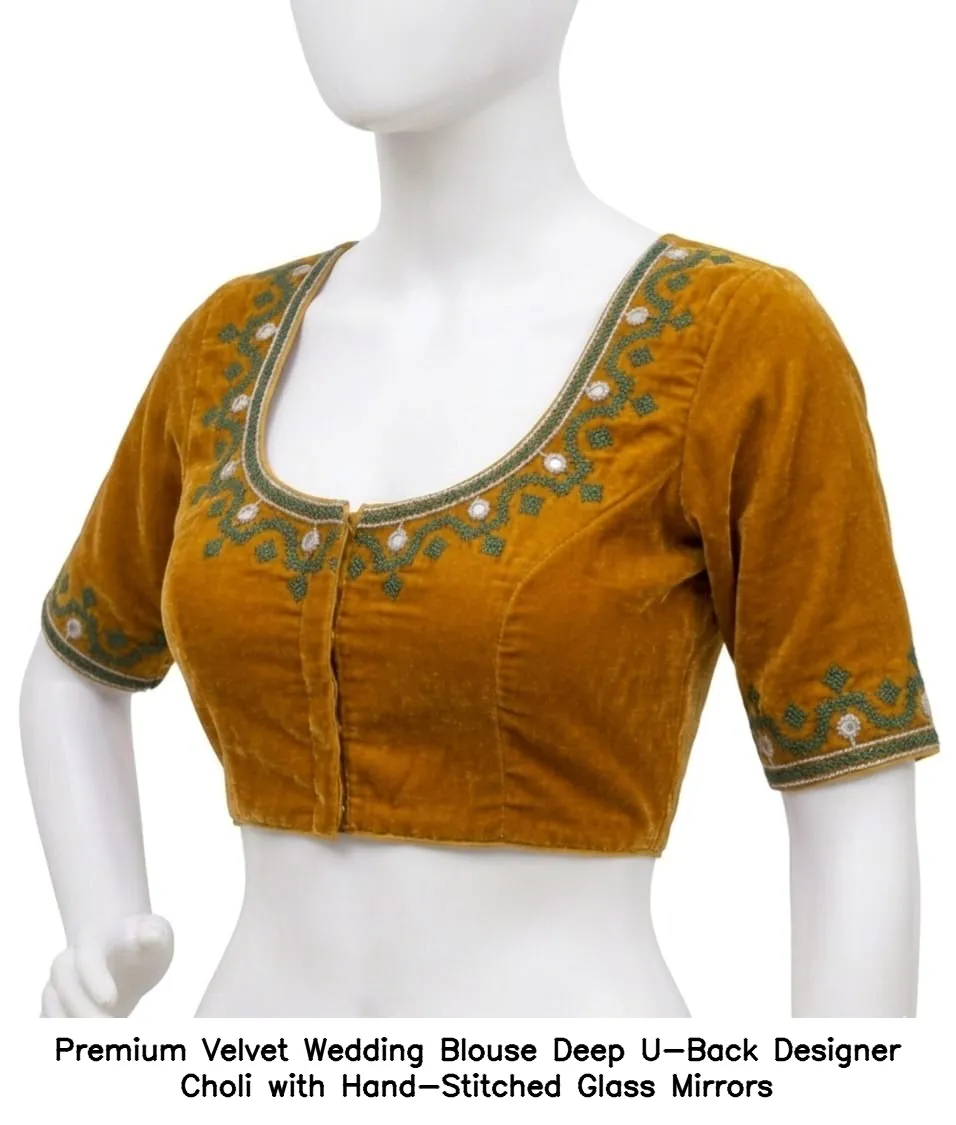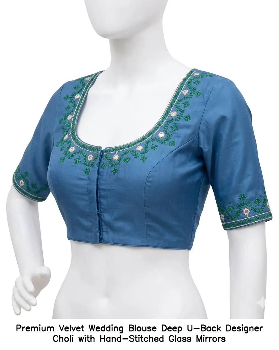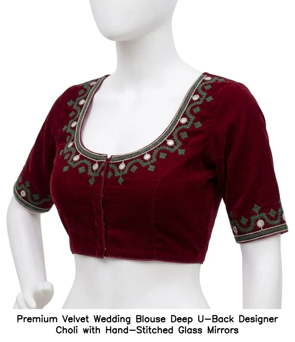 Premium Velvet Wedding Blouse – Deep U-Back Designer Choli with Hand-Stitched Glass Mirrors