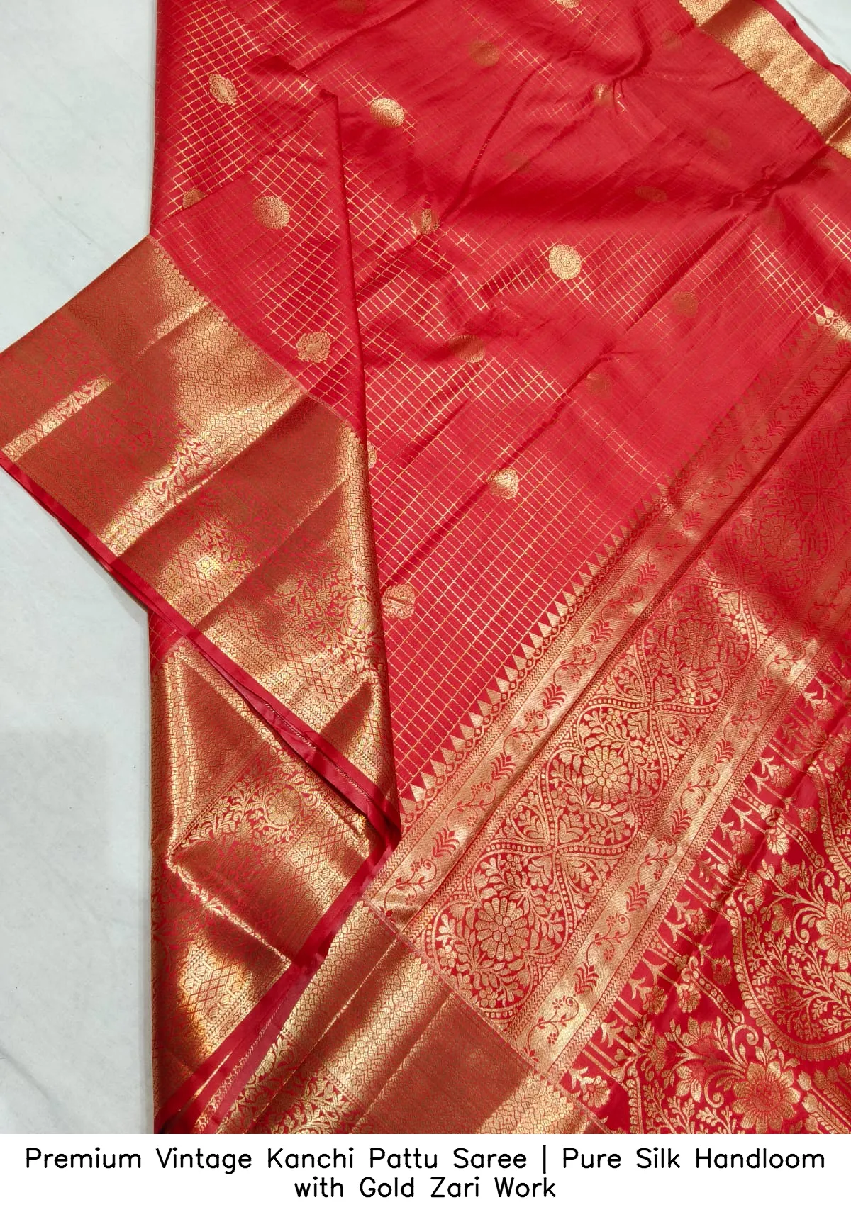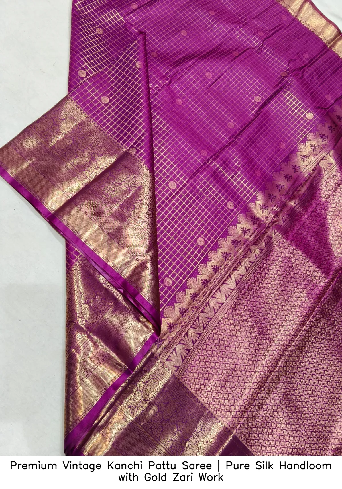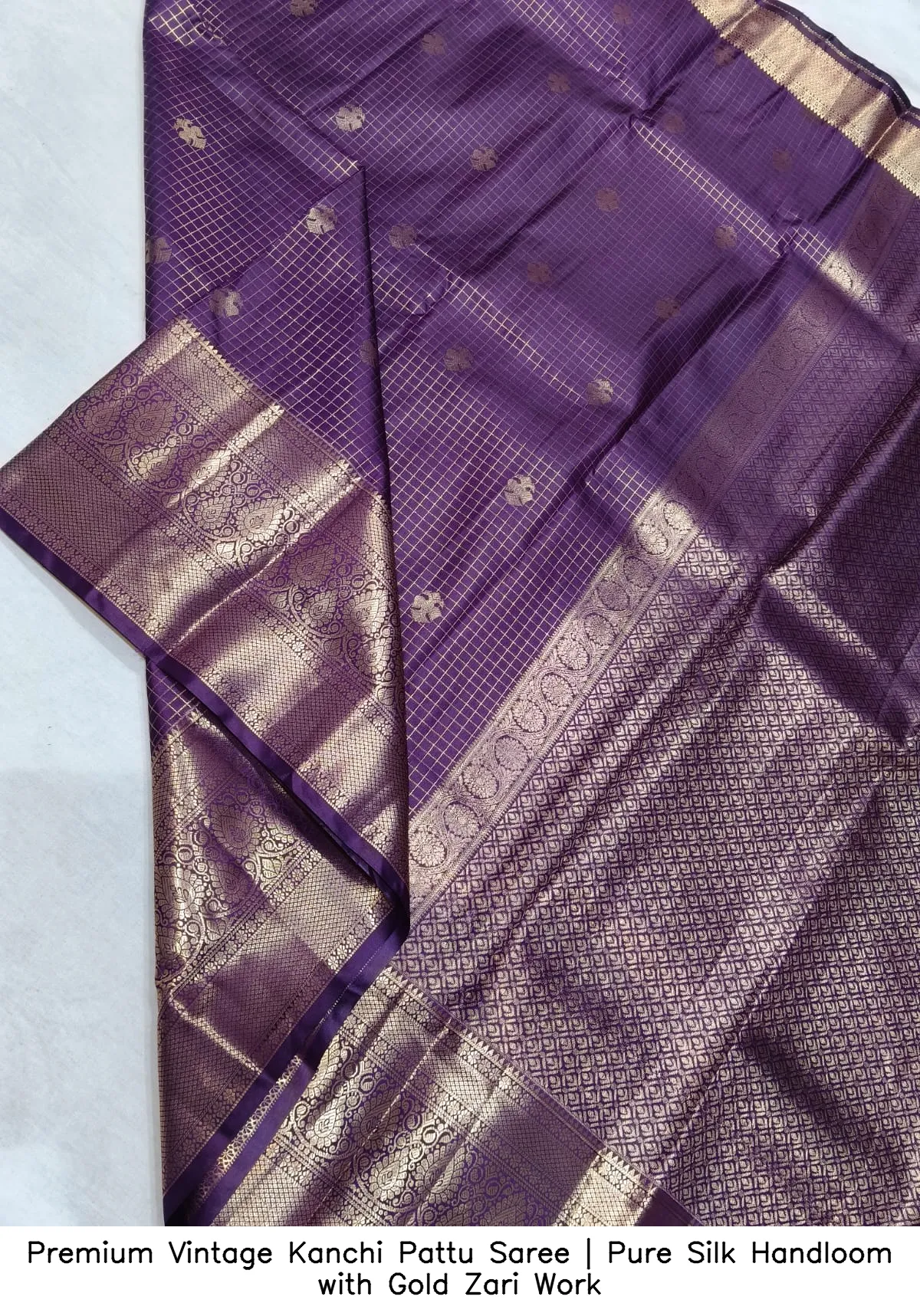 Discover the elegance of our Premium Vintage Kanchi Pattu Saree | Pure Silk Handloom with Gold Zari Work. This exquisite saree is crafted from premium Kanchi pattu handloom silk, offering a luxurious feel and timeless beauty.