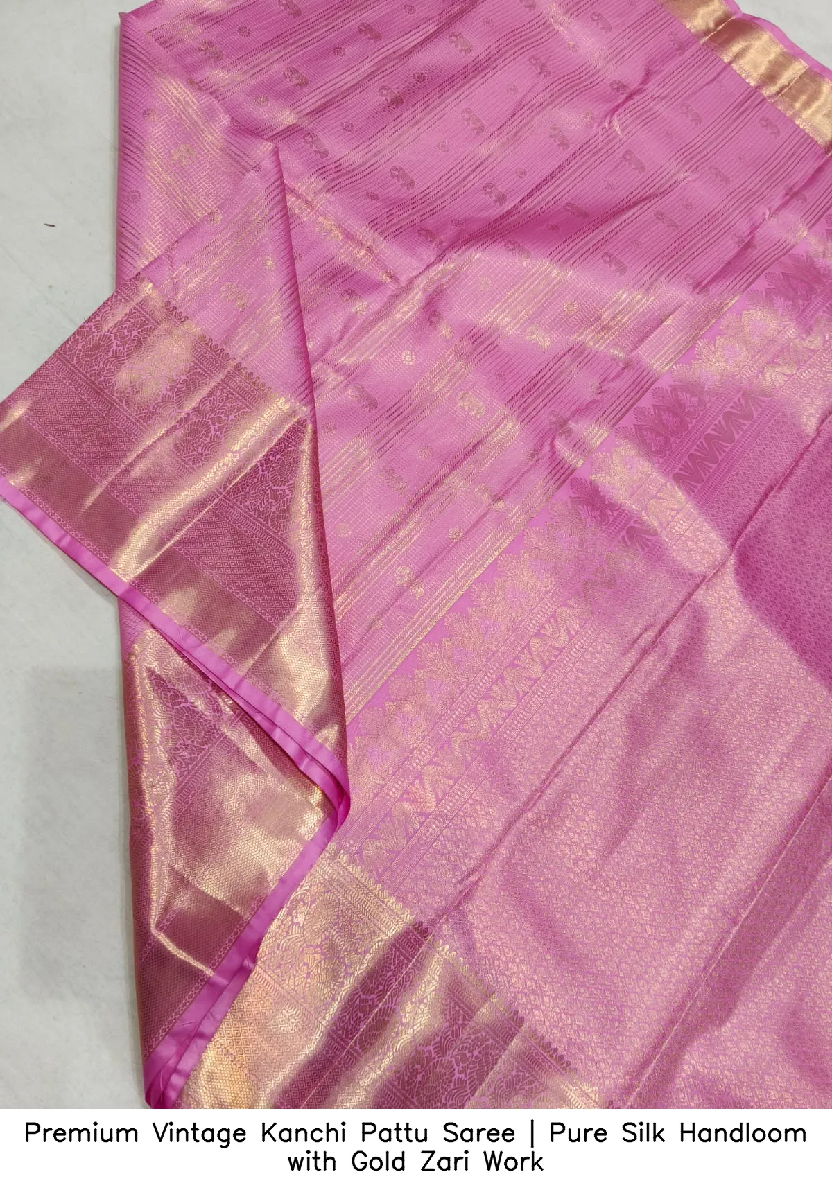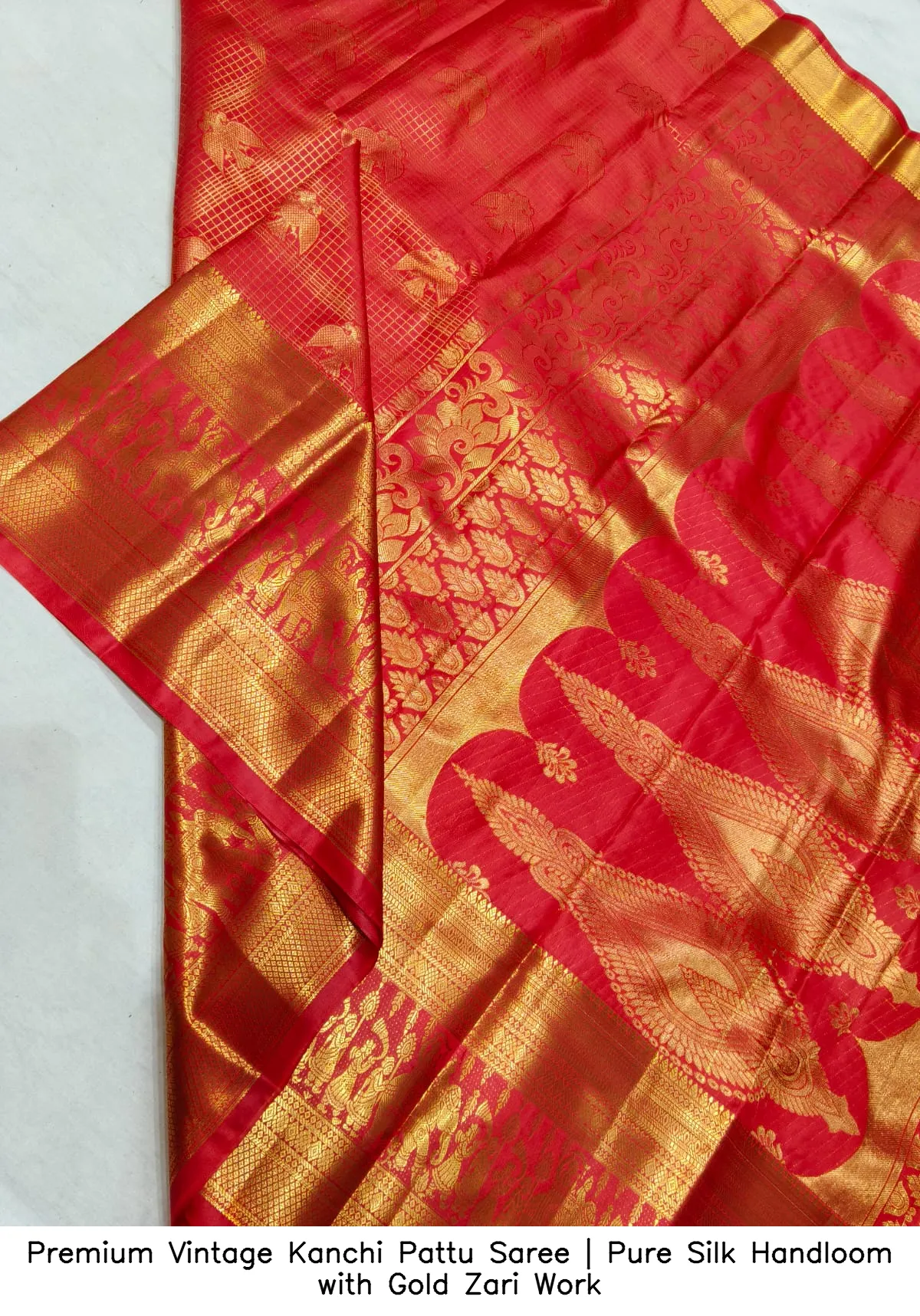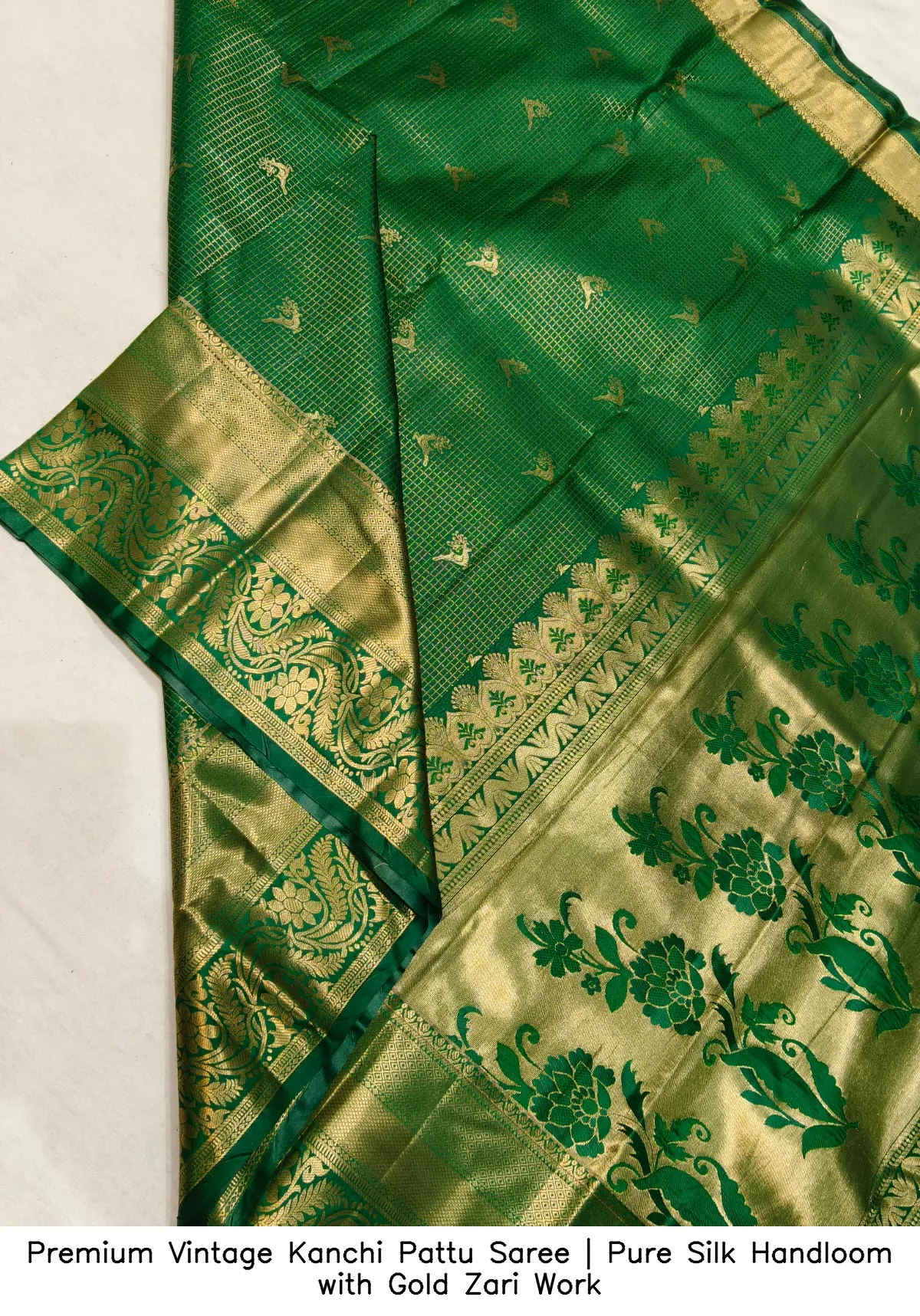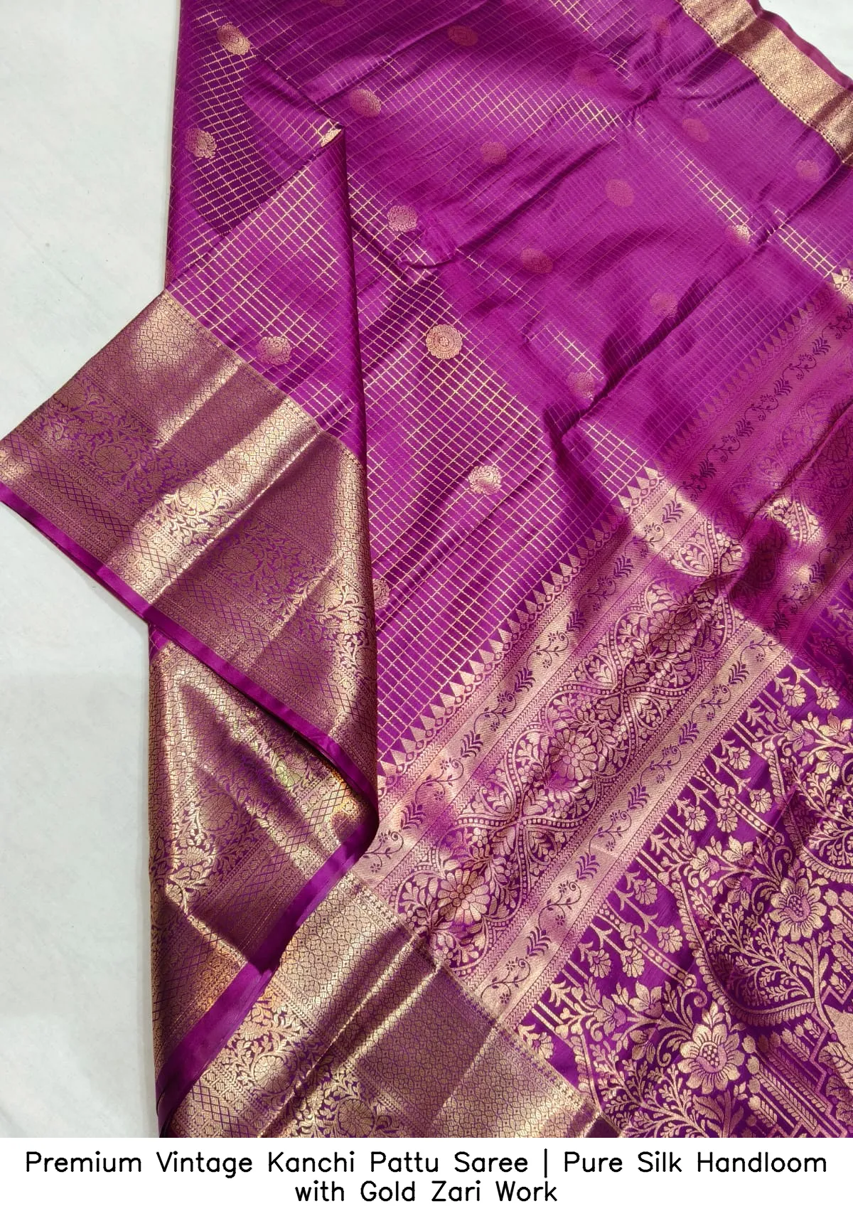 Discover the elegance of our Premium Vintage Kanchi Pattu Saree | Pure Silk Handloom with Gold Zari Work. This exquisite saree is crafted from premium Kanchi pattu handloom silk, offering a luxurious feel and timeless beauty.