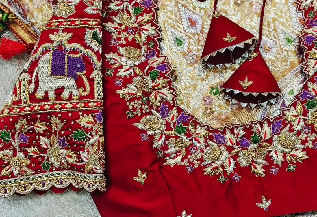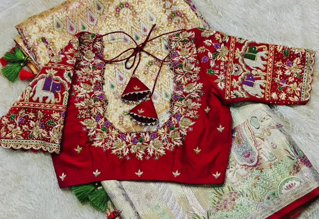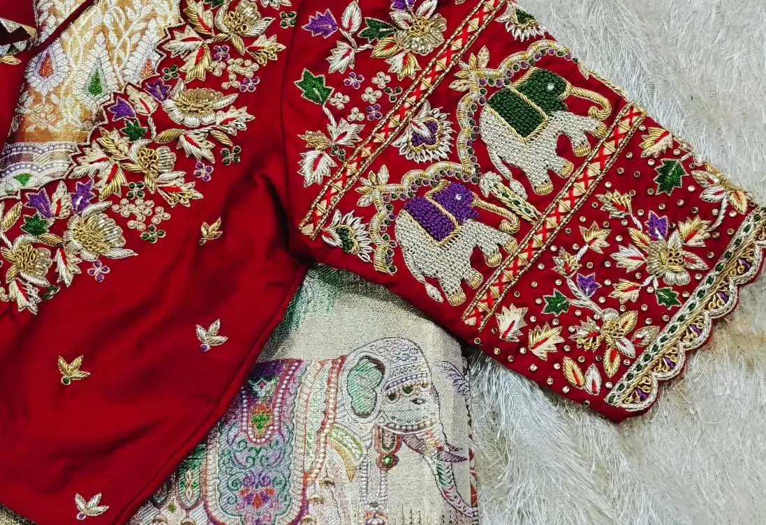 Product Name: Majestic Red Elephant Maggam Work Blouse – Handcrafted Grandeur on a Budget Price Per Pc: 6500 INR Fabric Details: Raw Silk Half pattu Size: Xl, XXL, 3XL Colors: Red, Pink,Blue ,Purple, wine ,