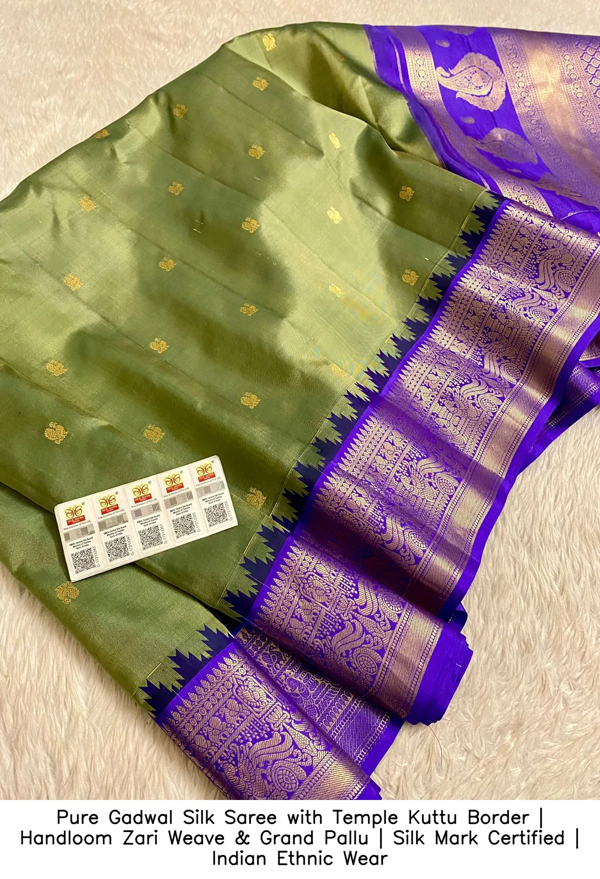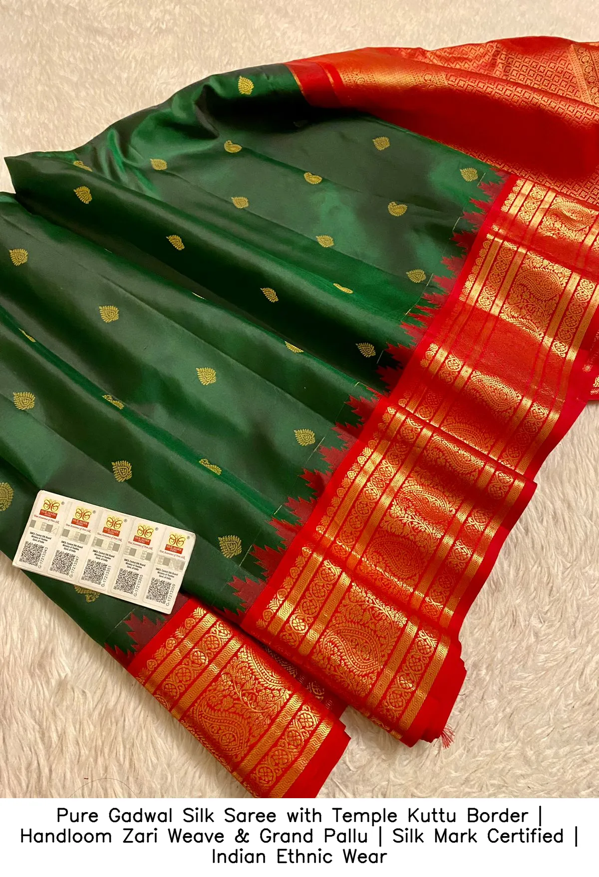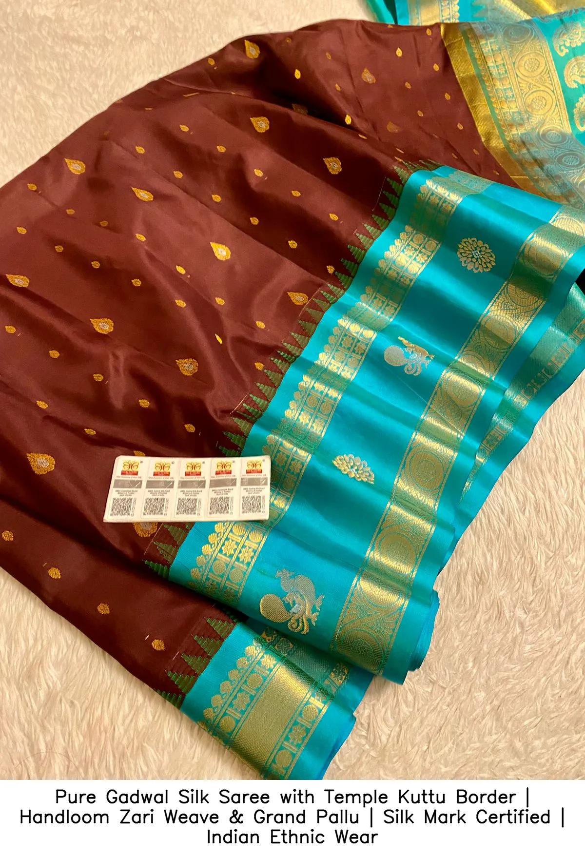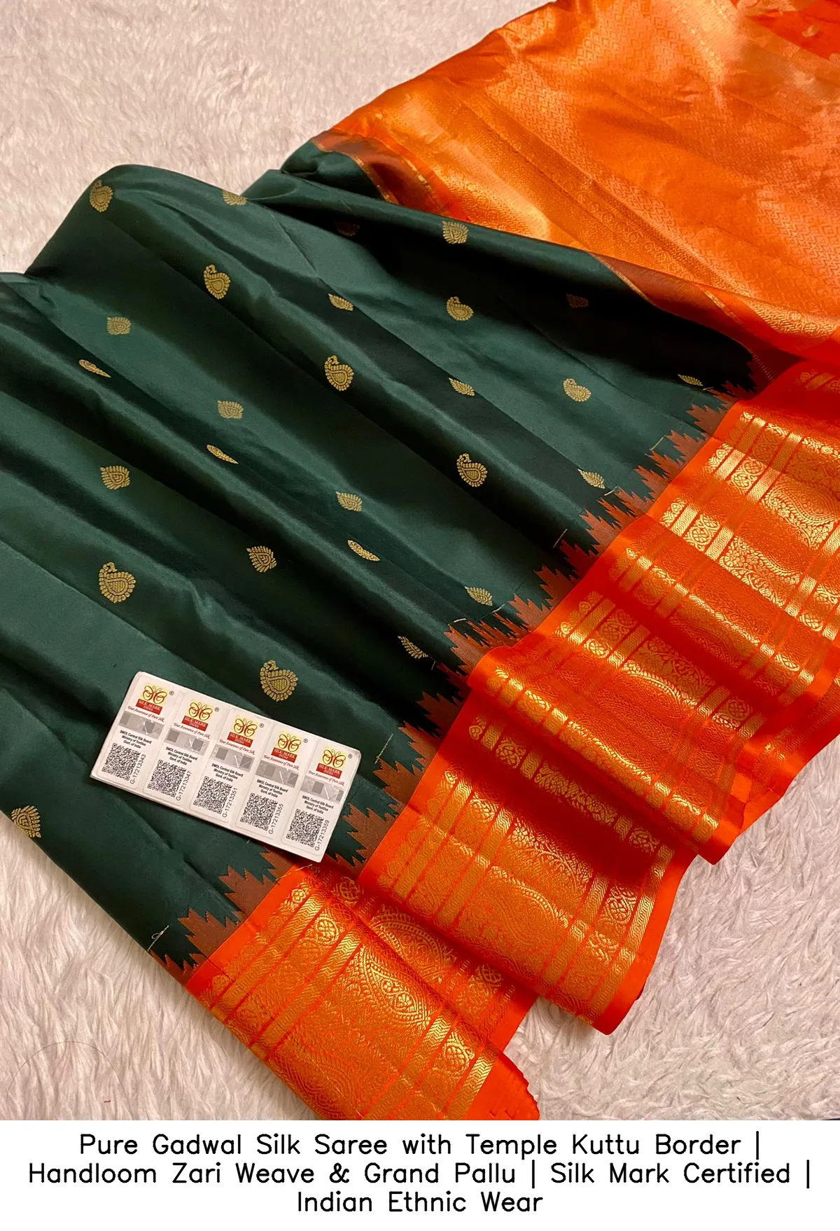 Pure Gadwal Silk Saree with Temple Kuttu Border | Handloom Zari Weave & Grand Pallu | Silk Mark Certified | Indian Ethnic Wear