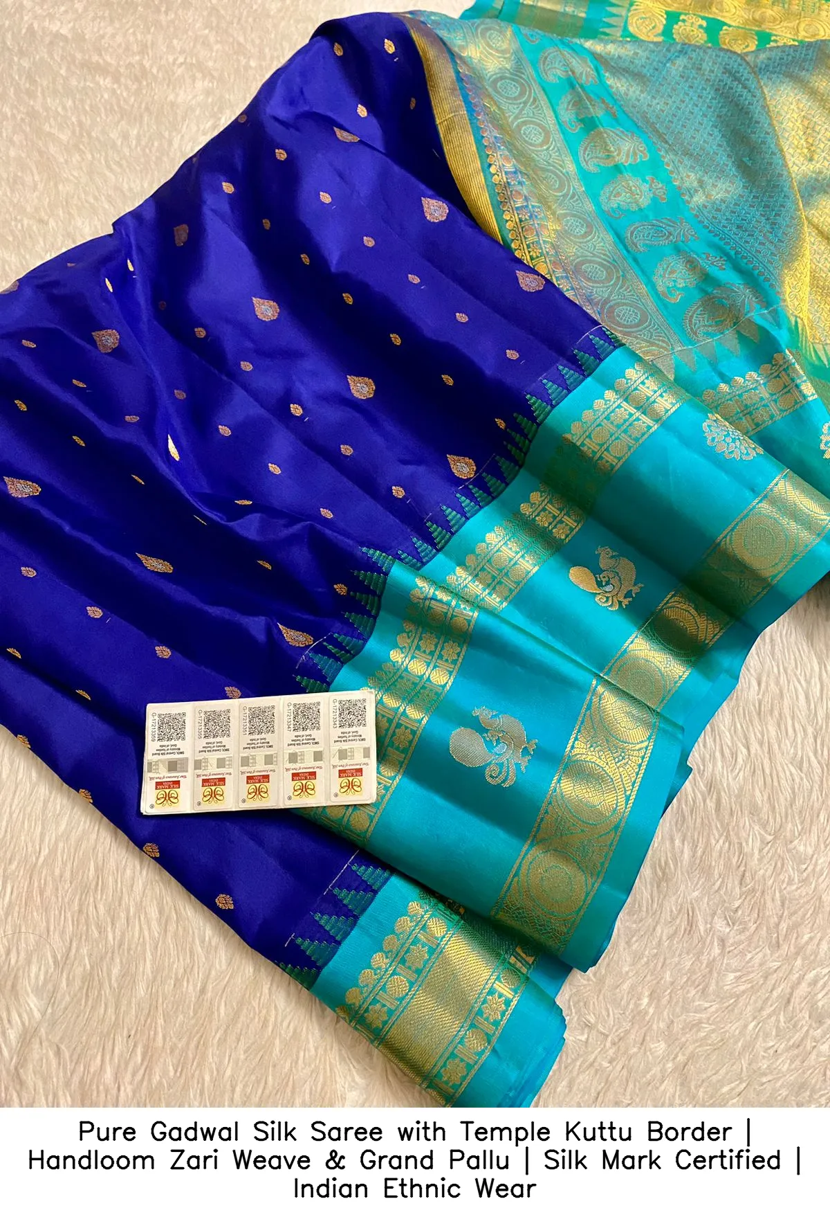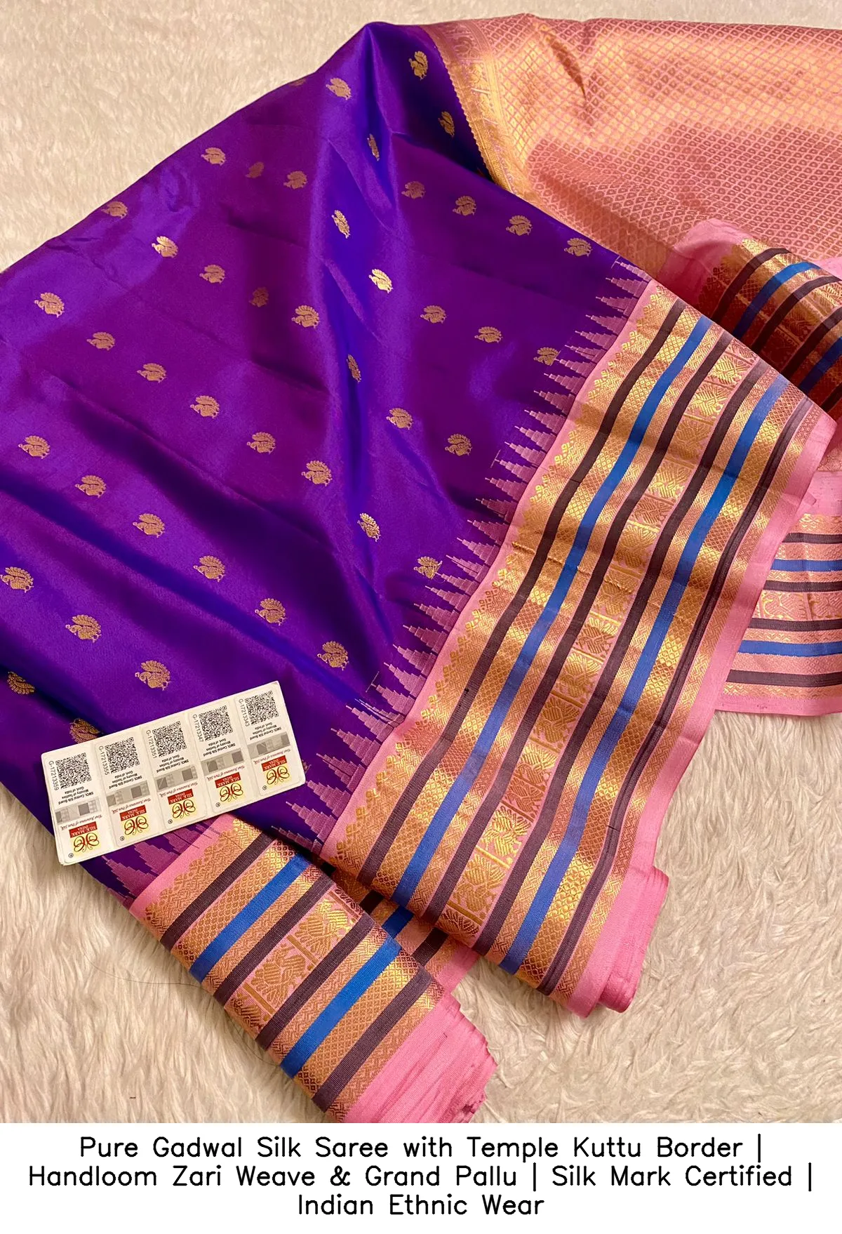Product Name: Pure Gadwal Silk Saree with Temple Kuttu Border | Handloom Zari Weave & Grand Pallu | Silk Mark Certified | Indian Ethnic Wear