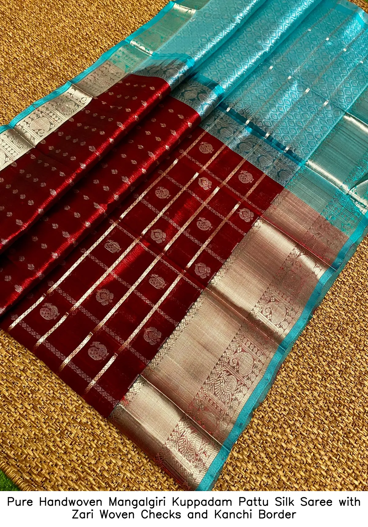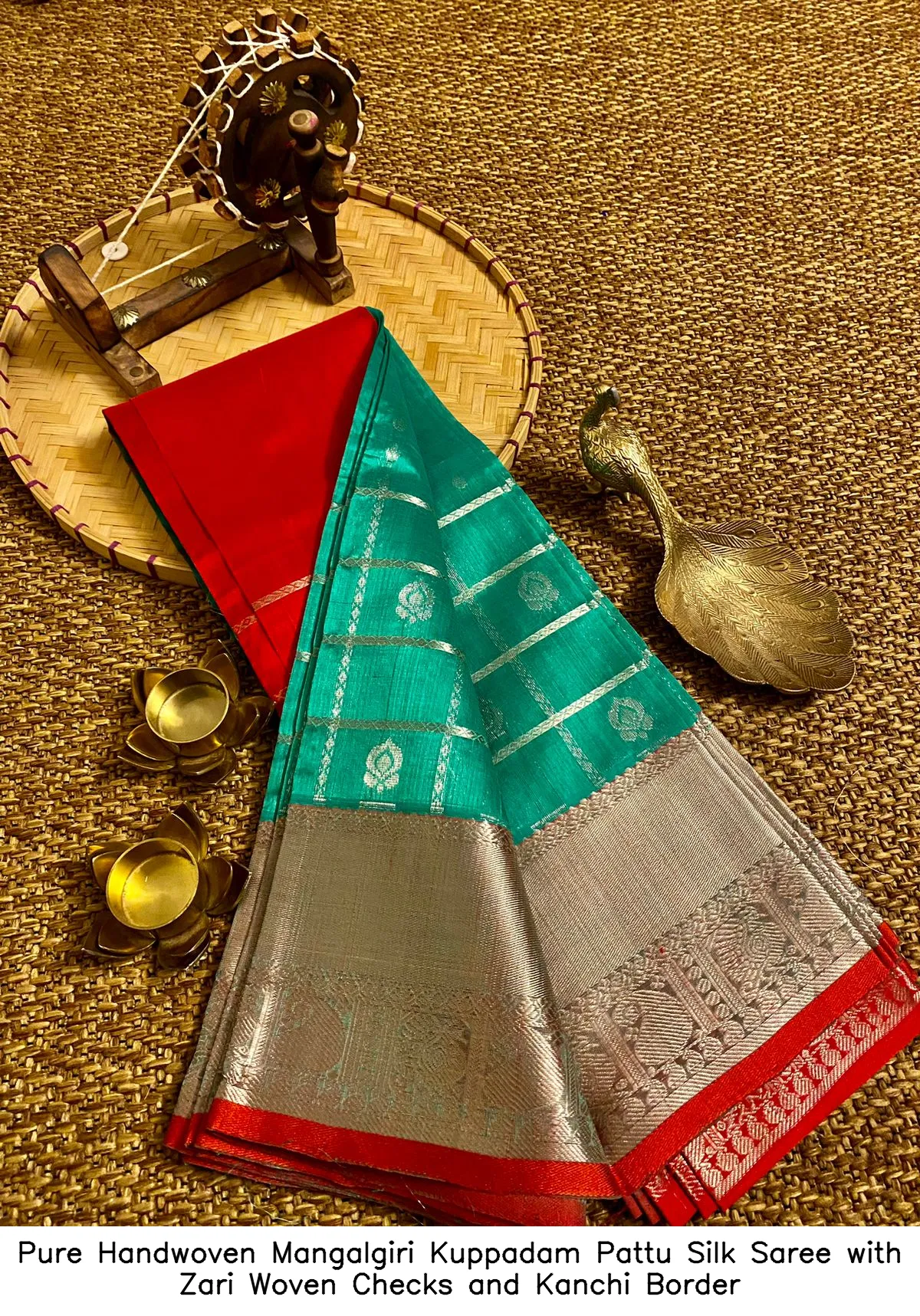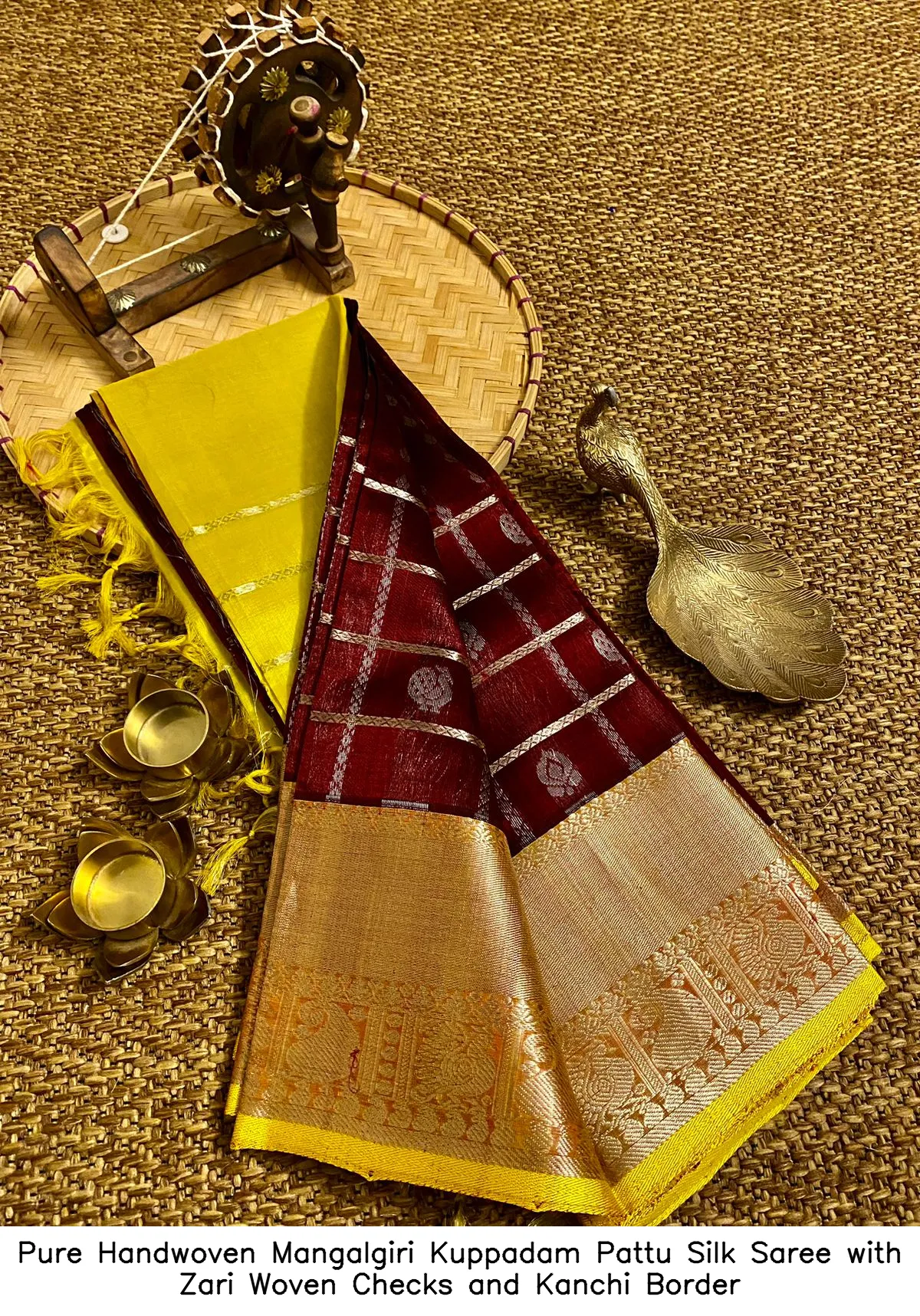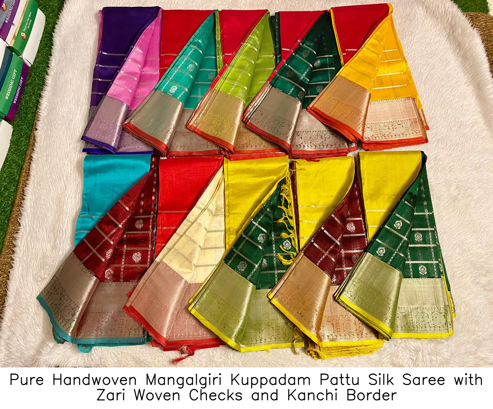 Product Name: Pure Handwoven Mangalgiri Kuppadam Pattu Silk Saree with Zari Woven Checks and Kanchi Border