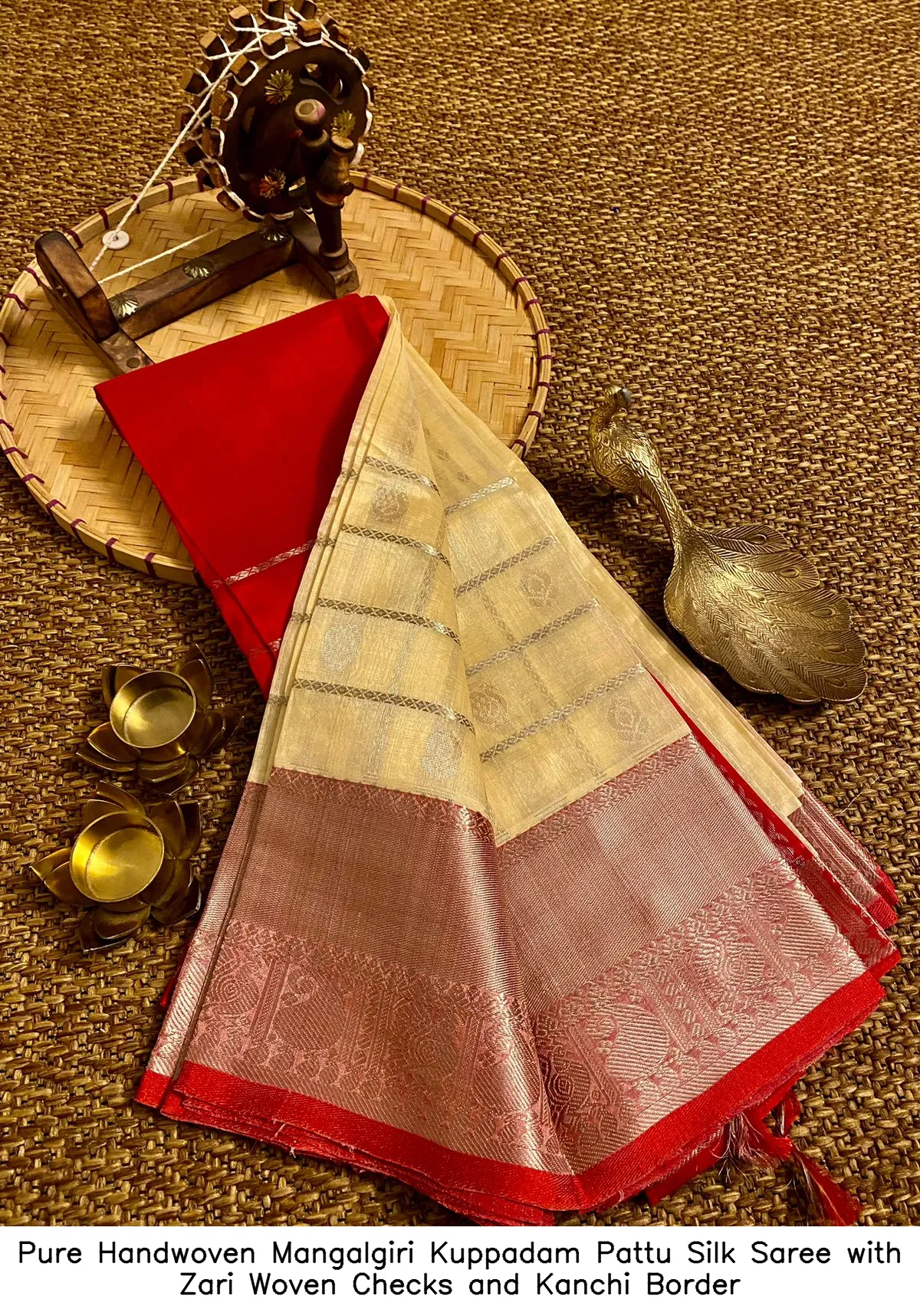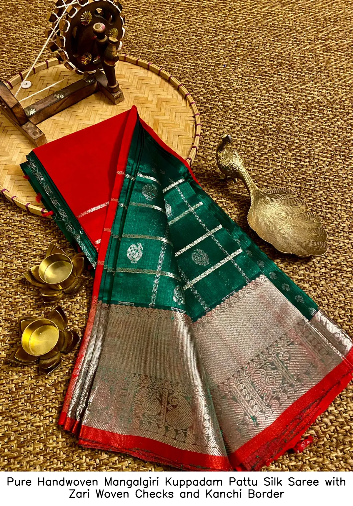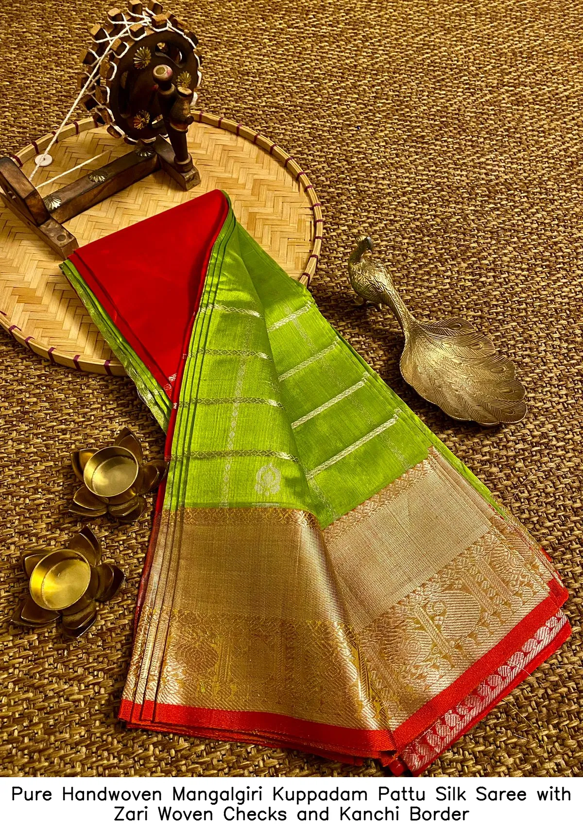 Pure Handwoven Mangalgiri Kuppadam Pattu Silk Saree with Zari Woven Checks and Kanchi Border