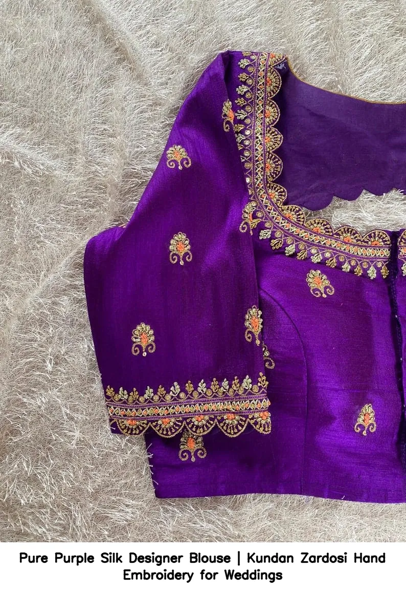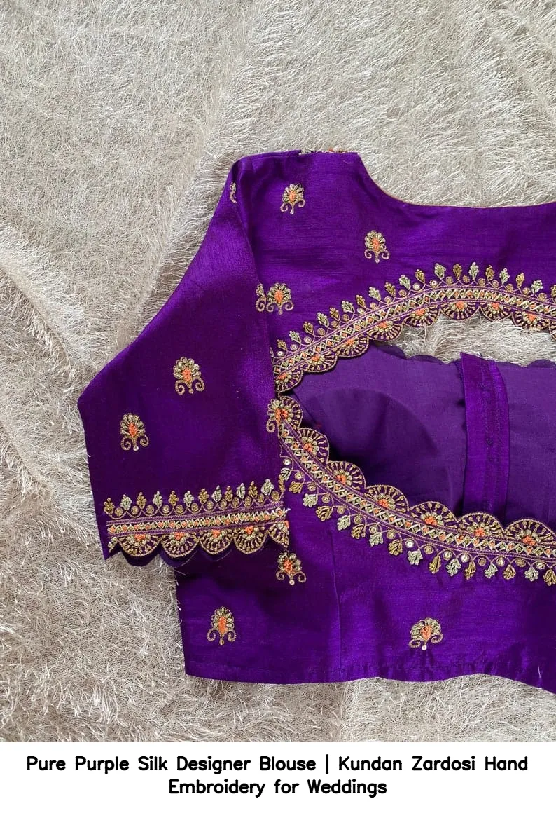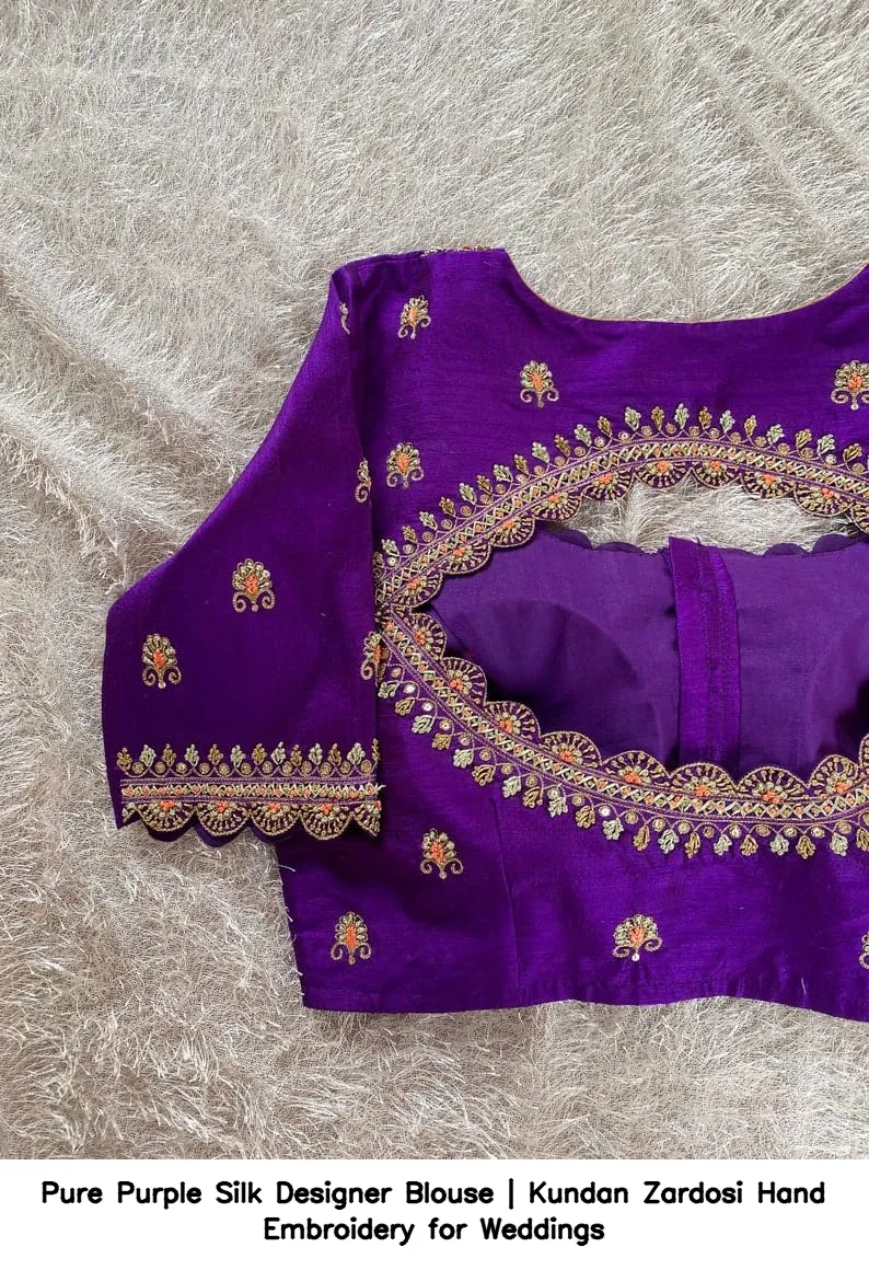 Why Choose Pure Purple Silk Designer Blouse | Kundan Zardosi Hand Embroidery for Weddings?