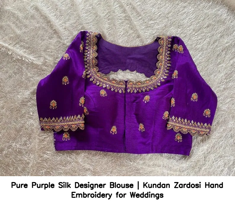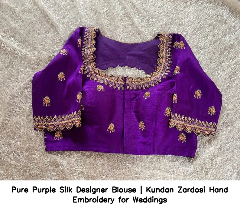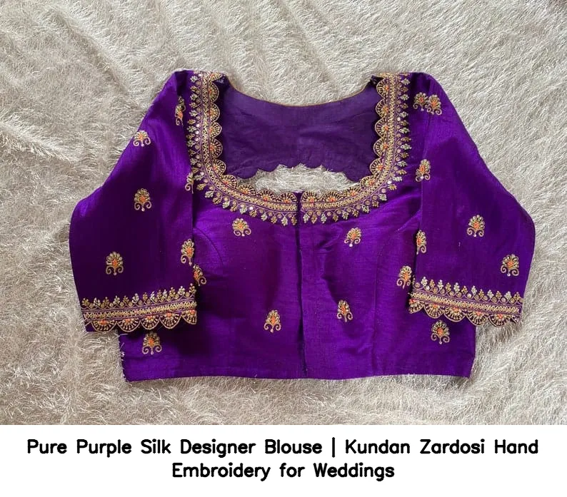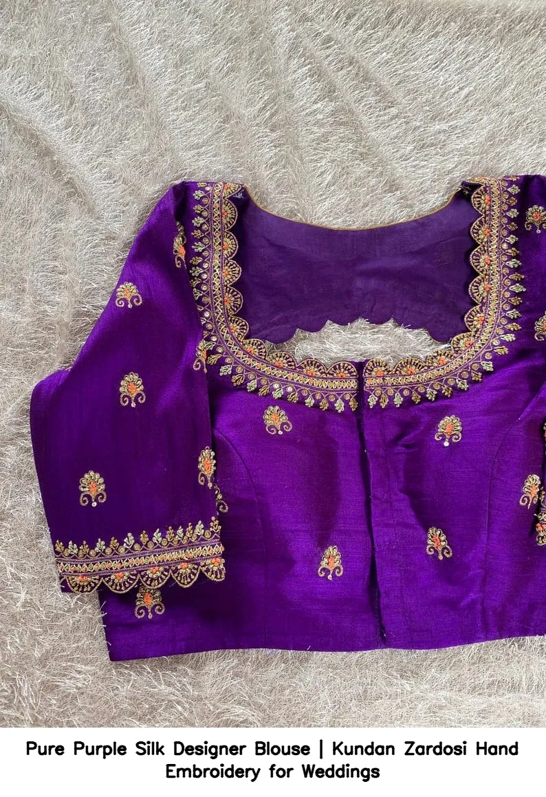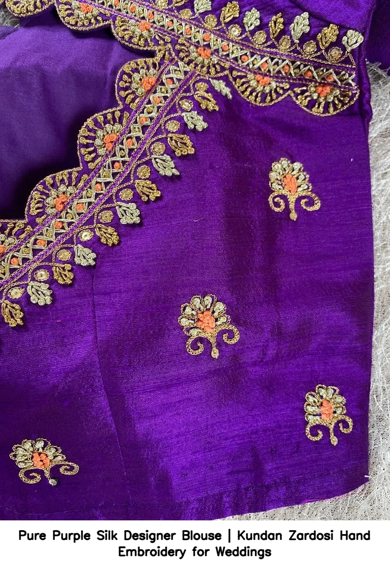 Why Choose Pure Purple Silk Designer Blouse | Kundan Zardosi Hand Embroidery for Weddings?