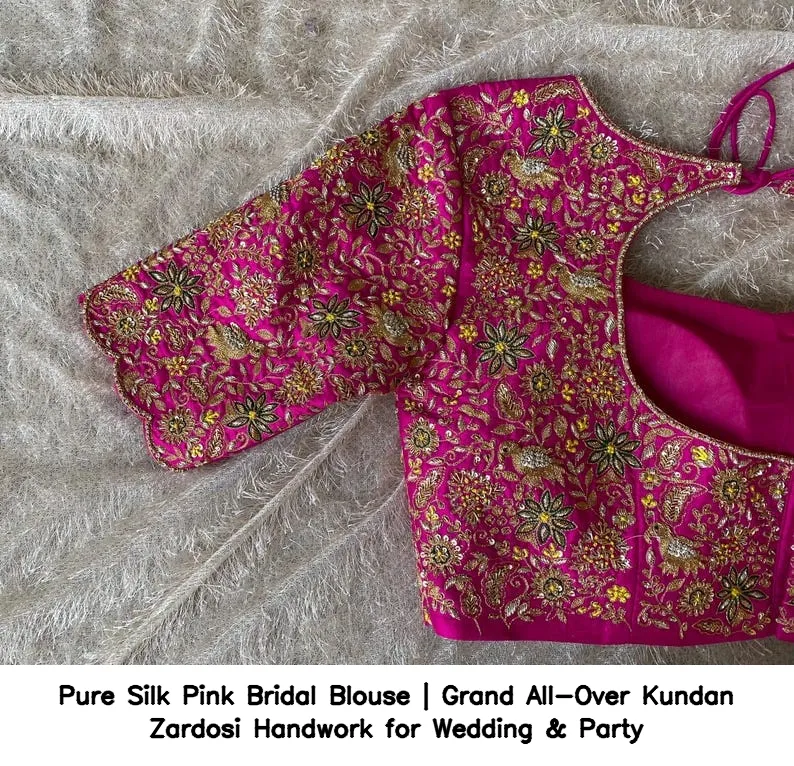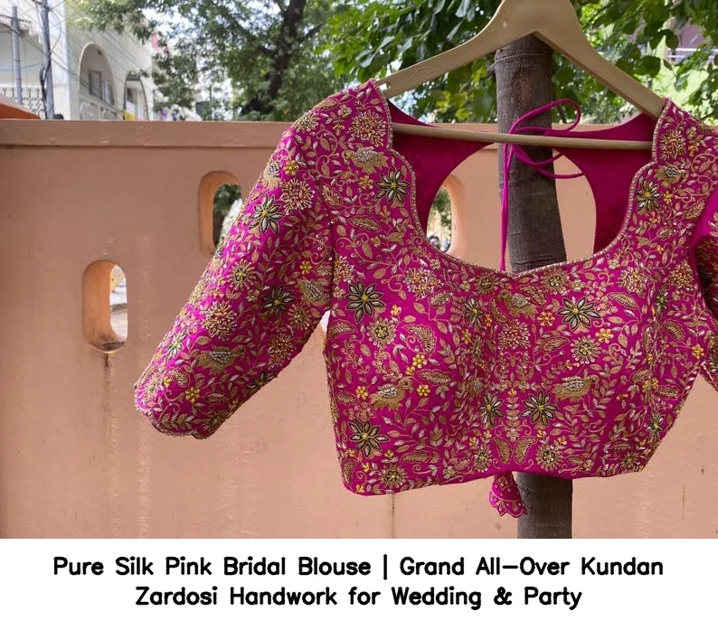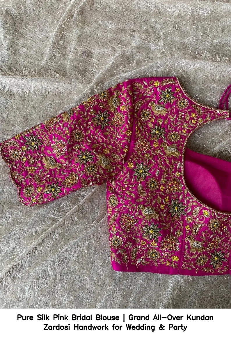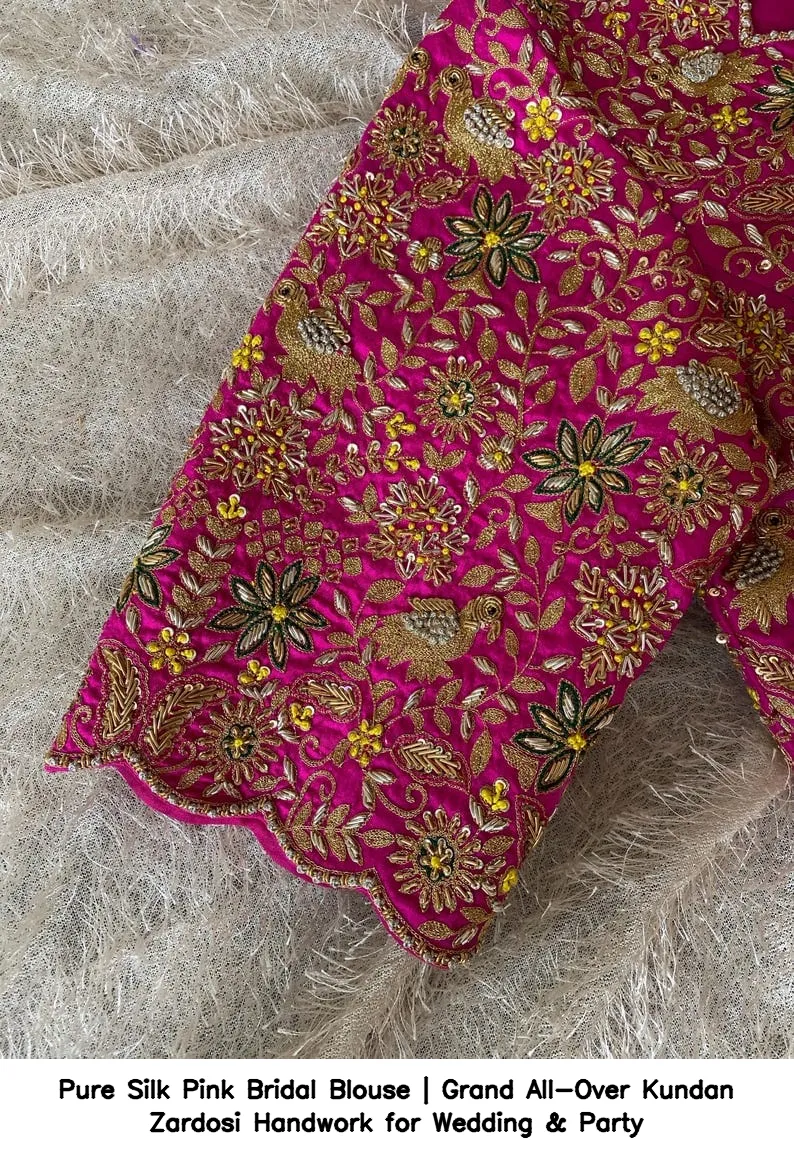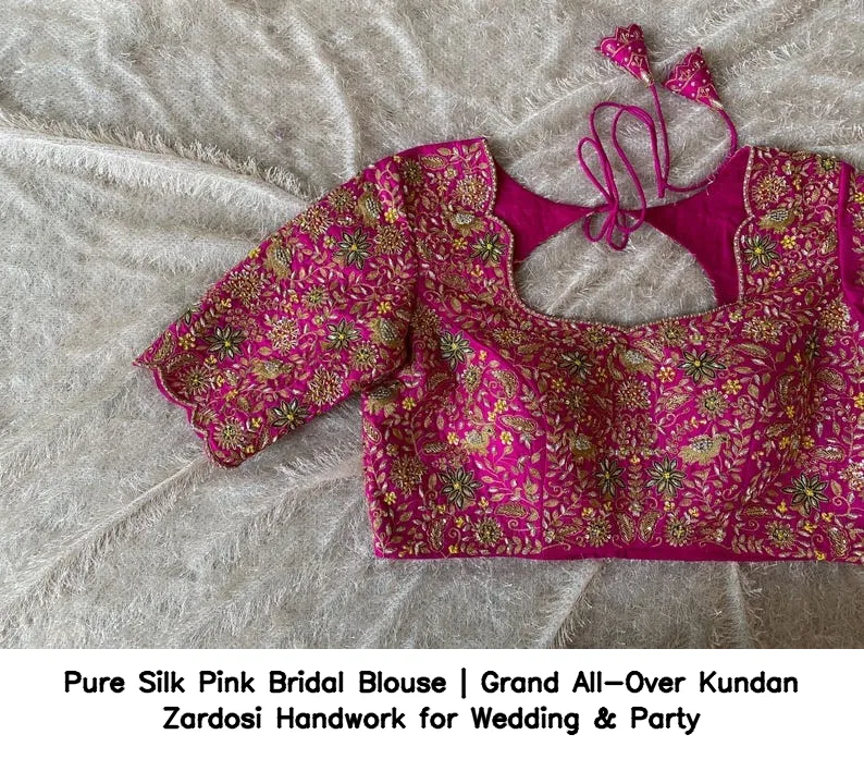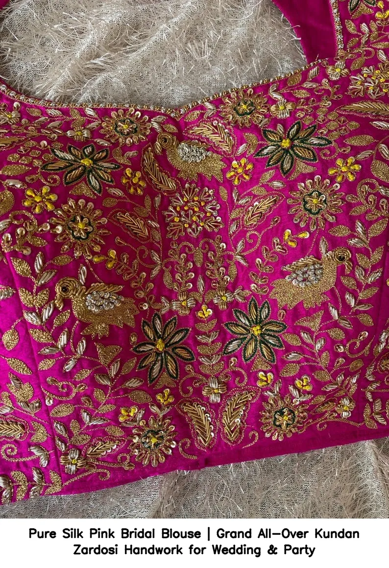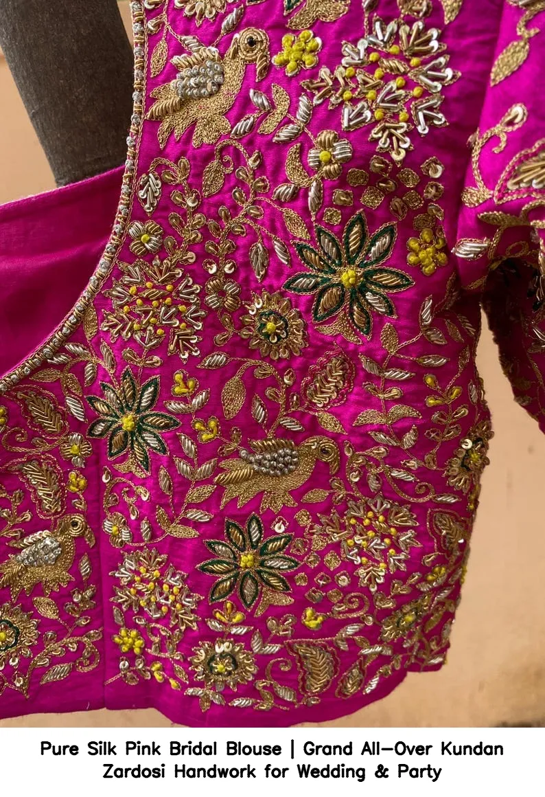 Pure Silk Pink Bridal Blouse | Grand All-Over Kundan Zardosi Handwork for Wedding & Party