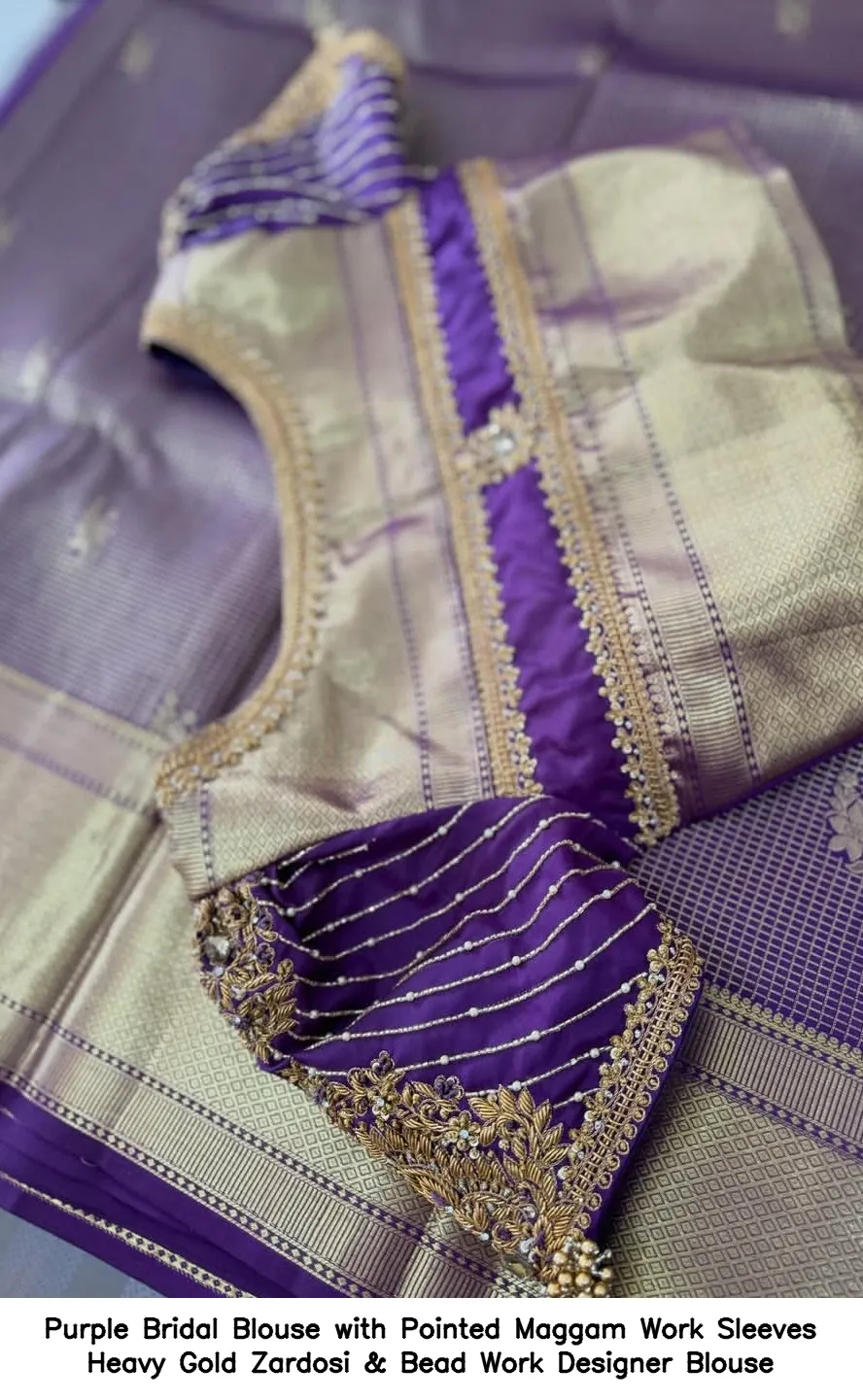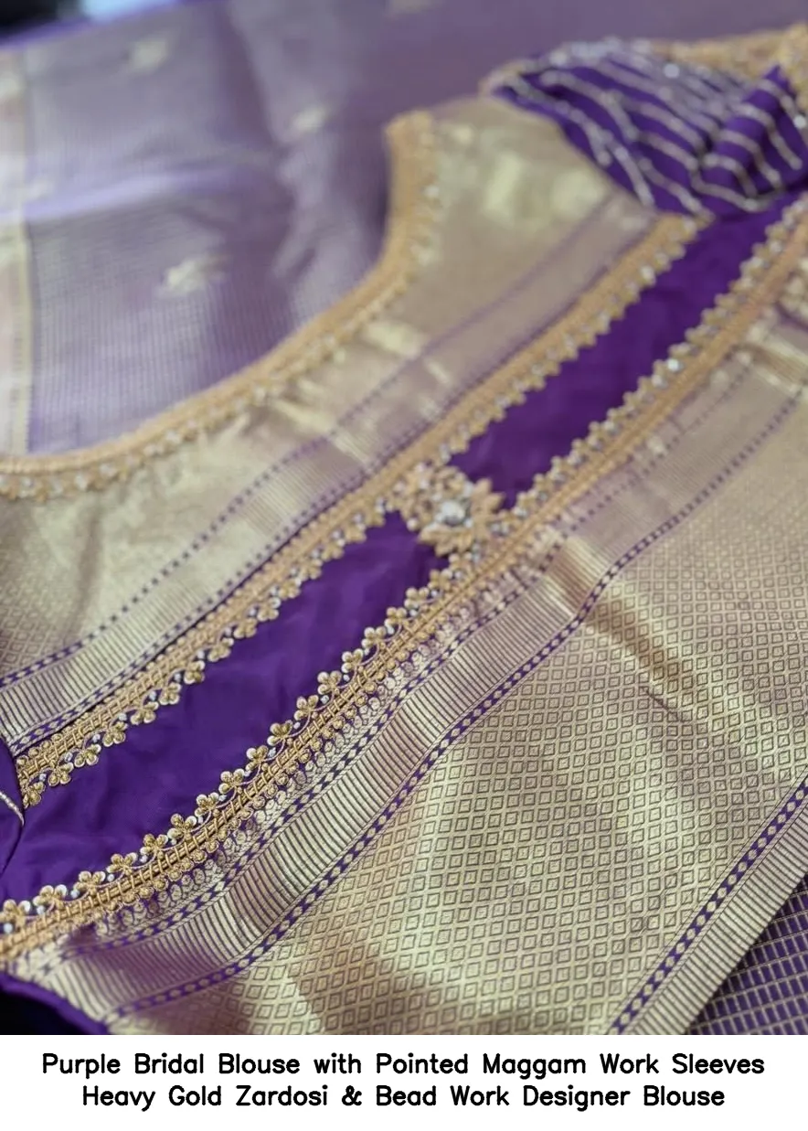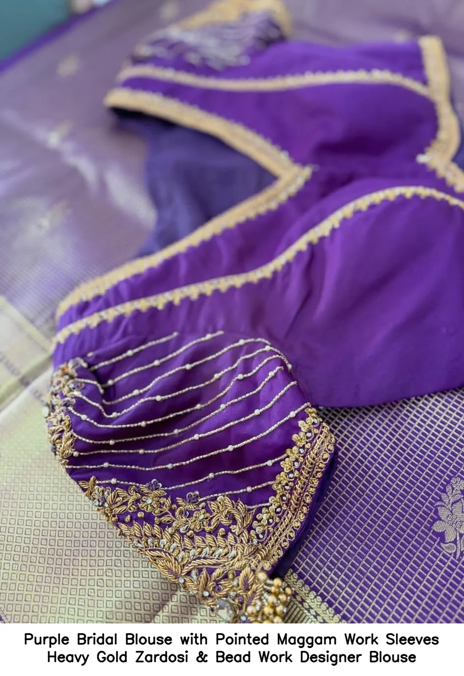 Purple Bridal Blouse with Pointed Maggam Work Sleeves – Heavy Gold Zardosi & Bead Work Designer Blouse