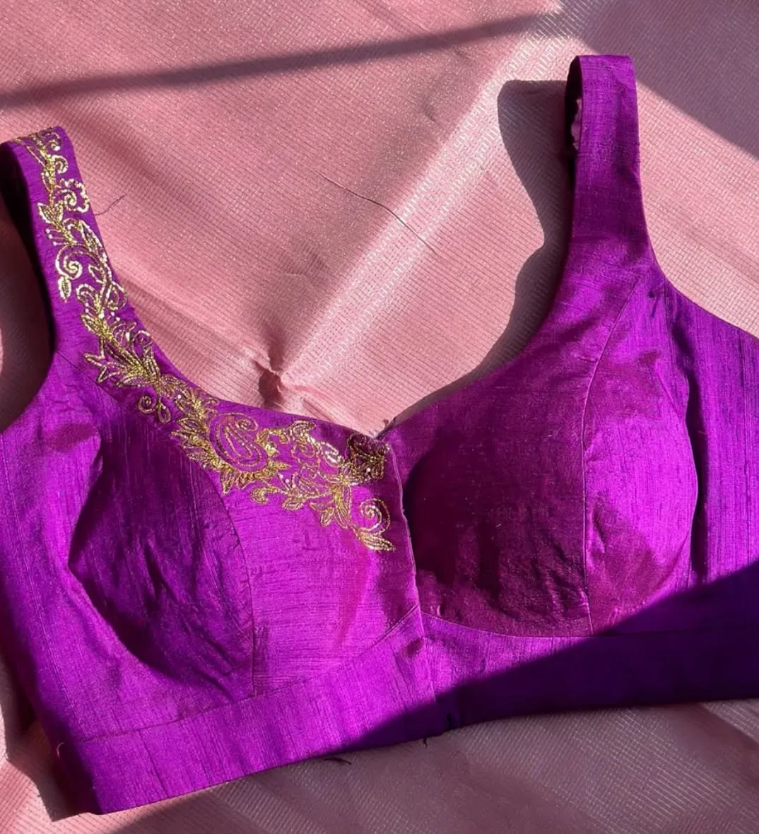 Stunning Pink Raw Silk with Maggam Work blouse. Crafted for bridal wear, pairs beautifully with silk sarees and lehengas.