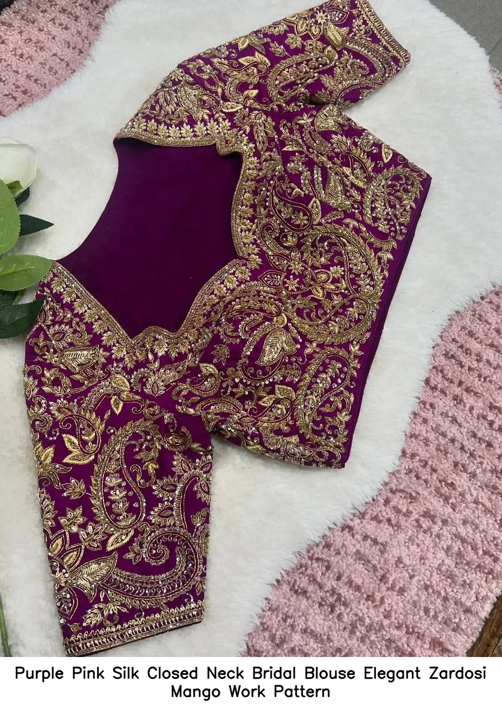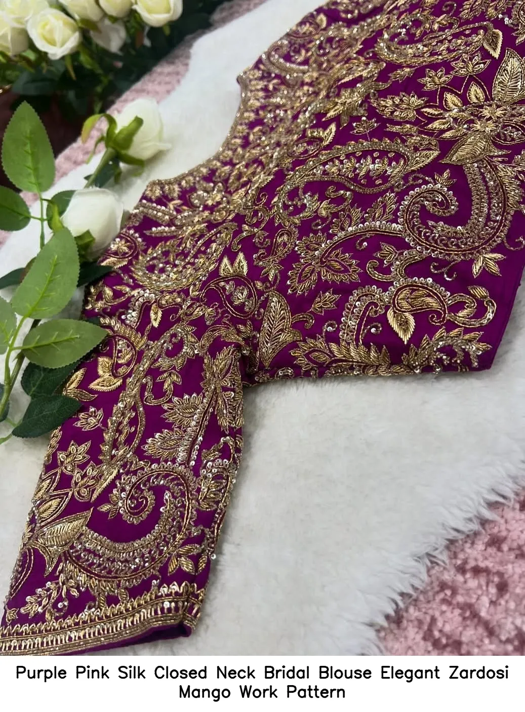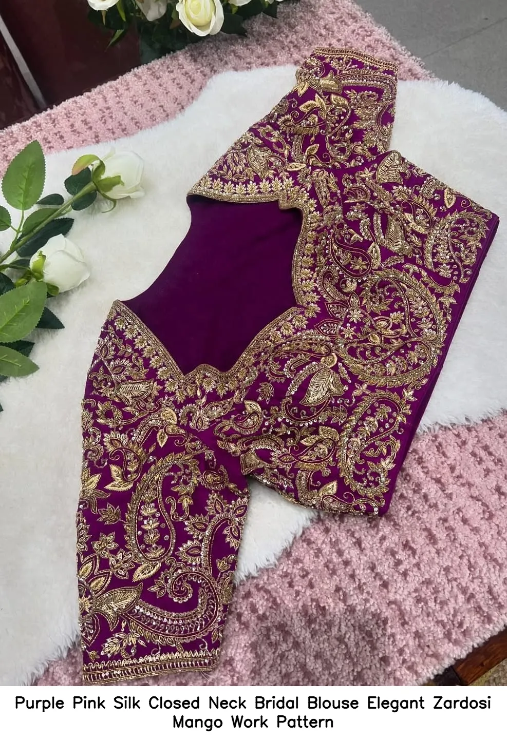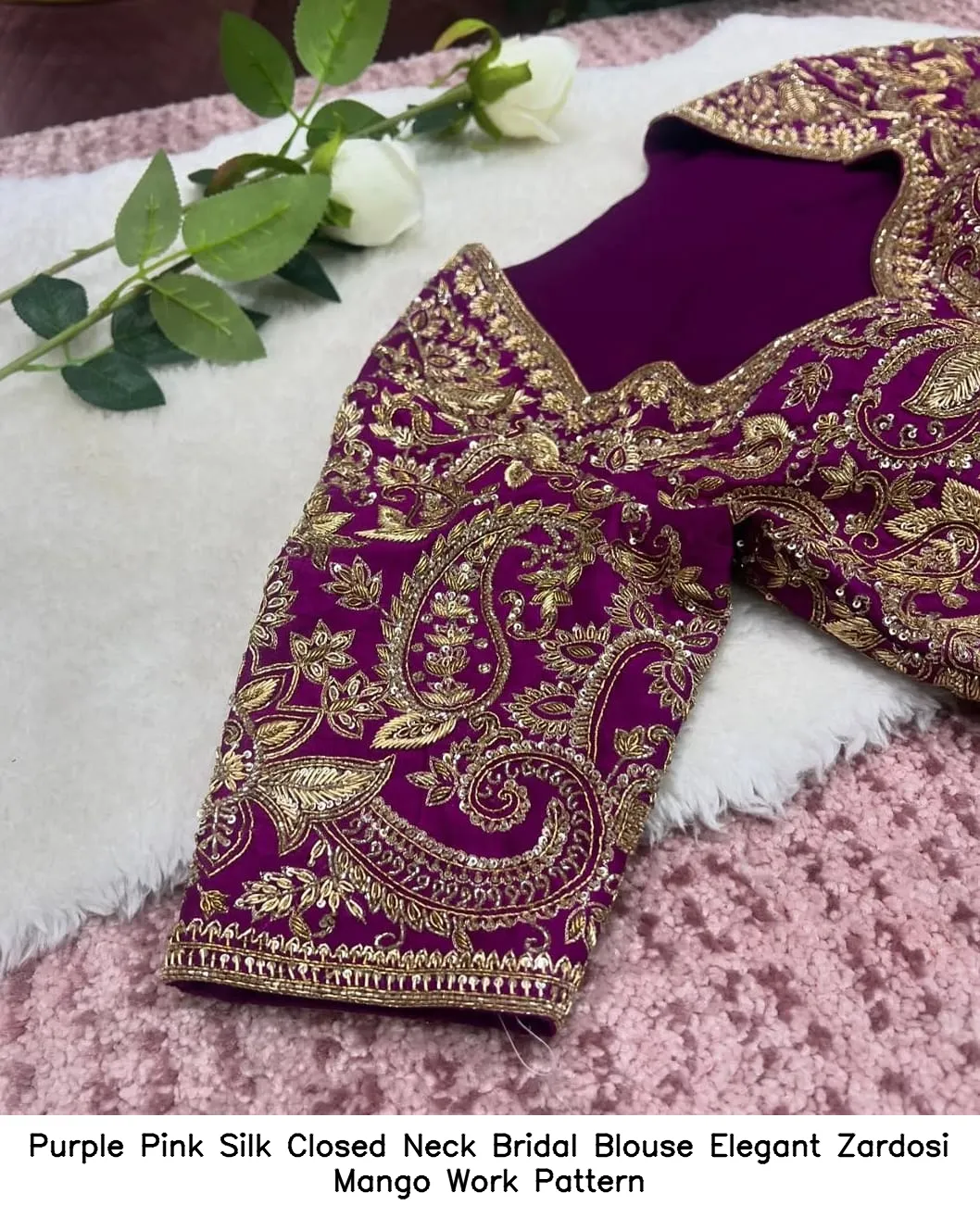 Why Choose Purple Pink Silk Closed Neck Bridal Blouse – Elegant Zardosi Mango Work Pattern?