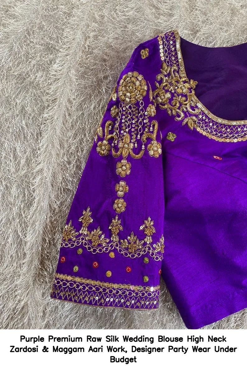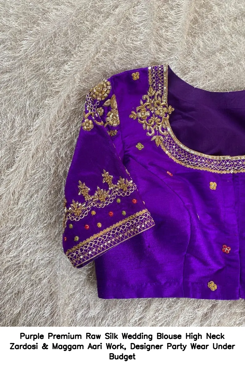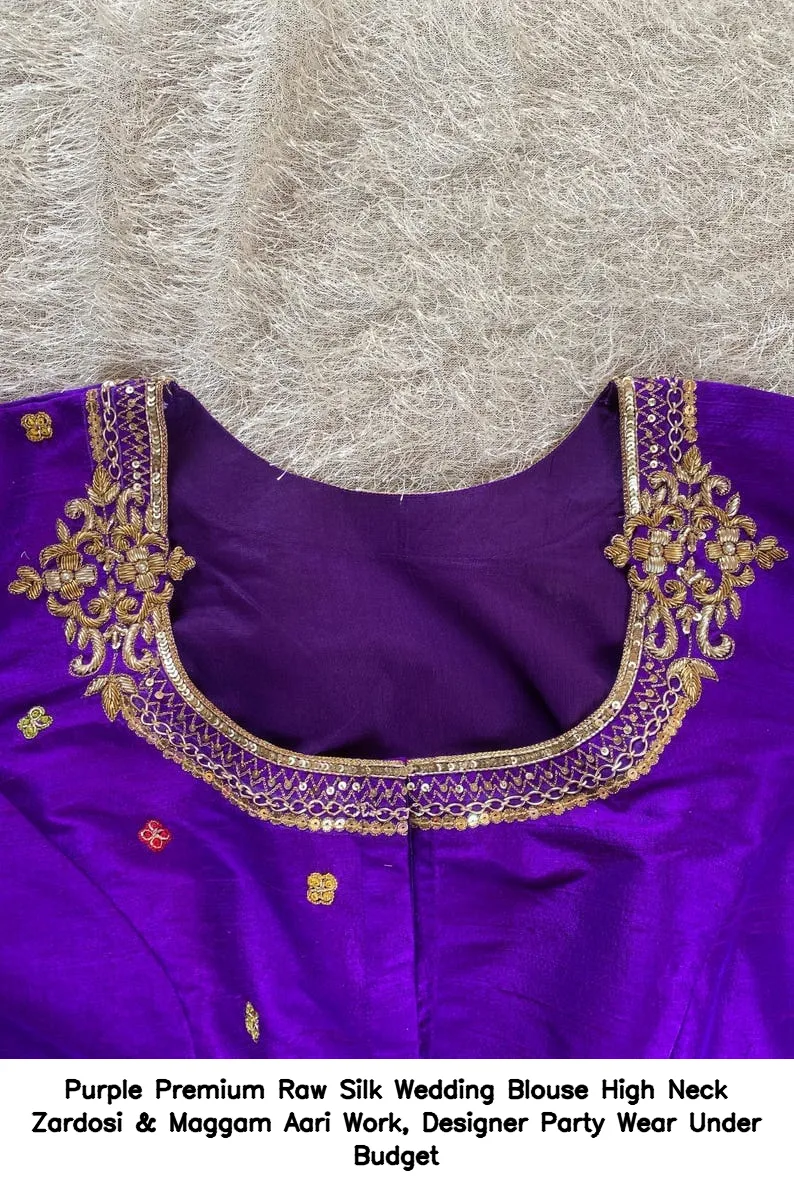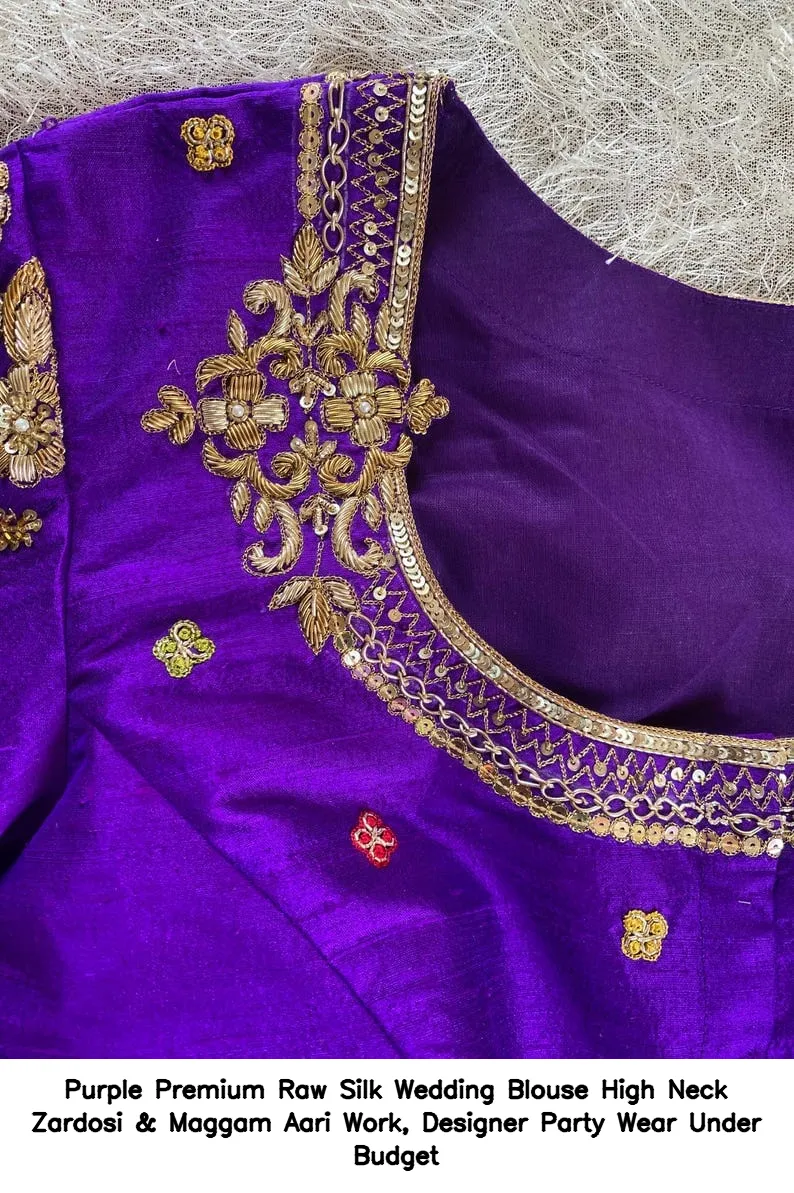 Purple Premium Raw Silk Wedding Blouse – High Neck Zardosi & Maggam Aari Work, Designer Party Wear Under Budget is an exquisite choice for your special occasions. This blouse combines elegance and affordability, making it a perfect addition to your wardrobe. Moreover, the intricate Zardosi and Maggam Aari work adds a touch of luxury, ensuring you stand out at any event.