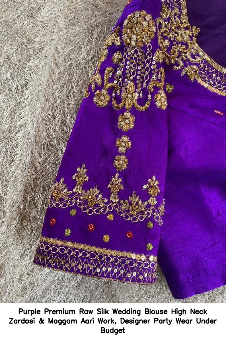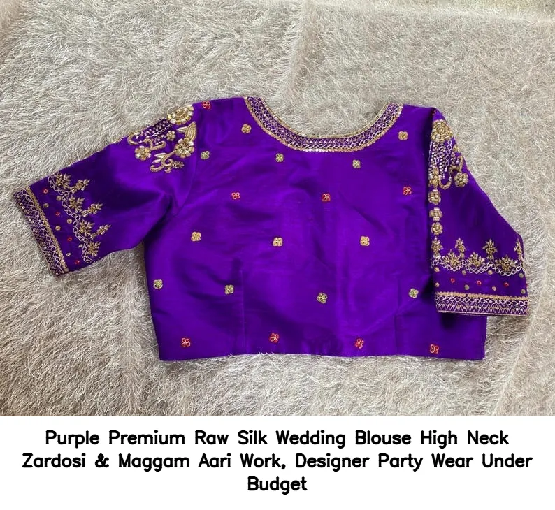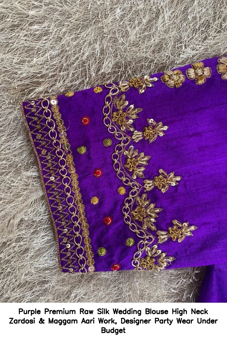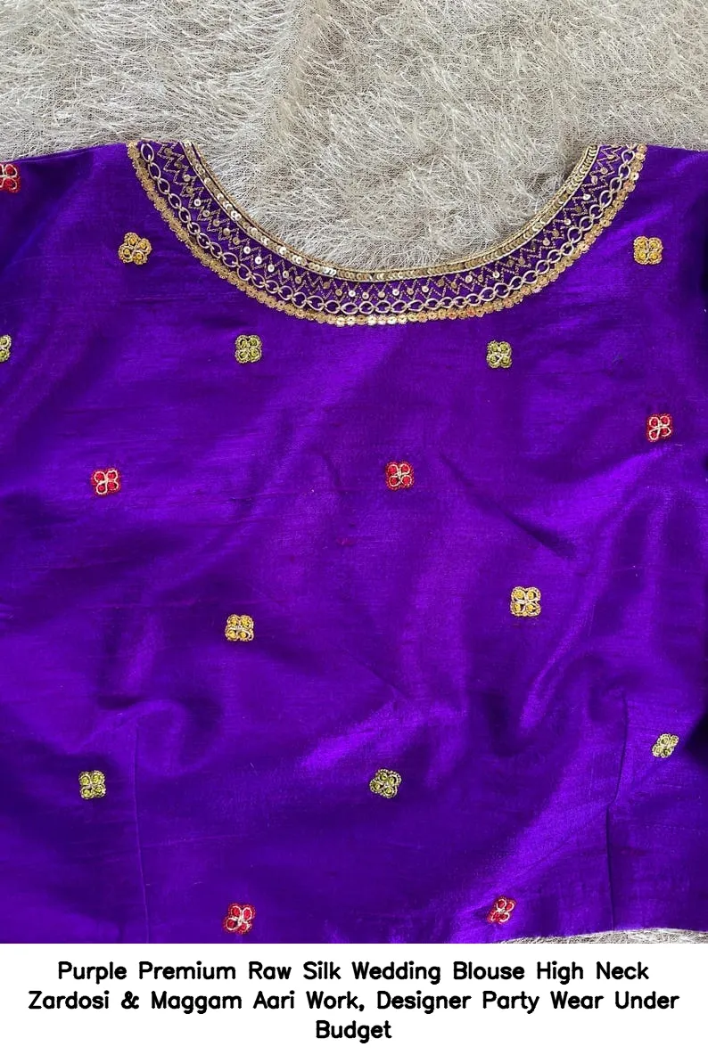 Purple Premium Raw Silk Wedding Blouse – High Neck Zardosi & Maggam Aari Work, Designer Party Wear Under Budget is an exquisite choice for your special occasions. This blouse combines elegance and affordability, making it a perfect addition to your wardrobe. Moreover, the intricate Zardosi and Maggam Aari work adds a touch of luxury, ensuring you stand out at any event.
