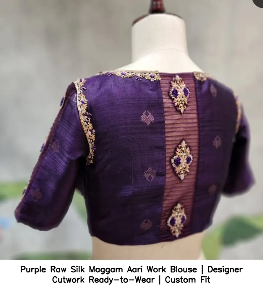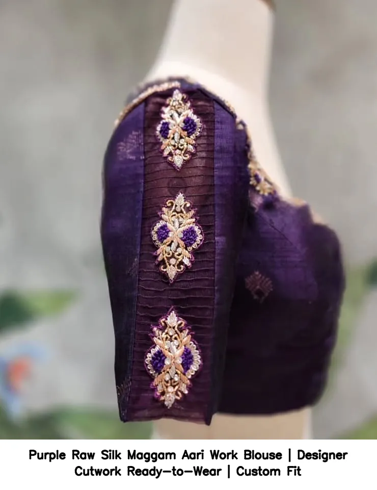 Purple Raw Silk Maggam Aari Work Blouse | Designer Cutwork Ready-to-Wear | Custom Fit Features and Benefits