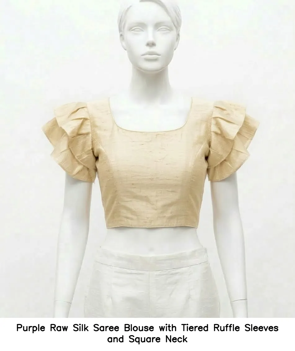 The Purple Raw Silk Saree Blouse with Tiered Ruffle Sleeves and Square Neck is designed to impress. It is made from high-quality half pattu fabric, ensuring both comfort and style. Priced at just 800 INR, this blouse is an affordable luxury.