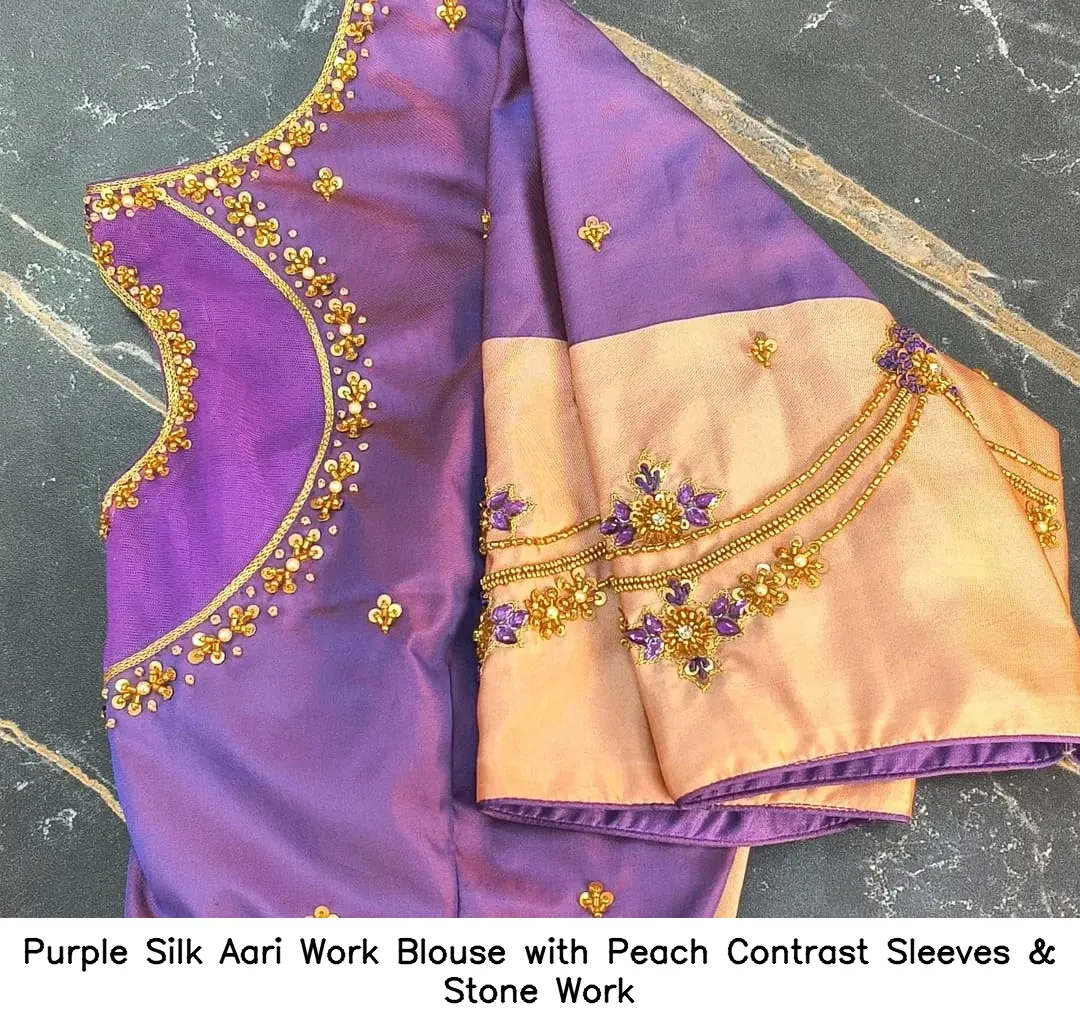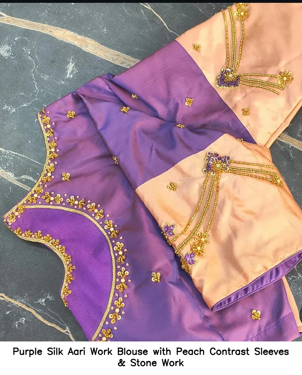 Purple Silk Aari Work Blouse with Peach Contrast Sleeves & Stone Work