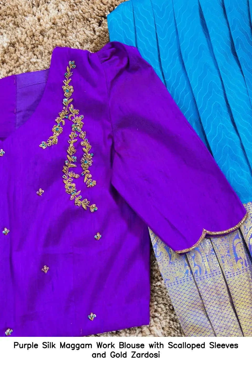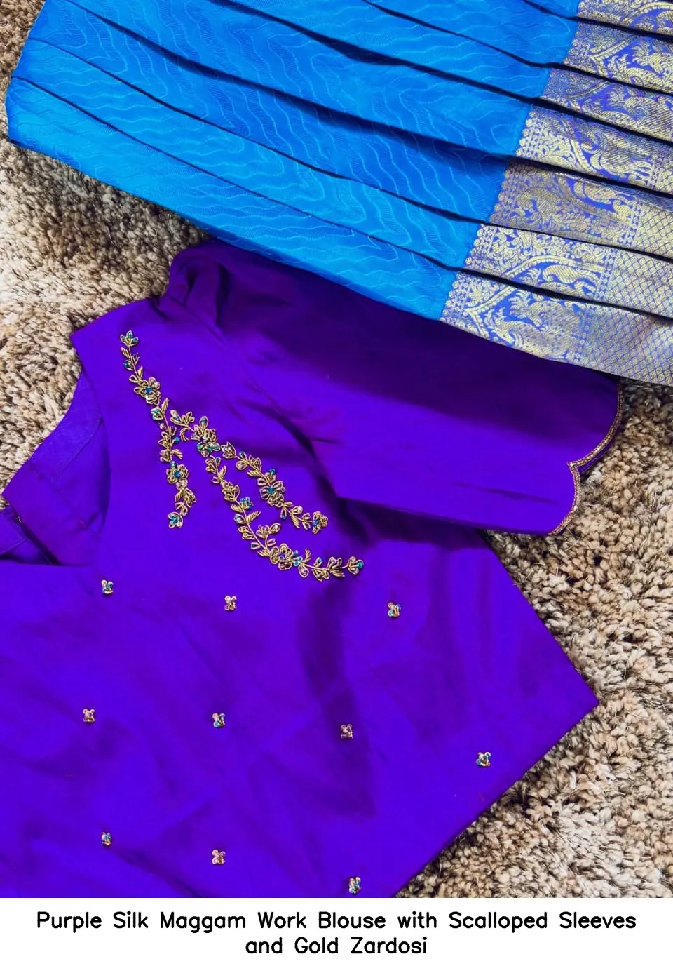 ​​Purple Silk Maggam Work Blouse with Scalloped Sleeves and Gold Zardosi