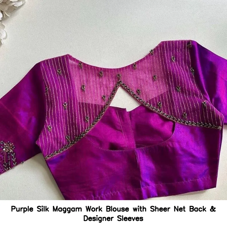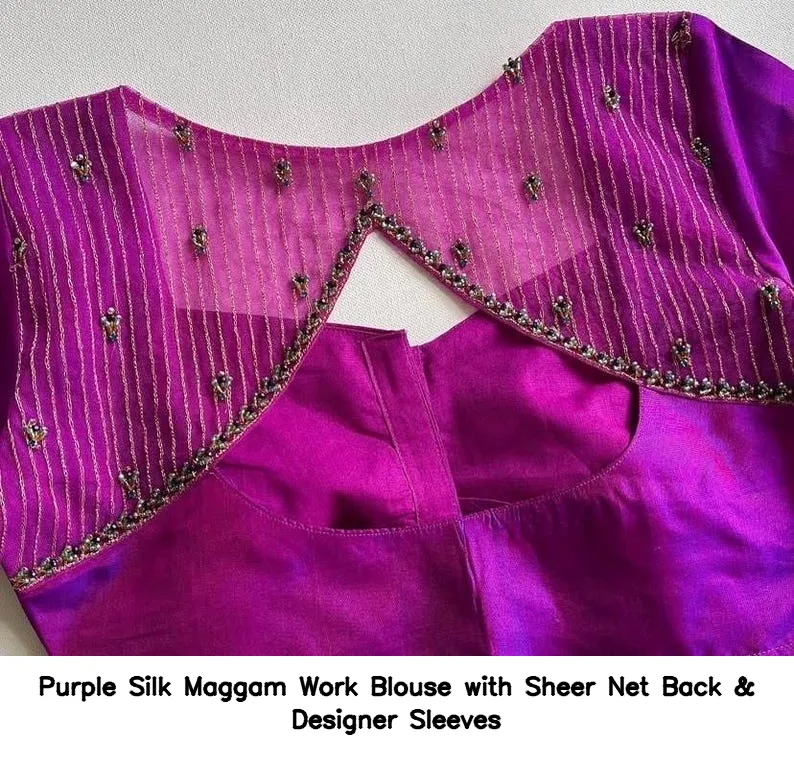 Product Name: Purple Silk Maggam Work Blouse with Sheer Net Back & Designer Sleeves