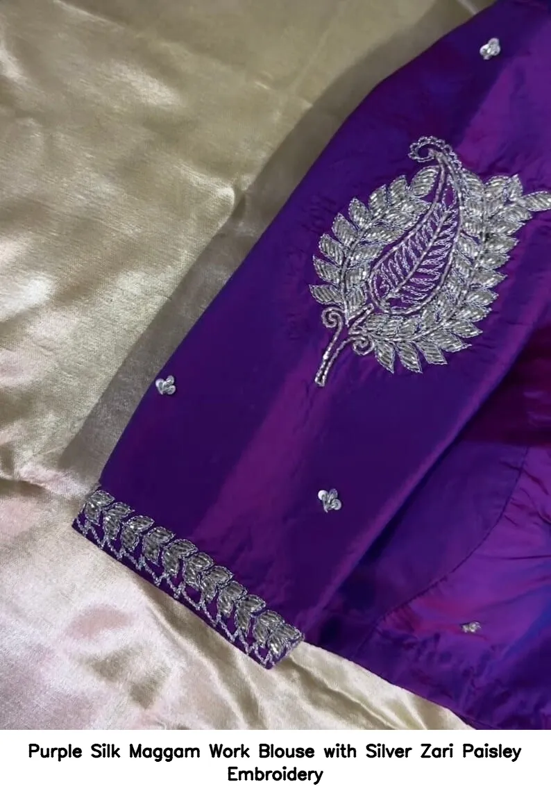Purple Silk Maggam Work Blouse with Silver Zari Paisley Embroidery