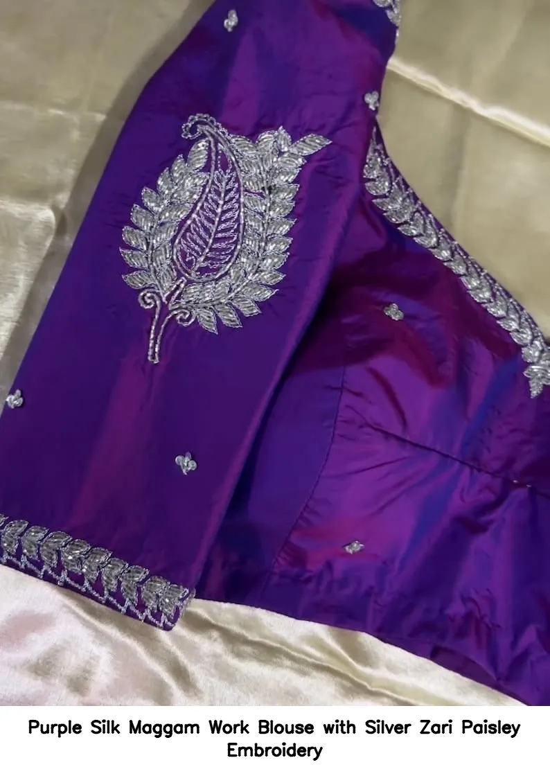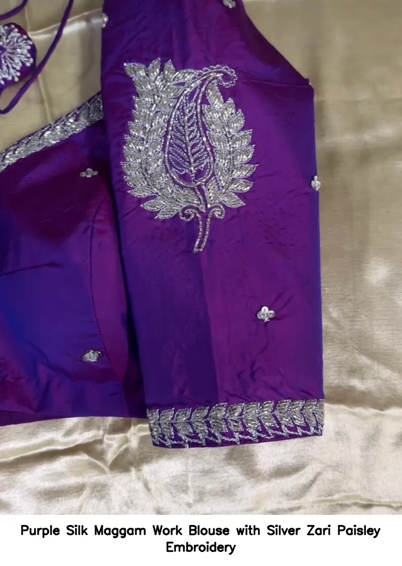 ​​​​​​​Purple Silk Maggam Work Blouse with Silver Zari Paisley Embroidery