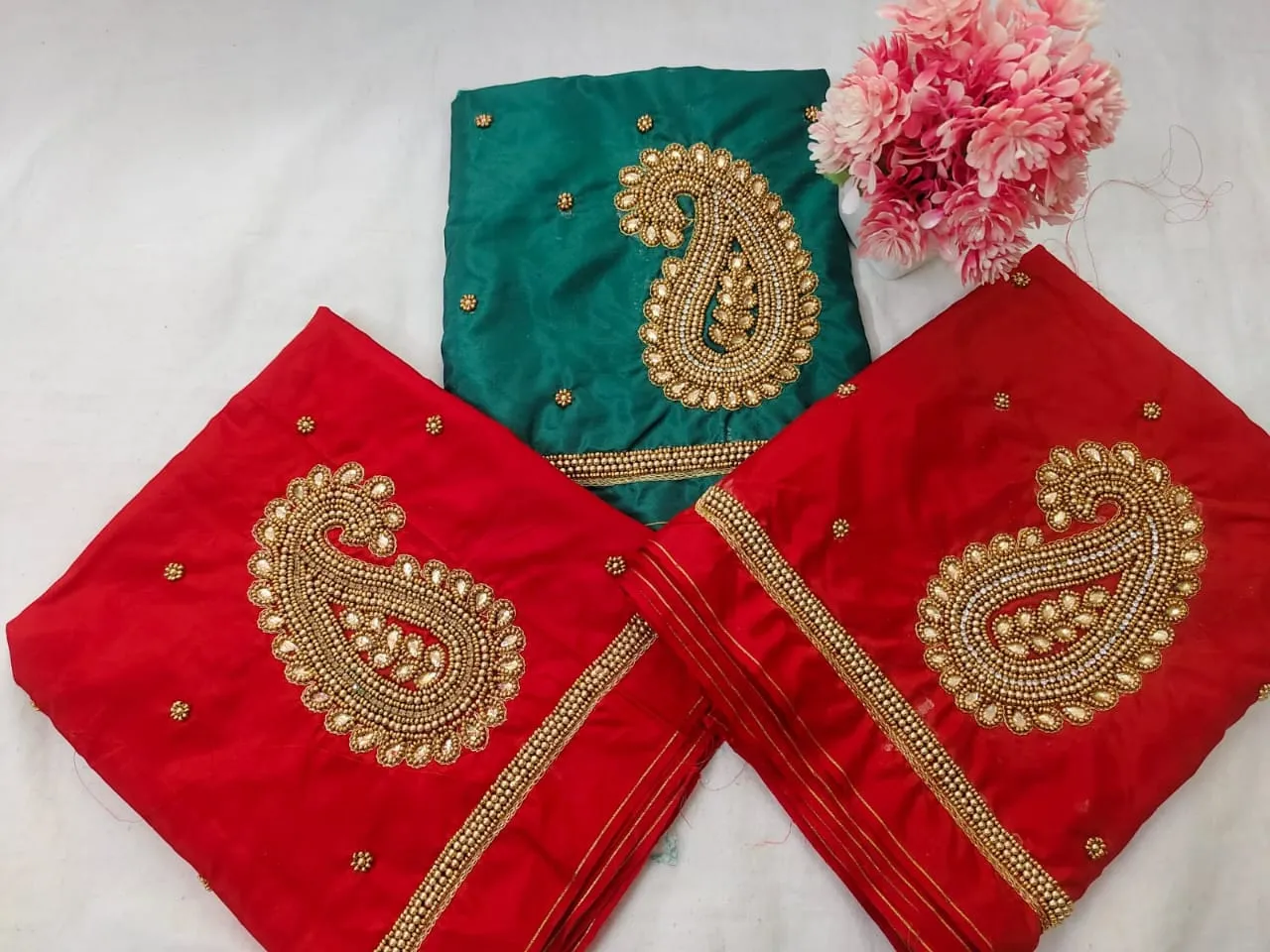 The fabric details include raw silk and cotton silk. Available sizes are 32, 34, 36, 38, 40, 42, 44, and 46. The blouse comes in various colors such as blue, black, red, green, pink, yellow, lavender, and gold. For more options, browse our collection.