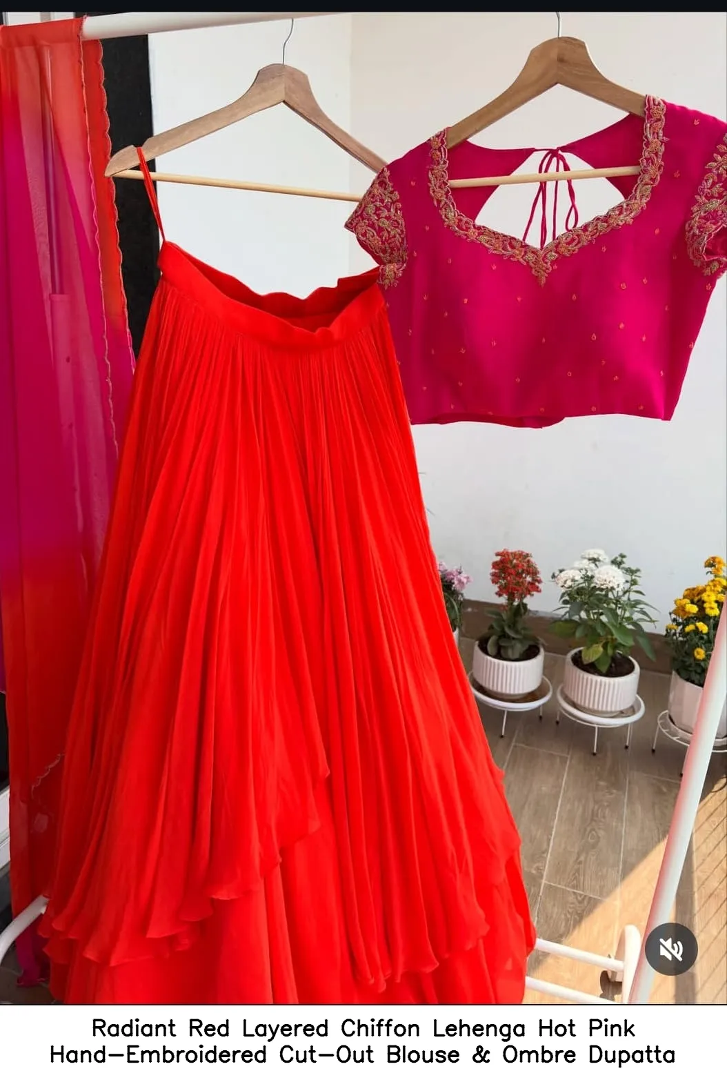Radiant Red Layered Chiffon Lehenga – Hot Pink Hand-Embroidered Cut-Out Blouse & Ombre Dupatta