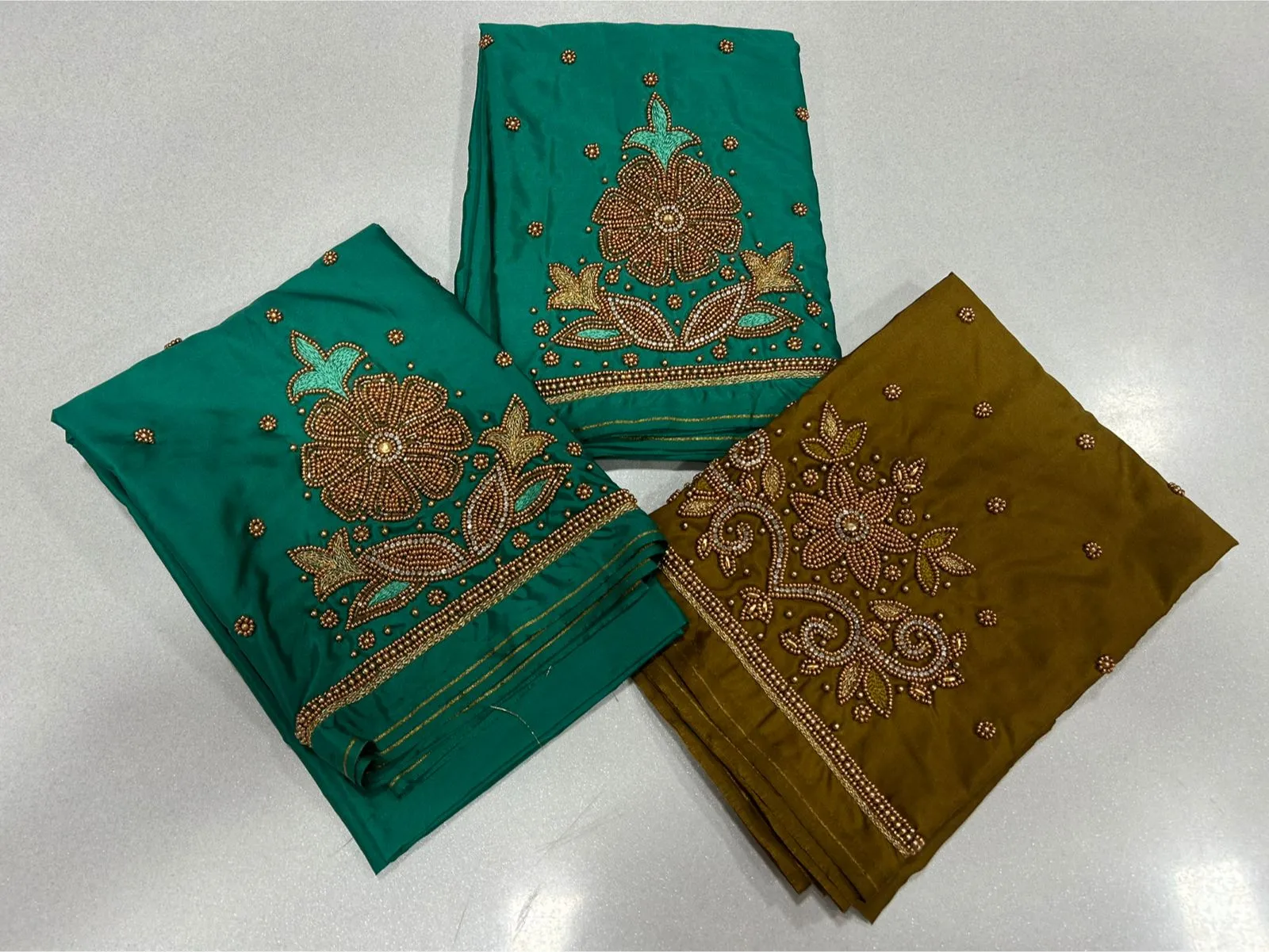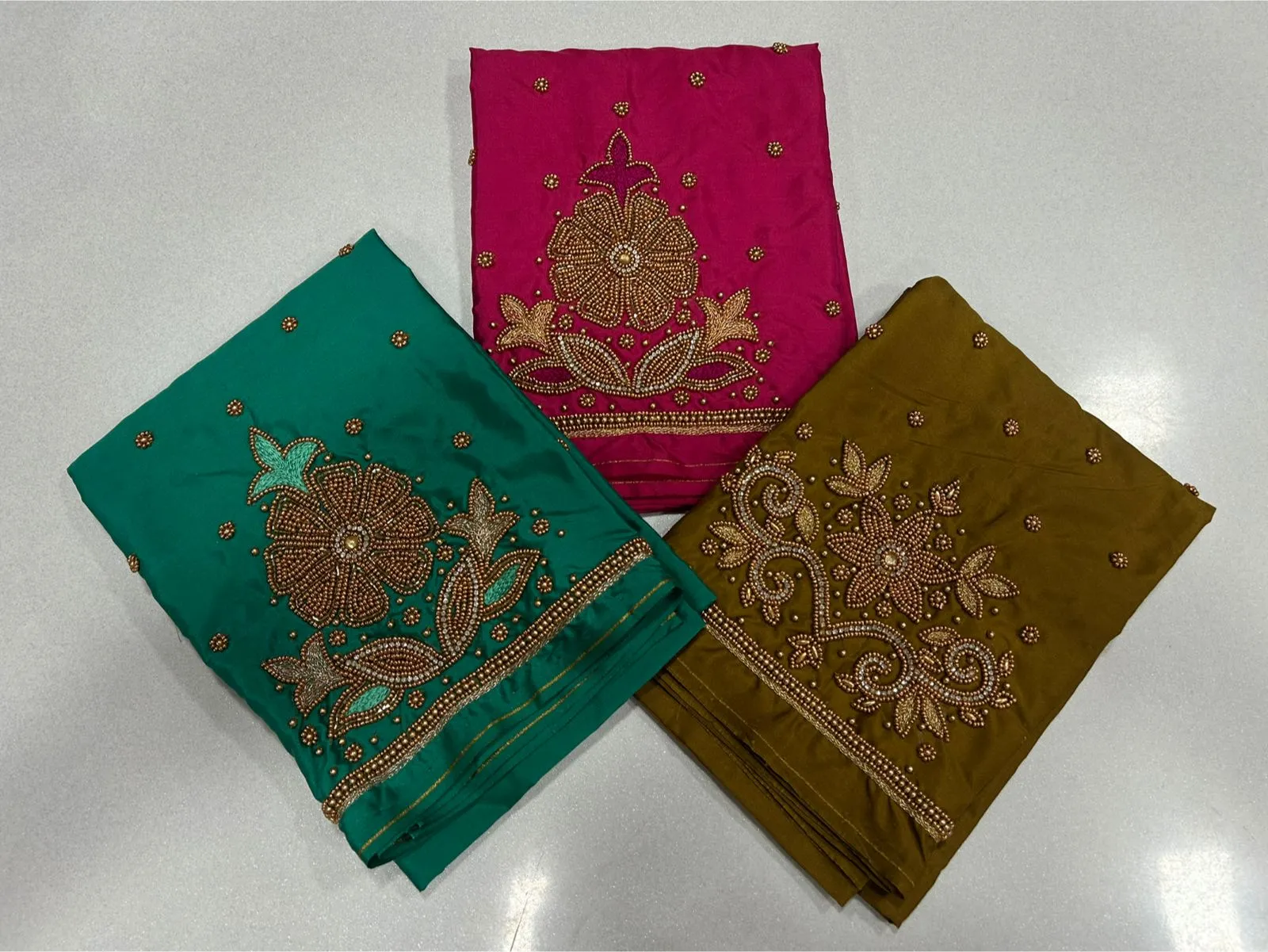 Stunning Green Raw Silk with Aari Work blouse. Crafted for wedding and festive wear, pairs beautifully with silk sarees and lehengas.