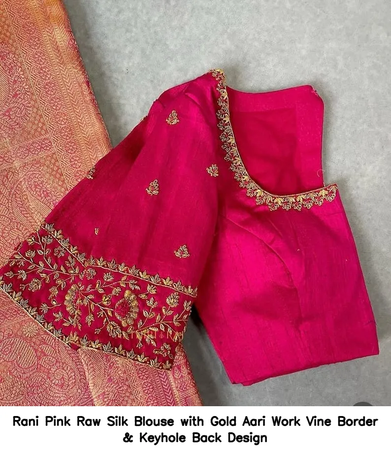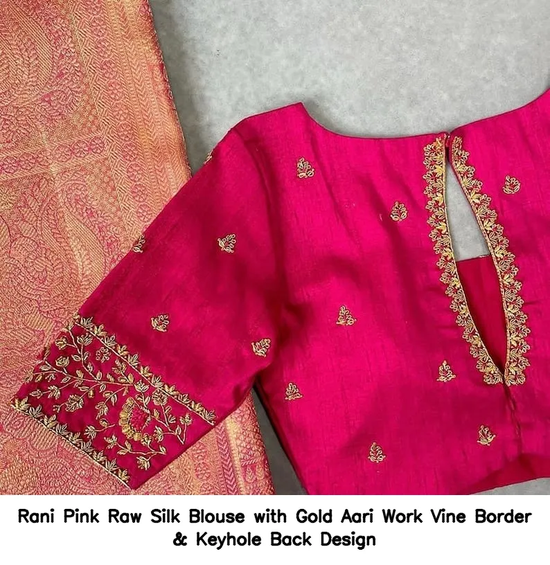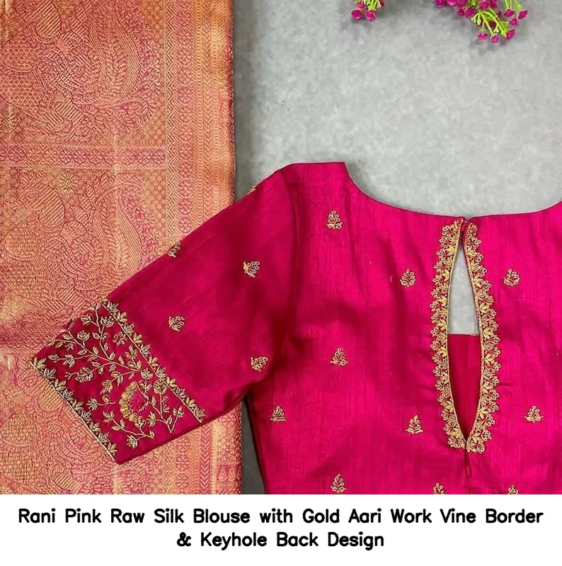 Rani Pink Raw Silk Blouse with Gold Aari Work Vine Border & Keyhole Back Design
