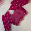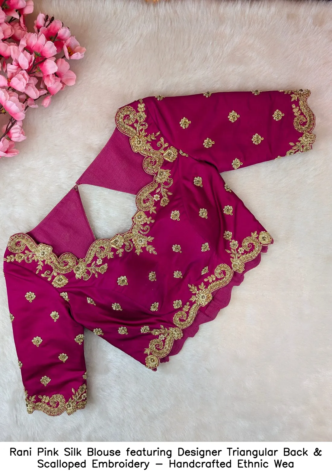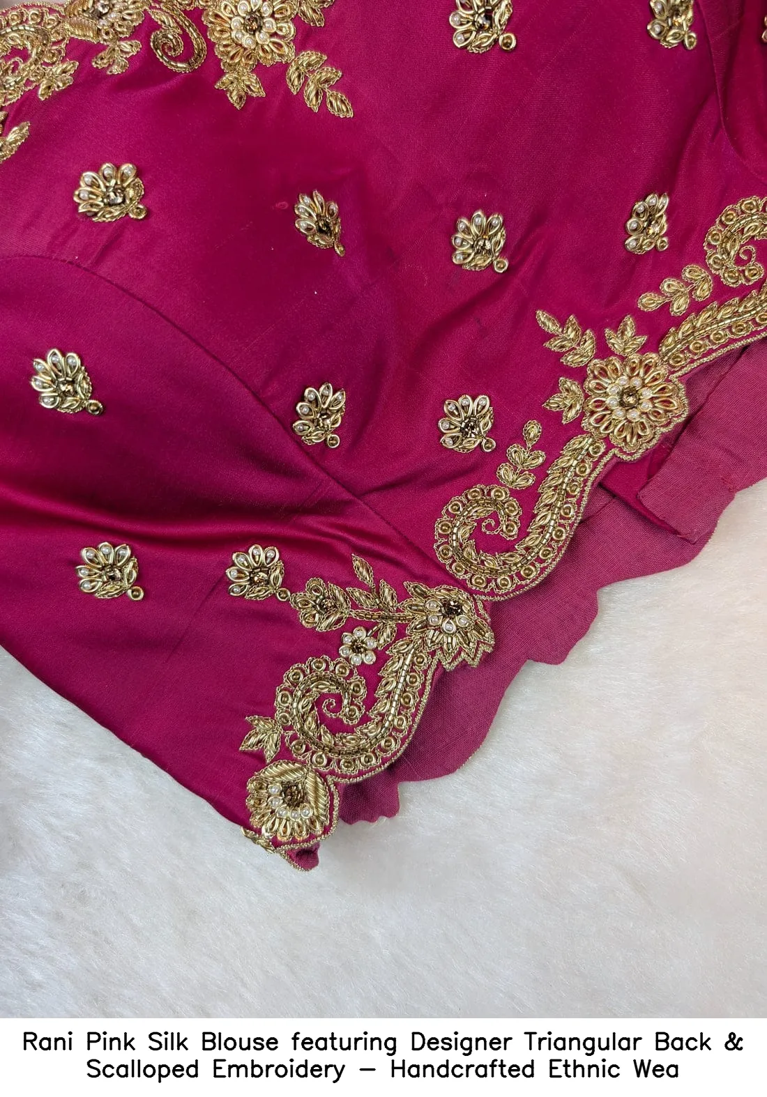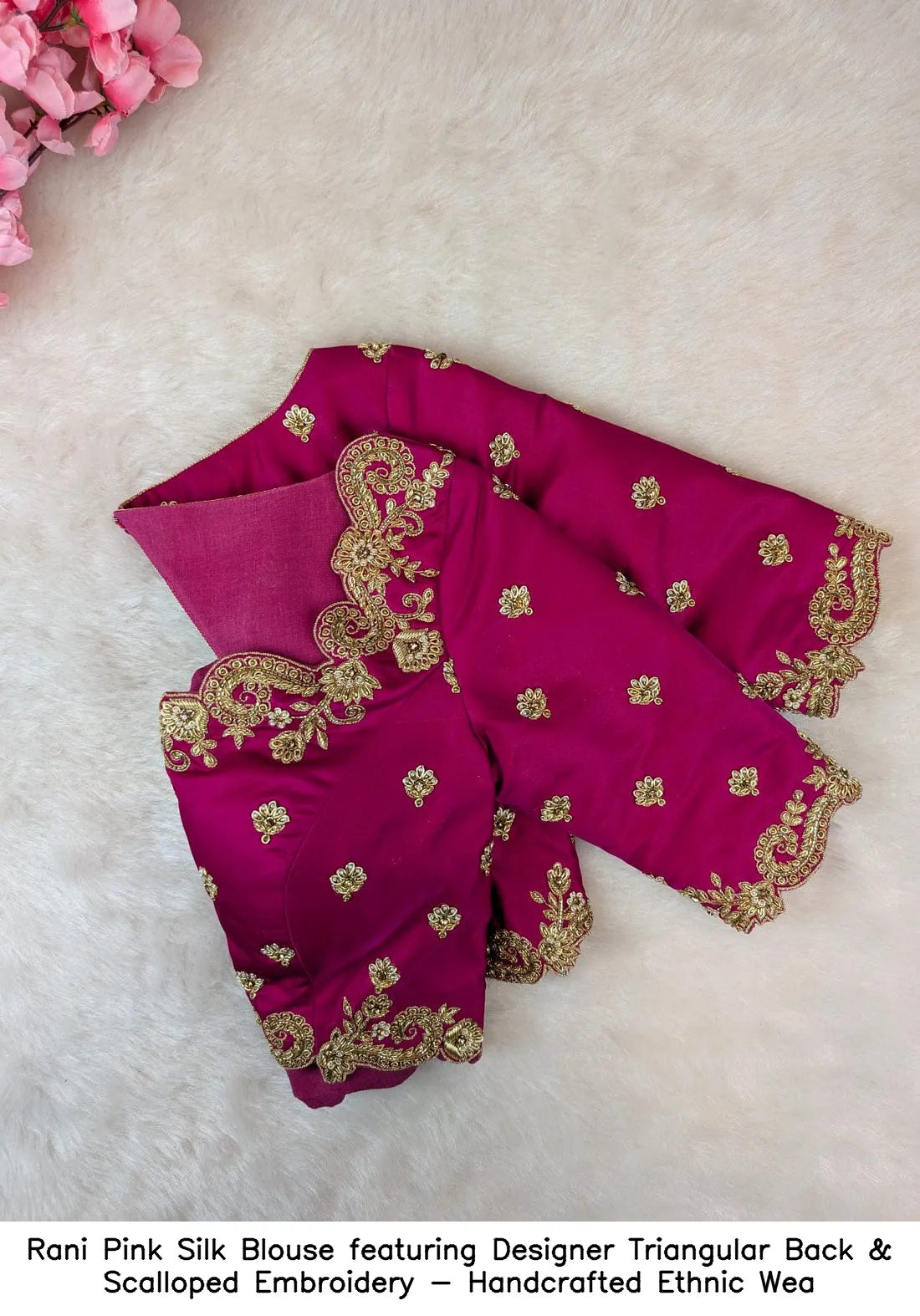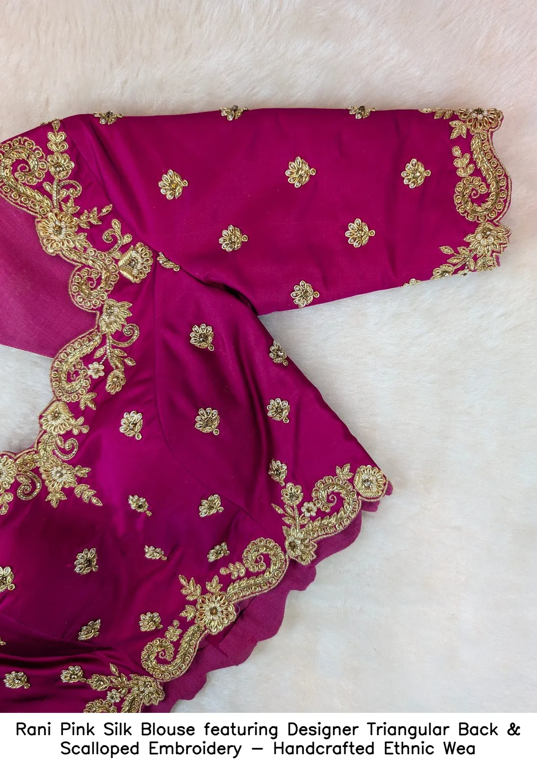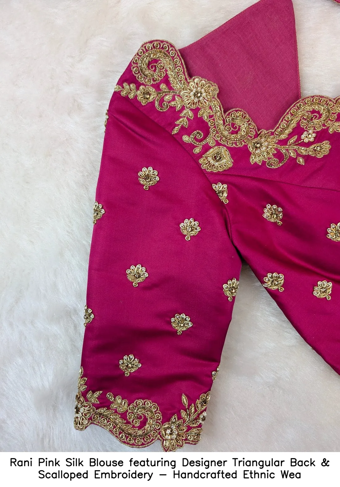 Rani Pink Silk Blouse featuring Designer Triangular Back & Scalloped Embroidery – Handcrafted Ethnic Wea