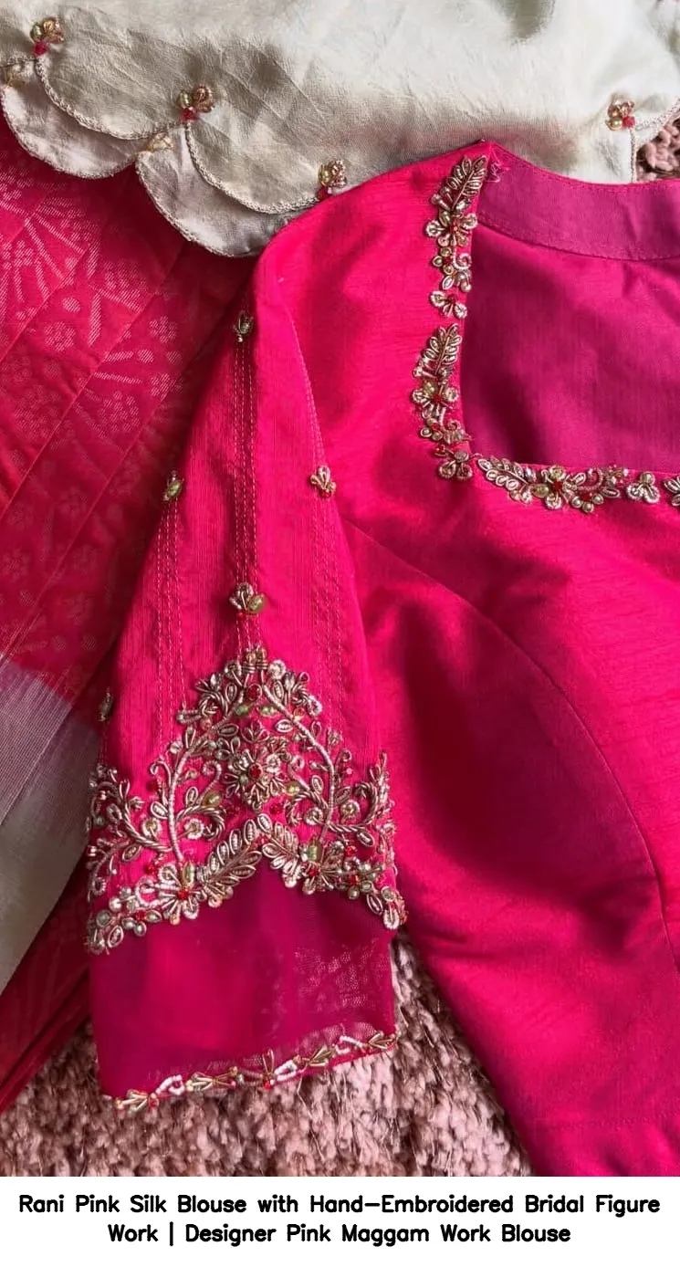 Rani Pink Silk Blouse with Hand-Embroidered Bridal Figure Work | Designer Pink Maggam Work Blouse