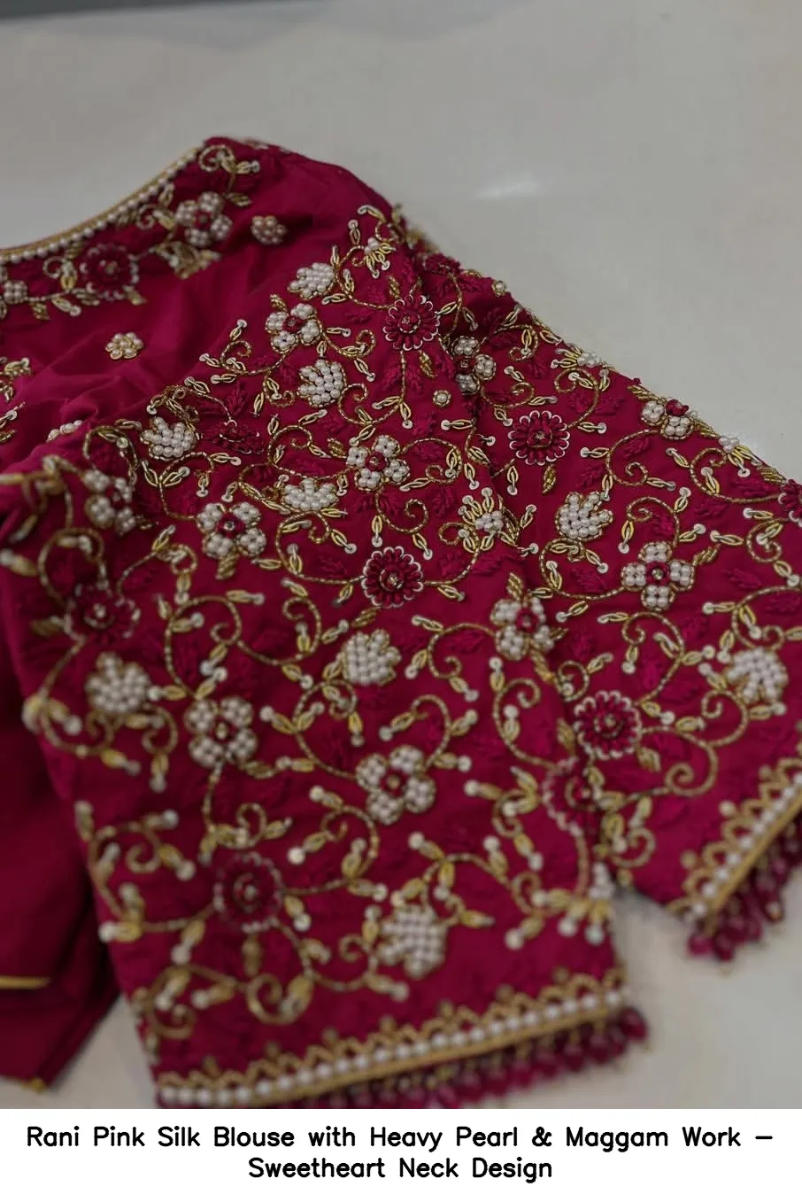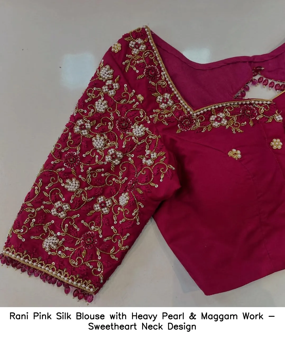 Rani Pink Silk Blouse with Heavy Pearl & Maggam Work – Sweetheart Neck Design