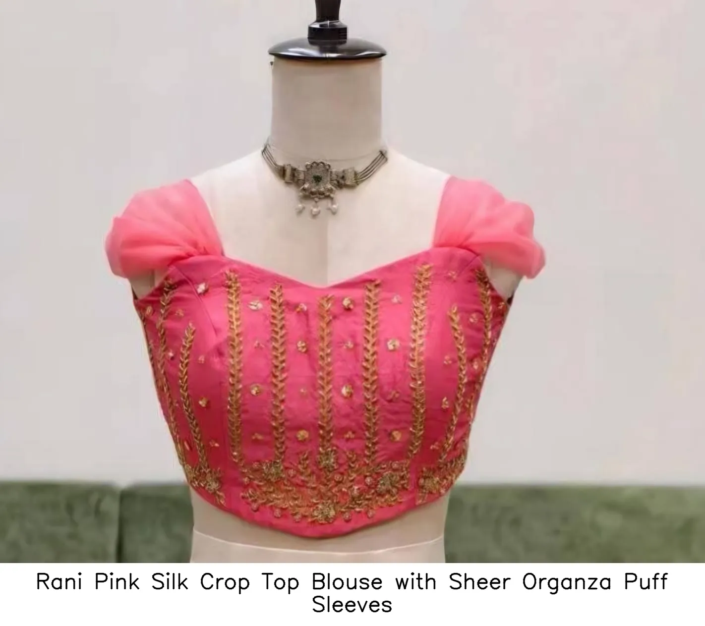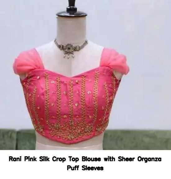 Product Name: ββRani Pink Silk Crop Top Blouse with Sheer Organza Puff Sleeves
