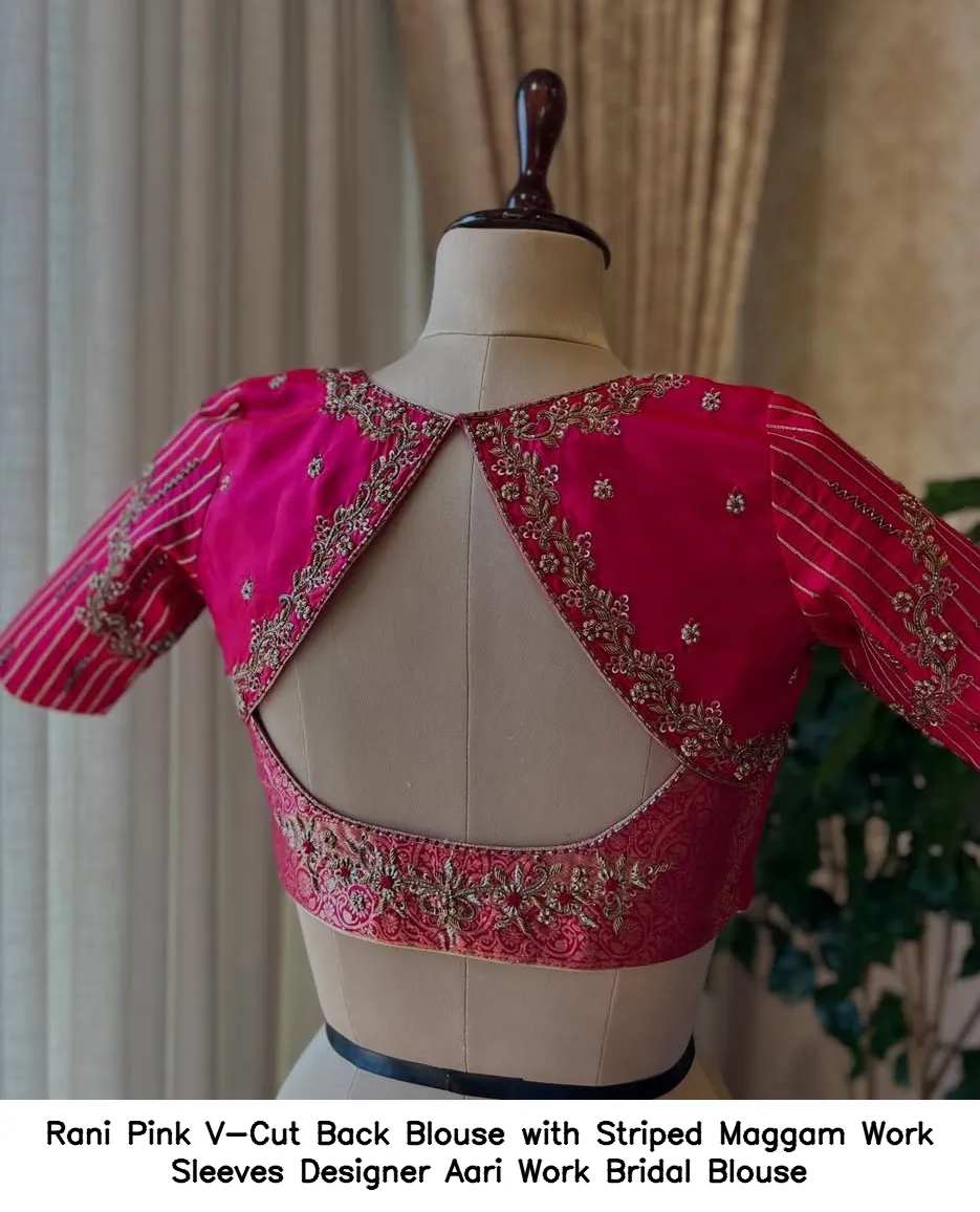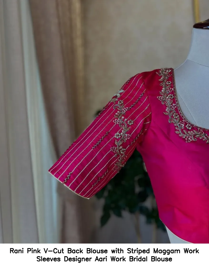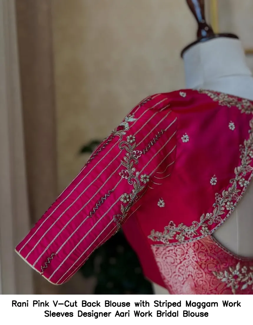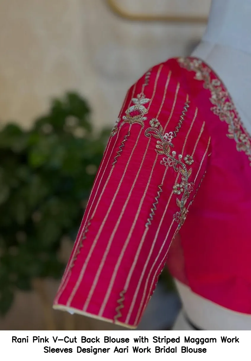 Rani Pink V-Cut Back Blouse with Striped Maggam Work Sleeves – Designer Aari Work Bridal Blouse