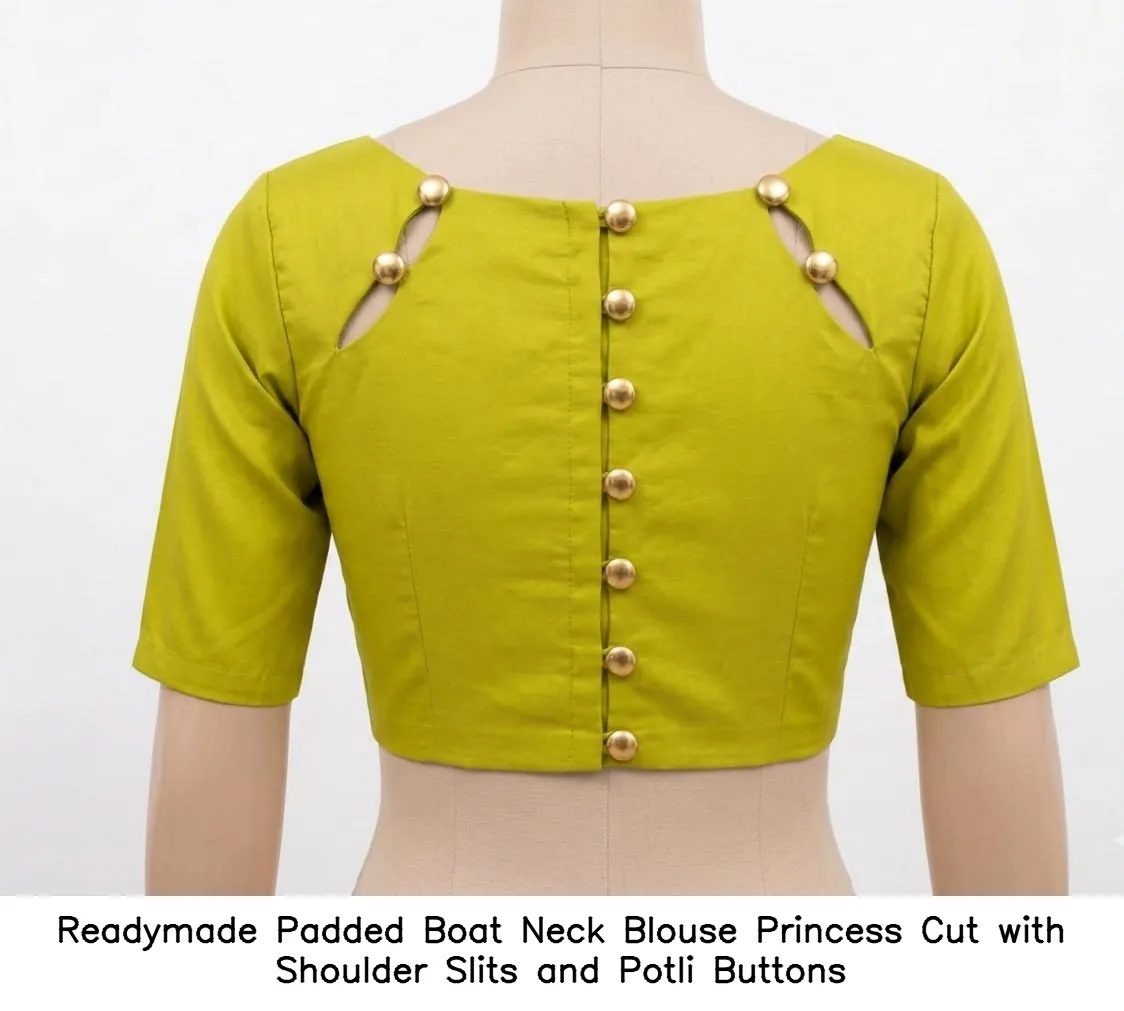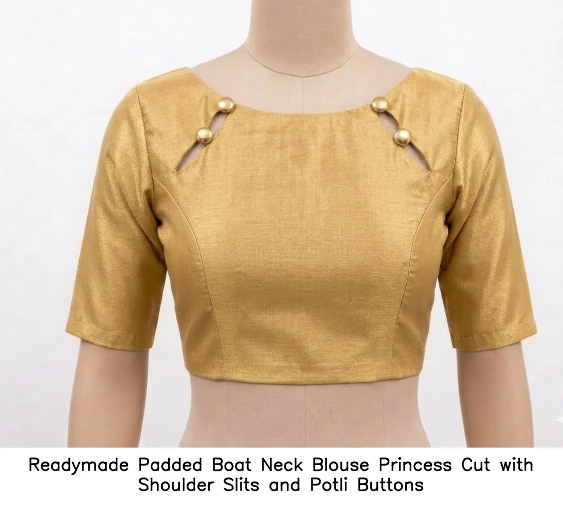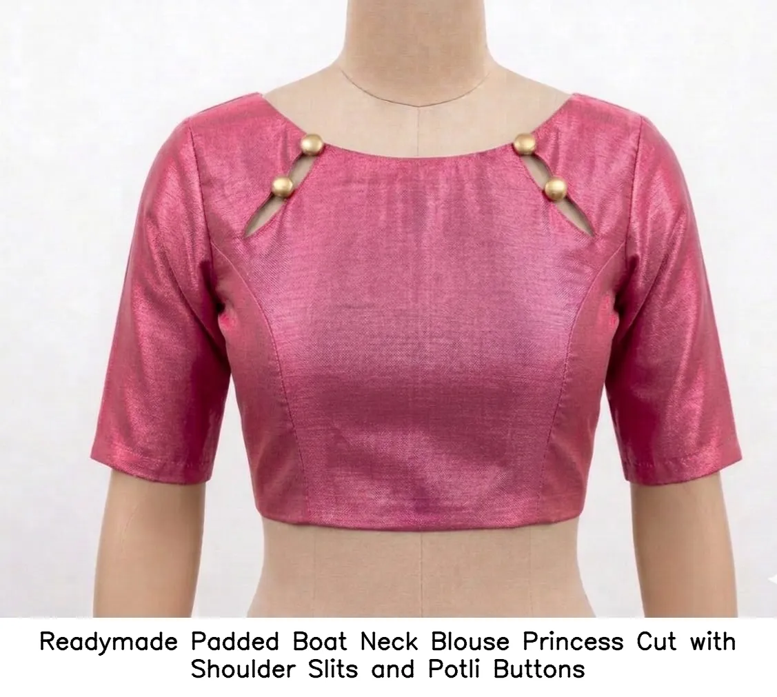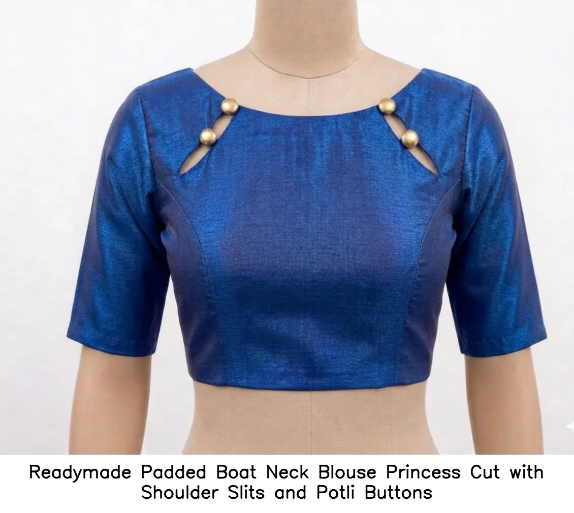 Readymade Padded Boat Neck Blouse – Princess Cut with Shoulder Slits and Potli Buttons