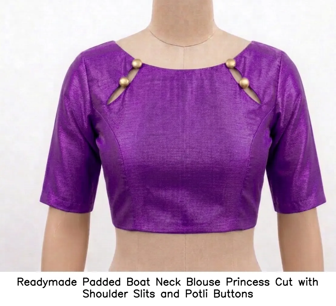 The Readymade Padded Boat Neck Blouse – Princess Cut with Shoulder Slits and Potli Buttons is available in a range of vibrant colors including Red, Pink, Blue, Purple, and Wine. Sizes XL, XXL, and 3XL ensure a perfect fit for everyone.