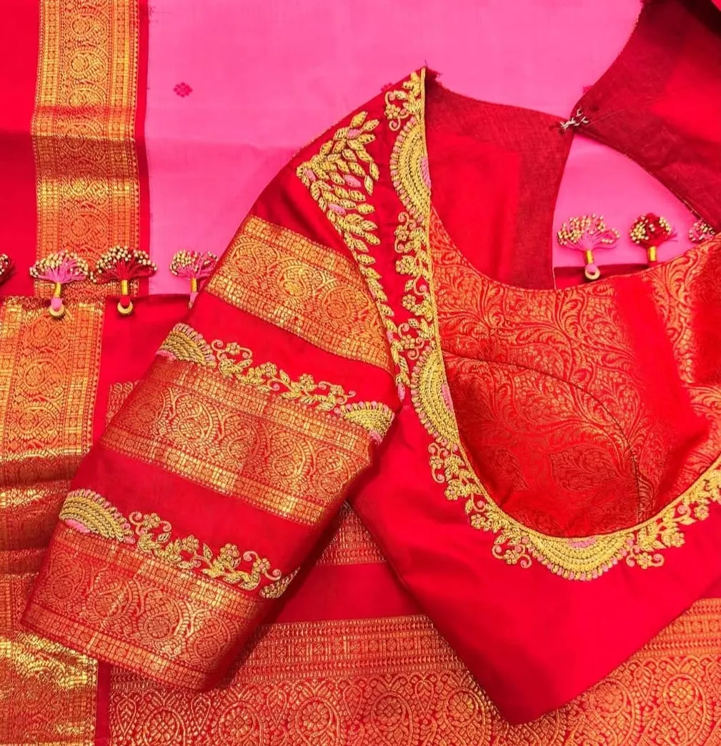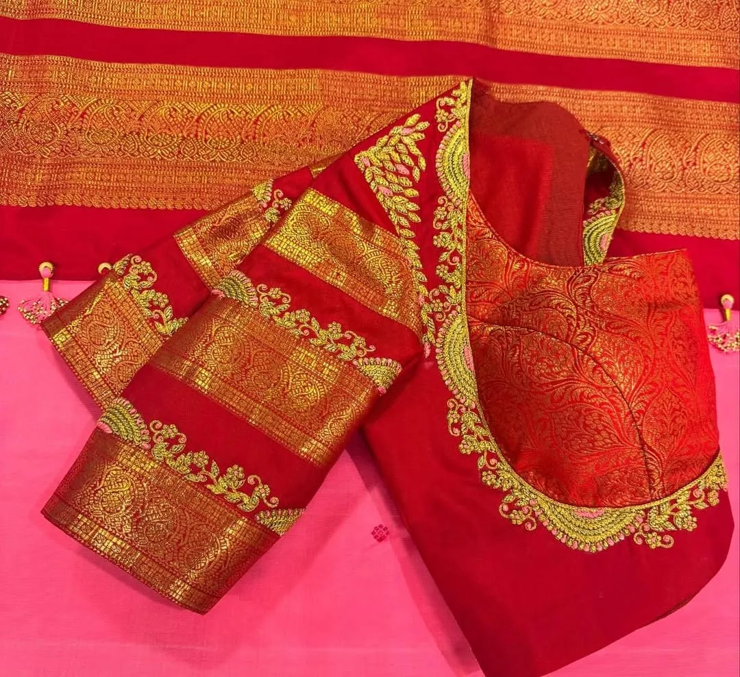 Stunning Red Raw Silk with Maggam Work blouse. Crafted for wedding wear, pairs beautifully with silk sarees and lehengas.