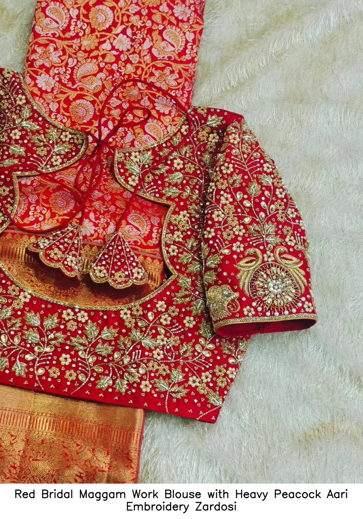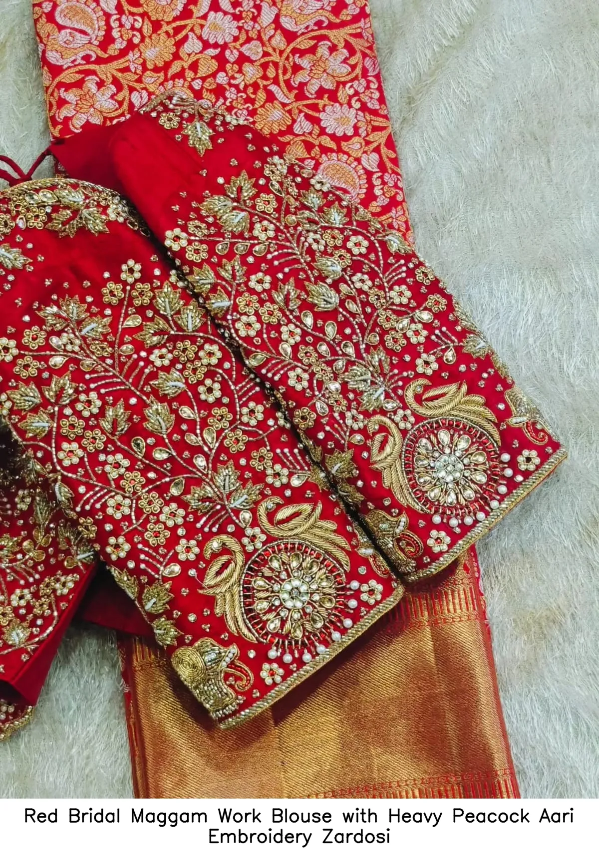 Product Name: ​​Red Bridal Maggam Work Blouse with Heavy Peacock Aari Embroidery Zardosi