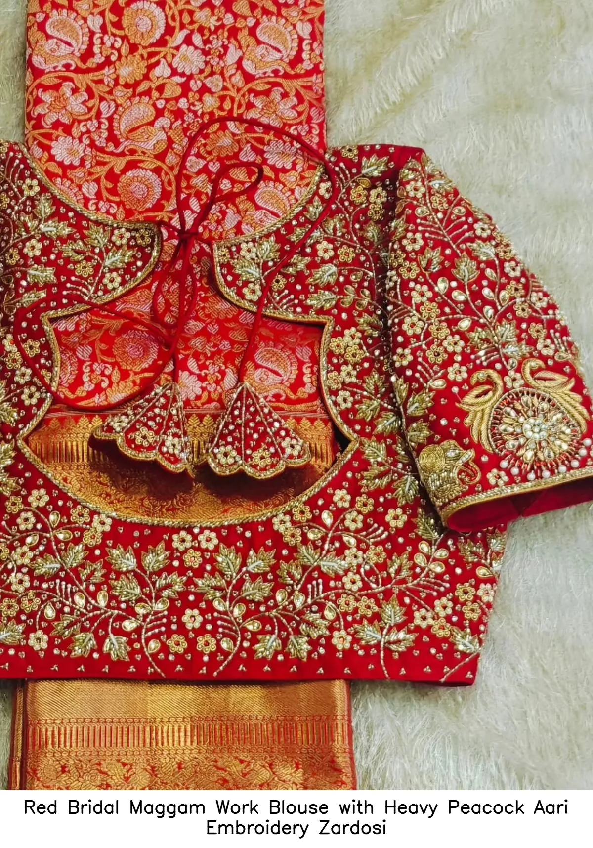 Red Bridal Maggam Work Blouse with Heavy Peacock Aari Embroidery Zardosi
