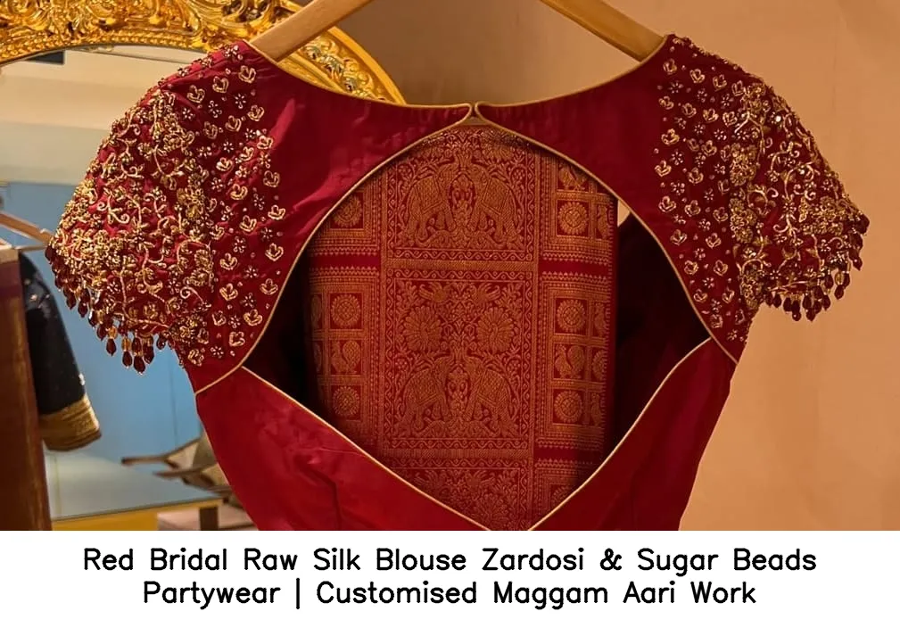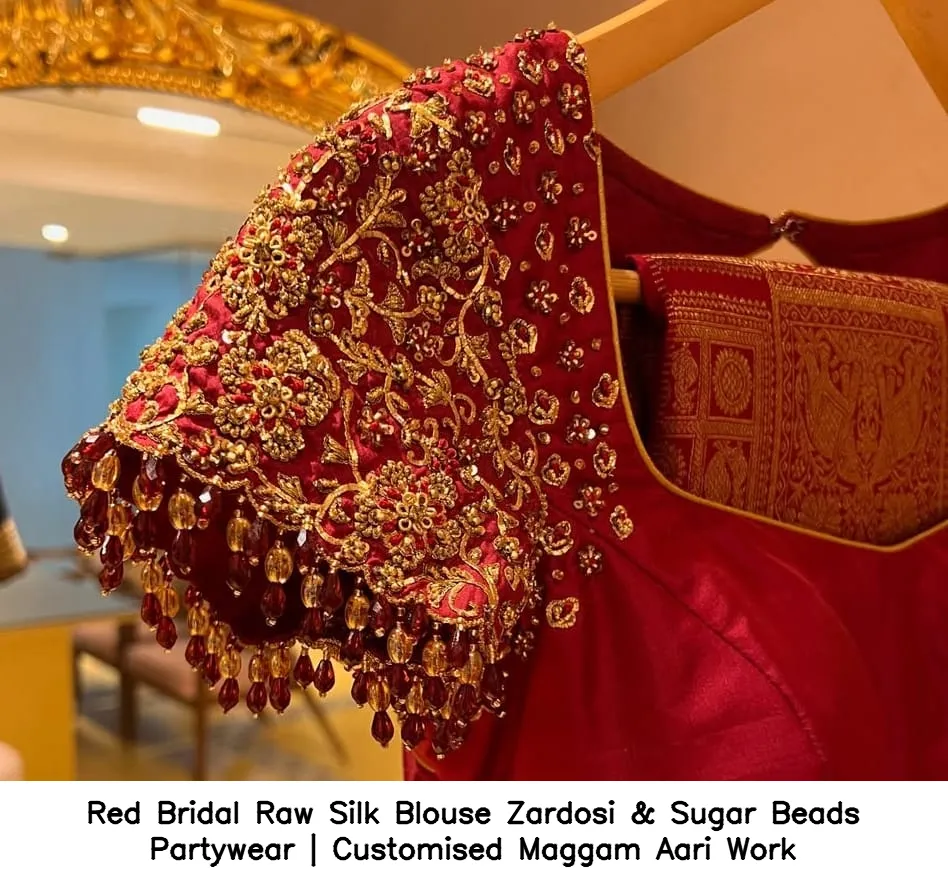 Red Bridal Raw Silk Blouse – Zardosi & Sugar Beads Partywear | Customised Maggam Aari Work