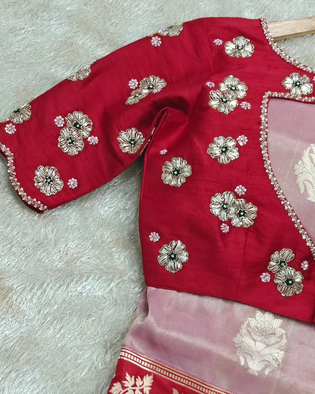 ✨ Product Highlights: Majestic Bloom – Red Floral Maggam Work Designer Blouse