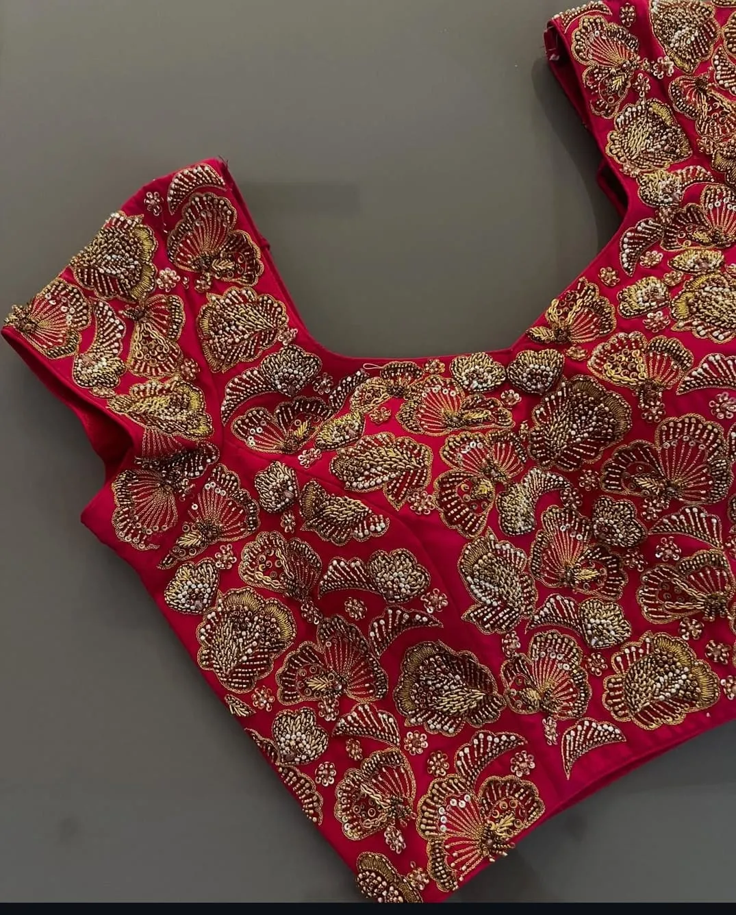 Stunning Red Raw Silk with Maggam Work blouse. Crafted for bridal wear, pairs beautifully with silk sarees and lehengas.