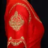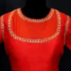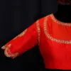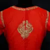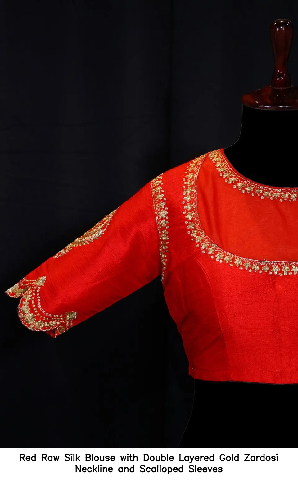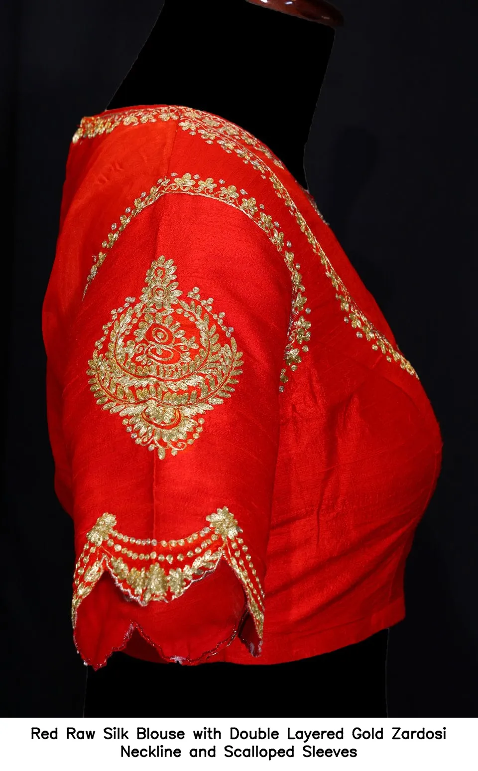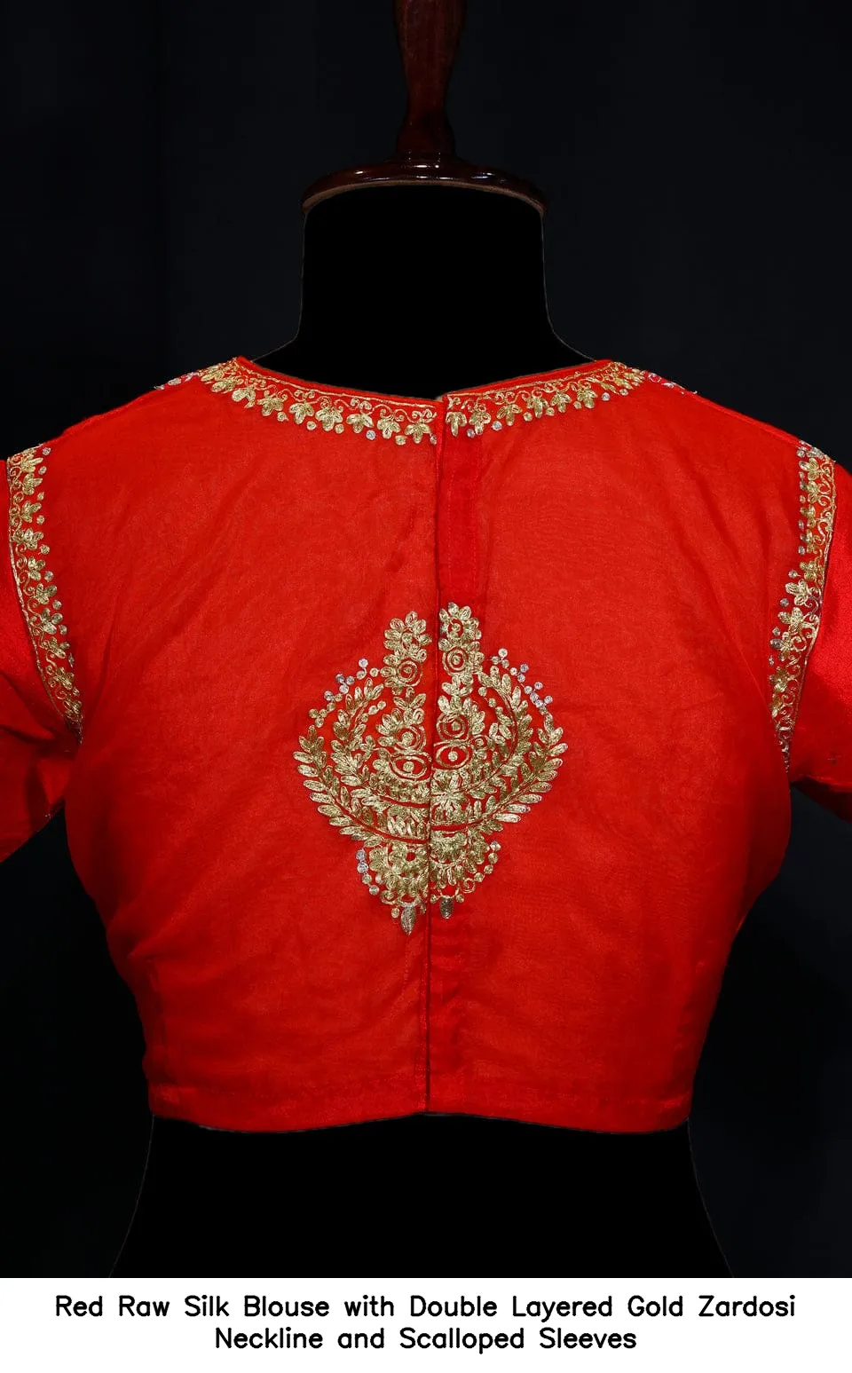 ​Red Raw Silk Blouse with Double Layered Gold Zardosi Neckline and Scalloped Sleeves