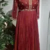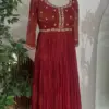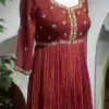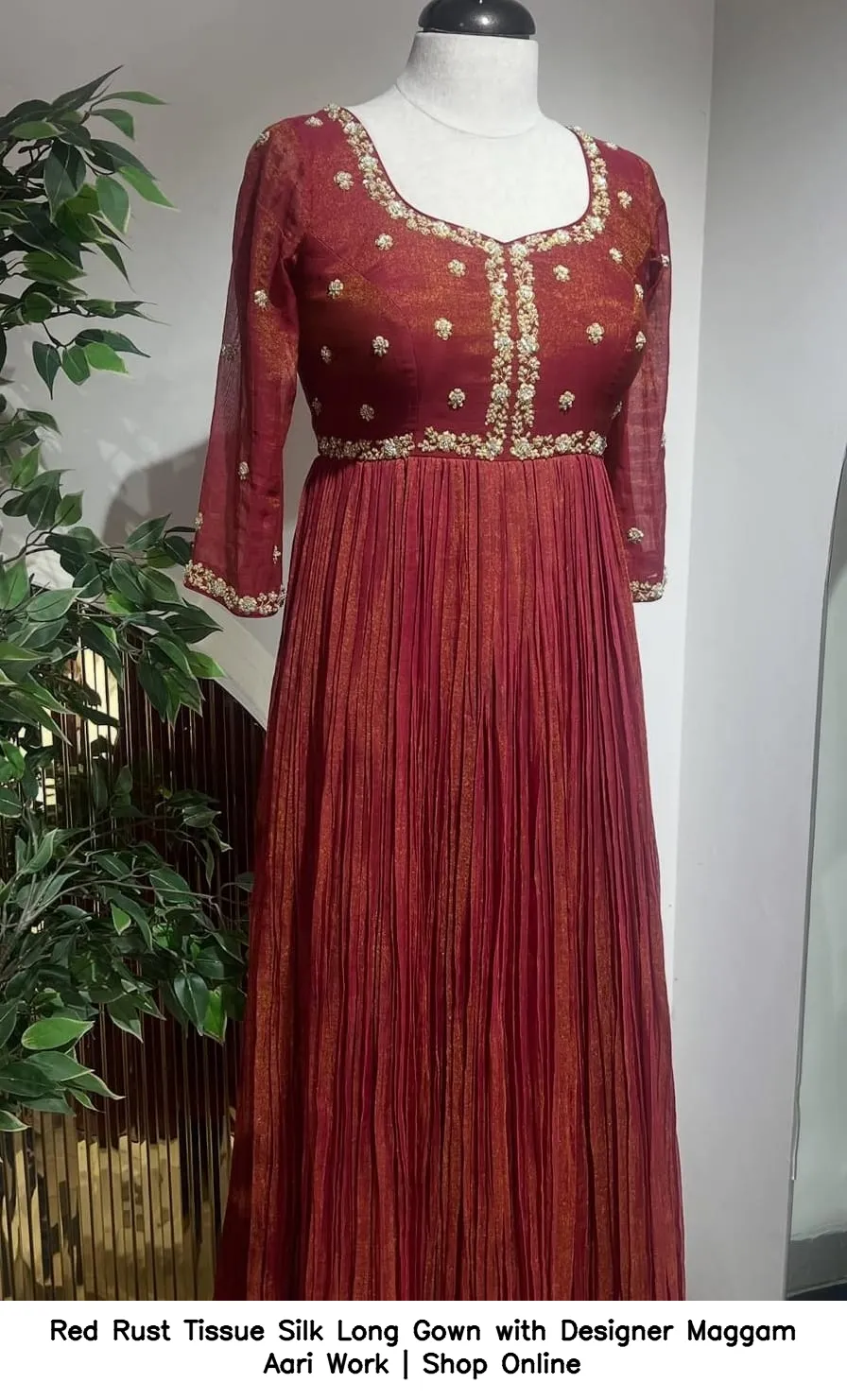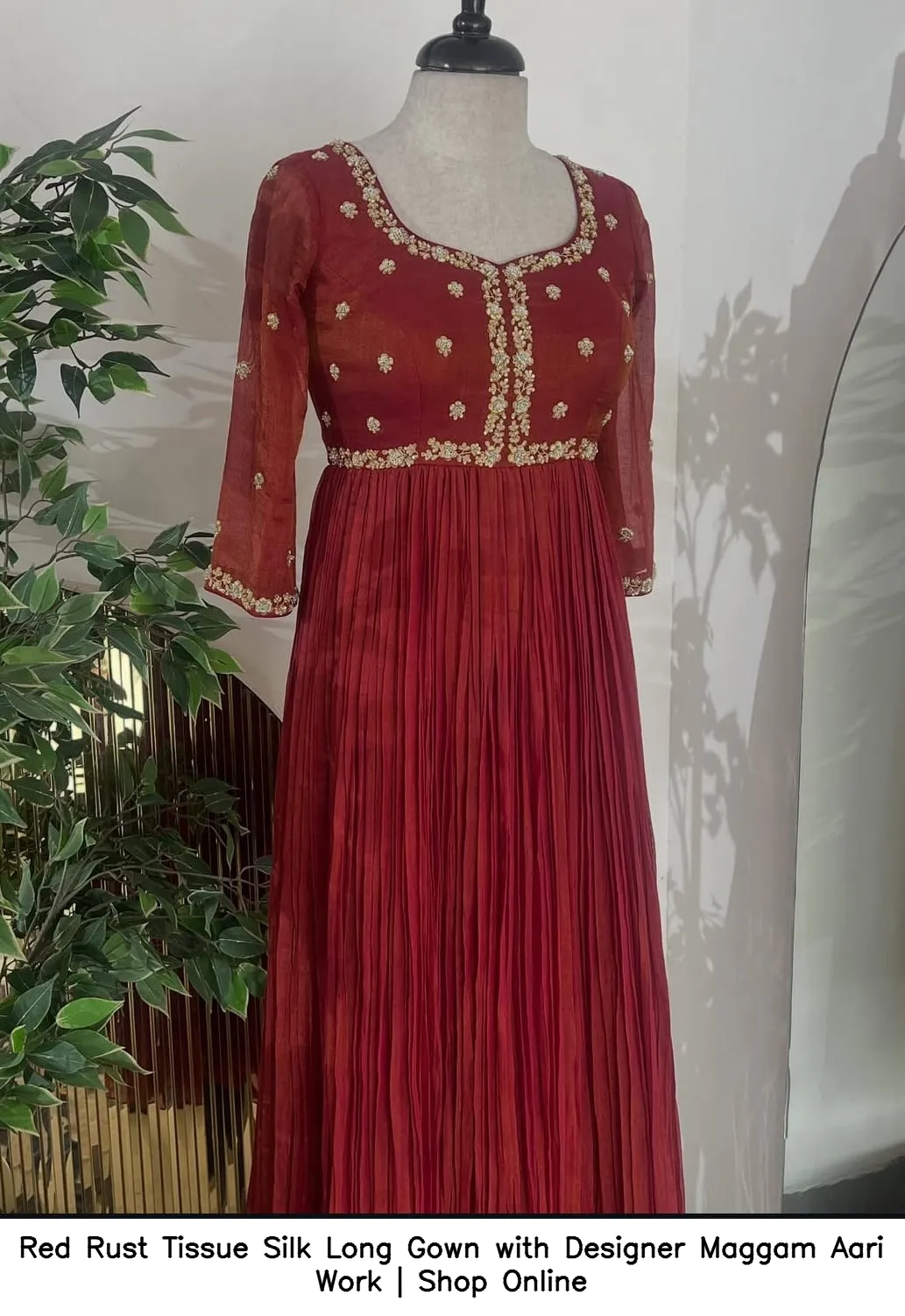 Product Name: ​​​Red Rust Tissue Silk Long Gown with Designer Maggam Aari Work | Shop Online