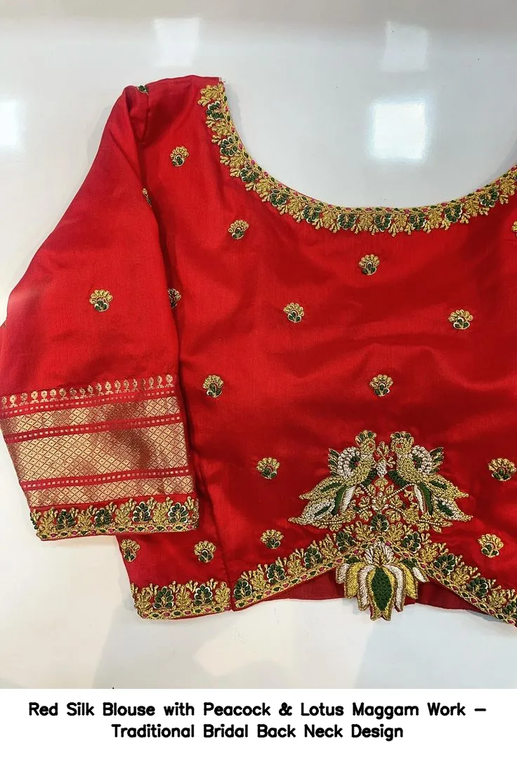 Red Silk Blouse with Peacock & Lotus Maggam Work – Traditional Bridal Back Neck Design