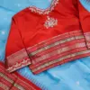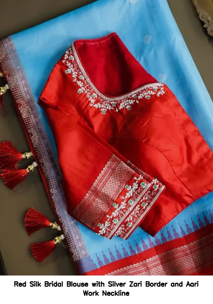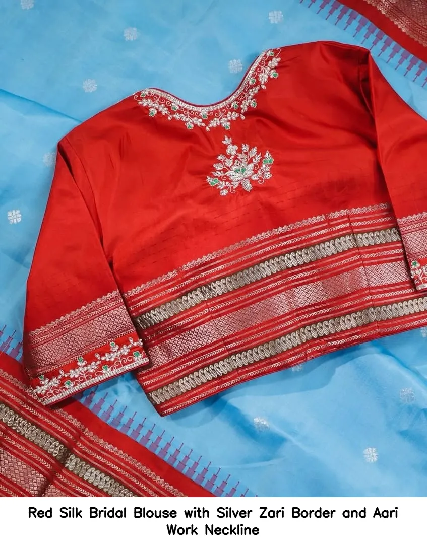 ​Red Silk Bridal Blouse with Silver Zari Border and Aari Work Neckline
