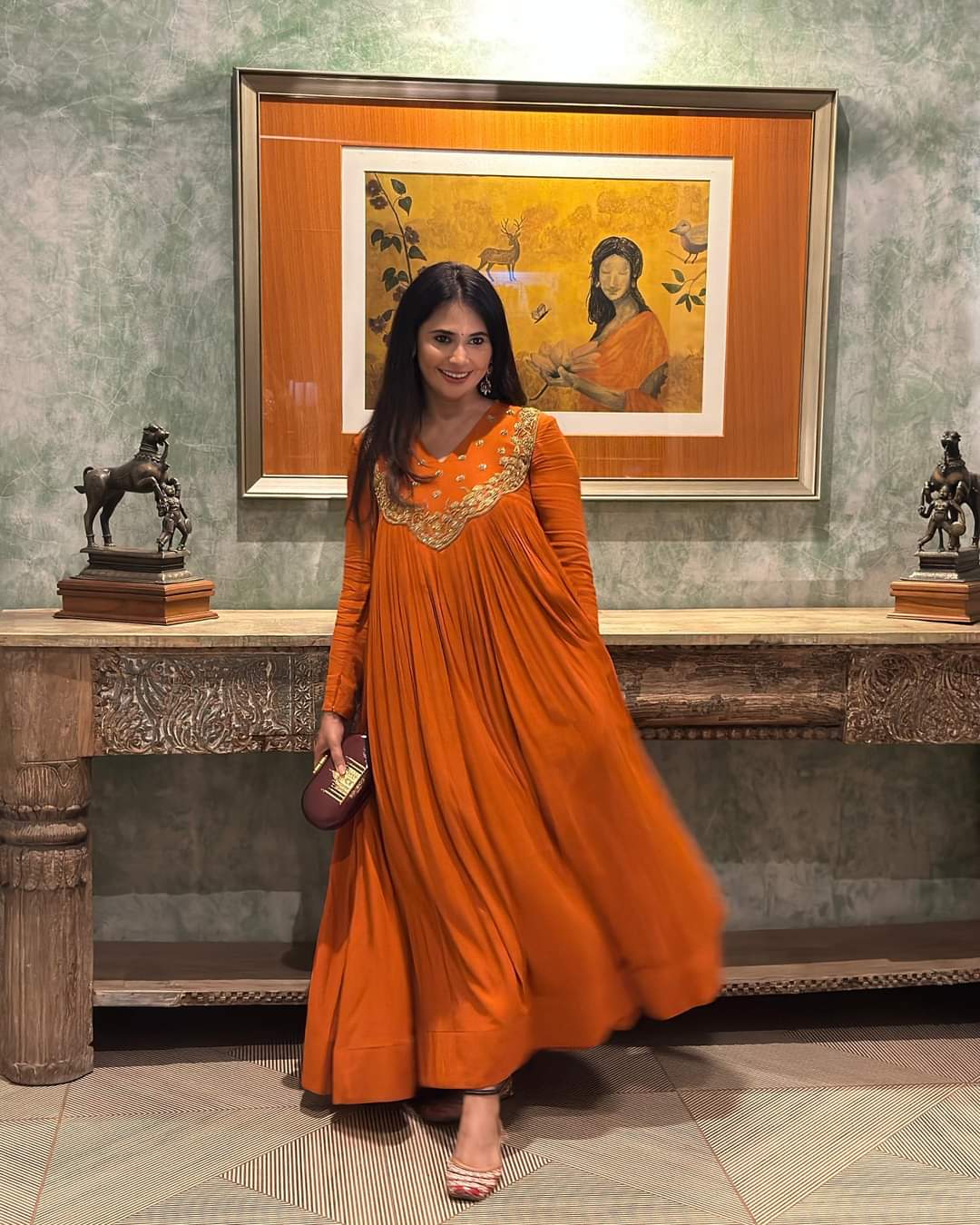 - Whether it’s a wedding, a festive celebration, or a party, this Regal Rust – Maggam Embroidered Long Frock