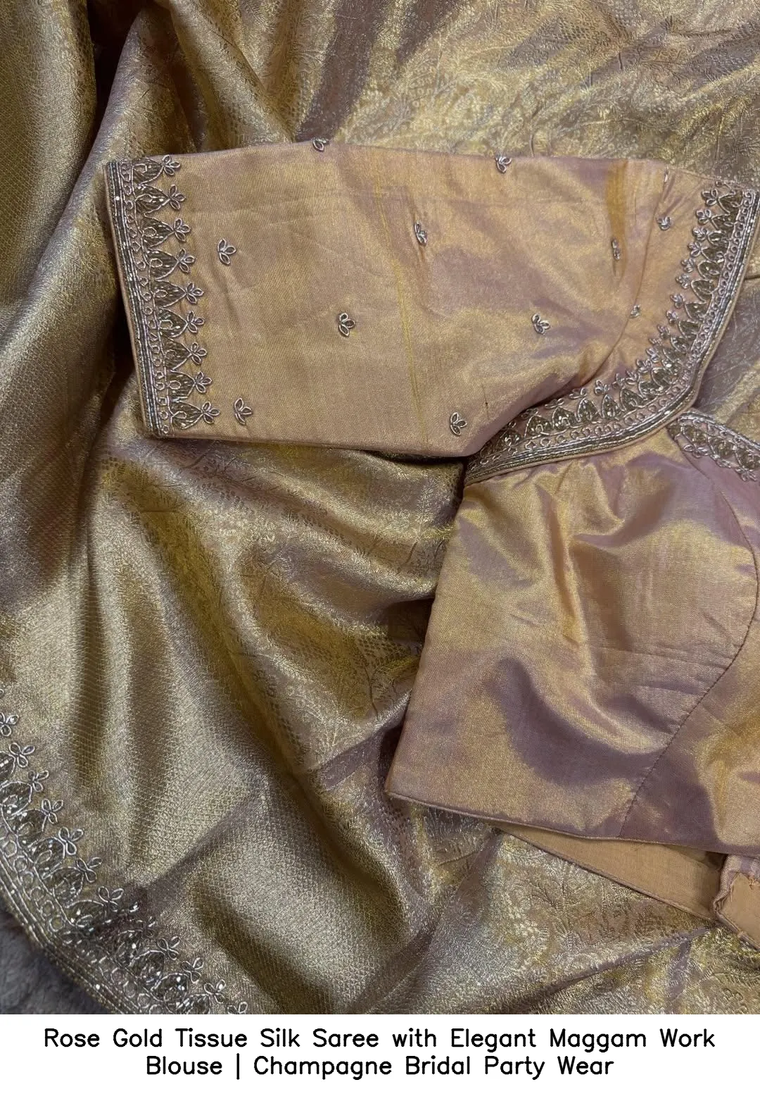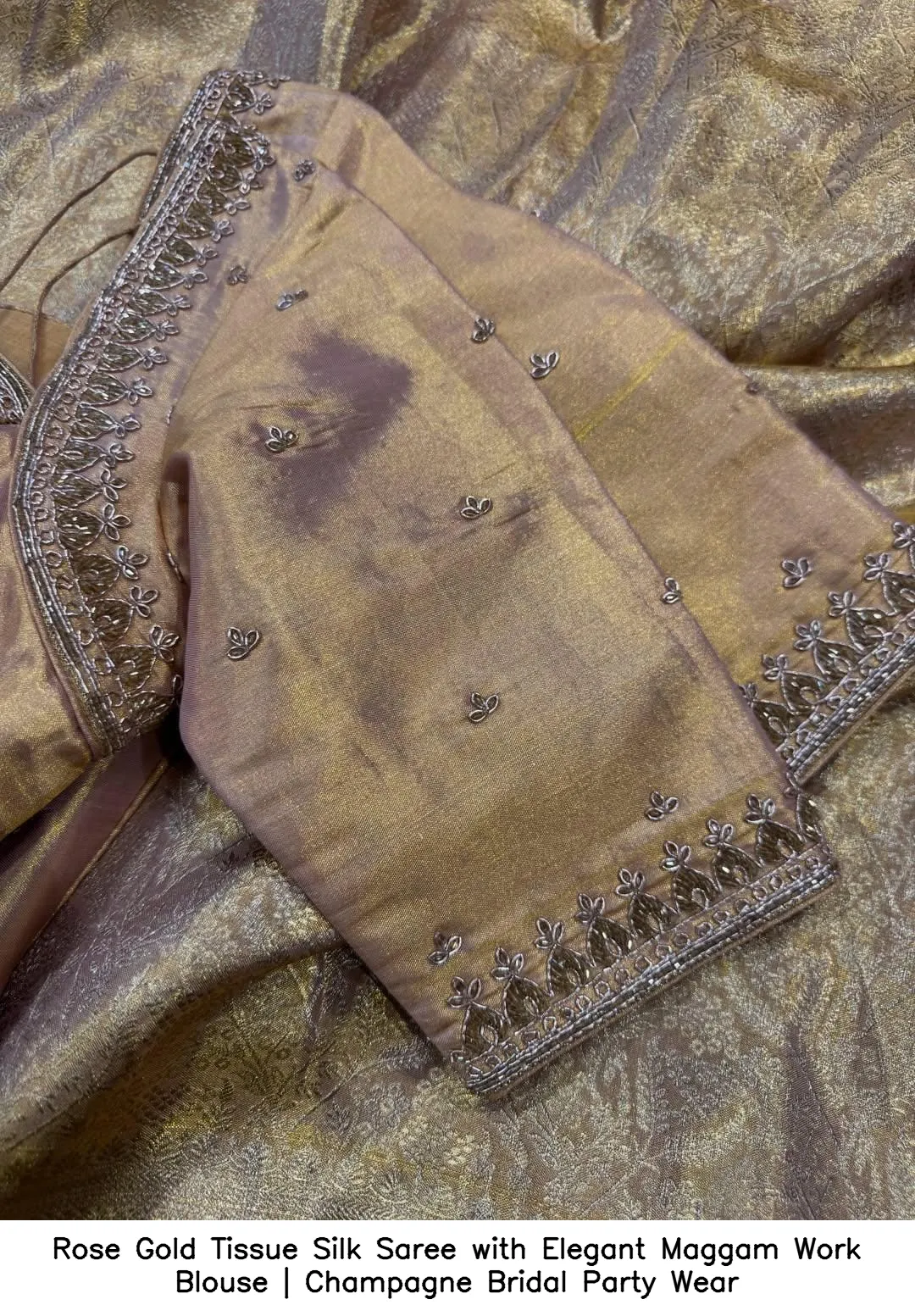 Product Name: Rose Gold Tissue Silk Saree with Elegant Maggam Work Blouse | Champagne Bridal Party Wear