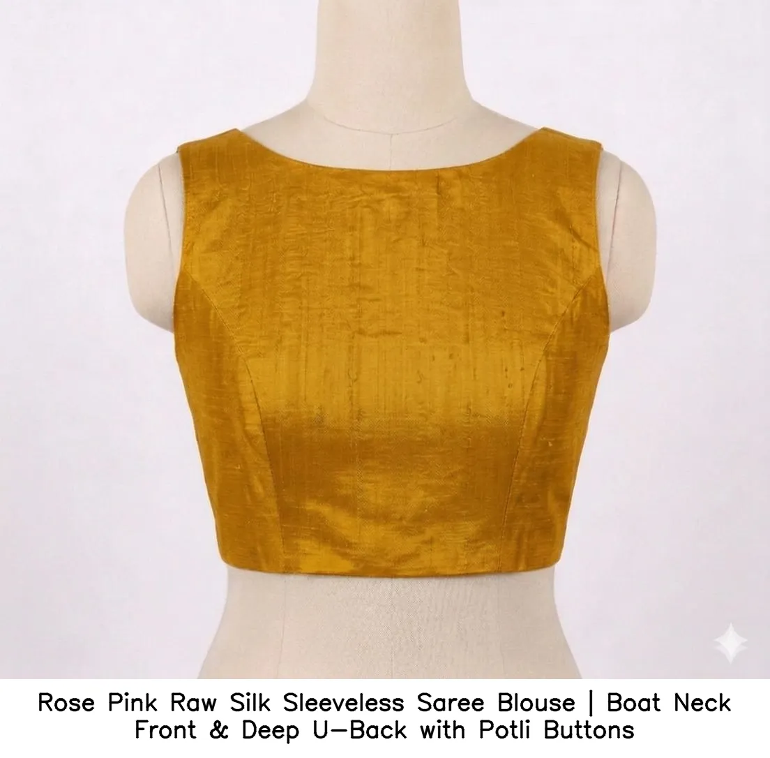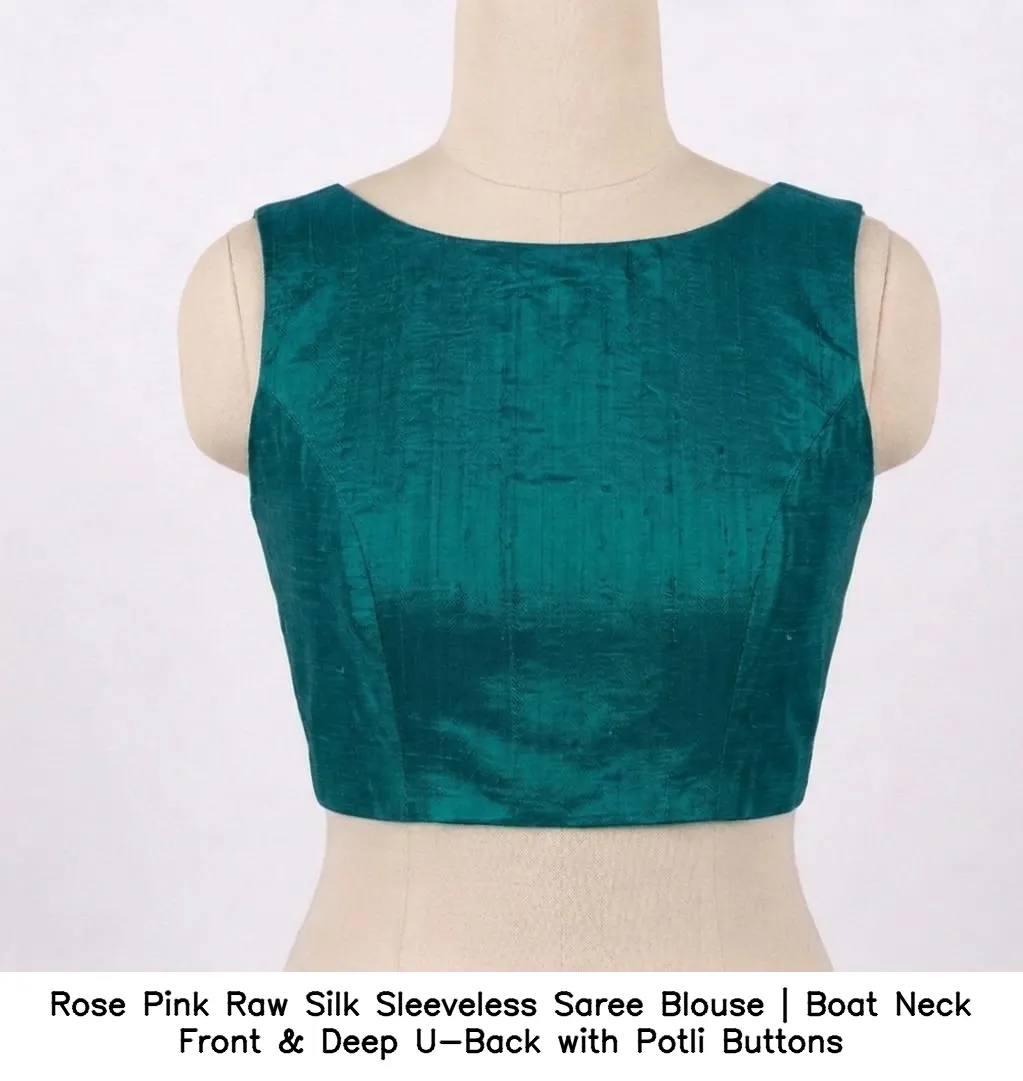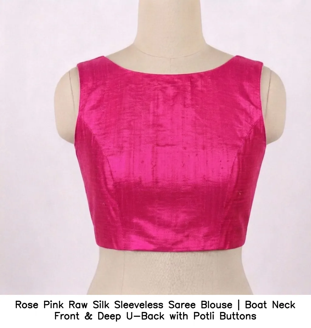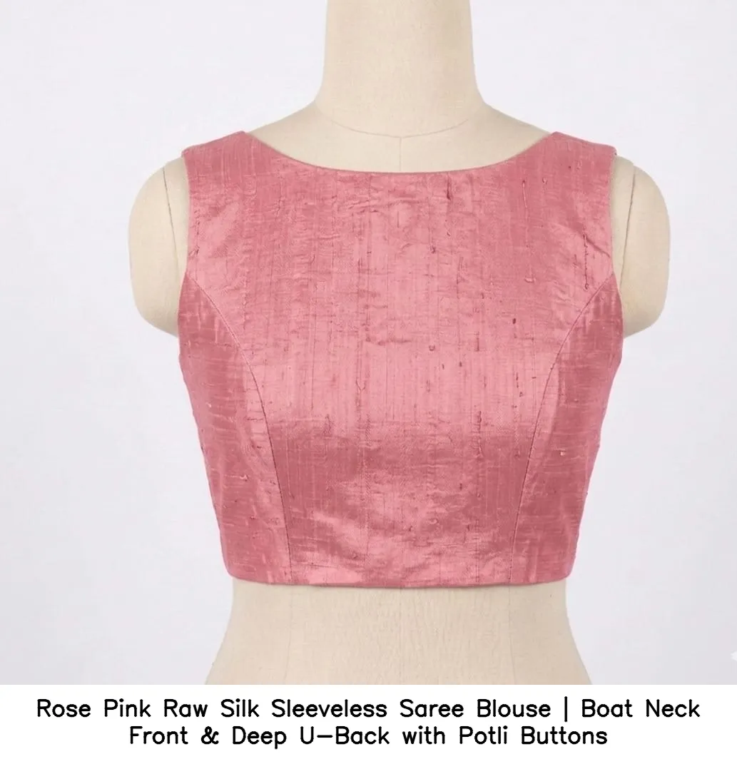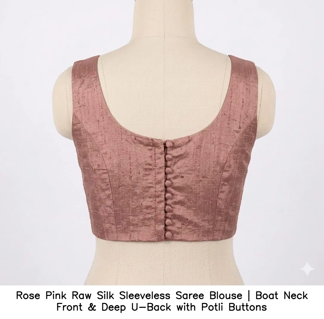 Product Name: Rose Pink Raw Silk Sleeveless Saree Blouse | Boat Neck Front & Deep U-Back with Potli Buttons
