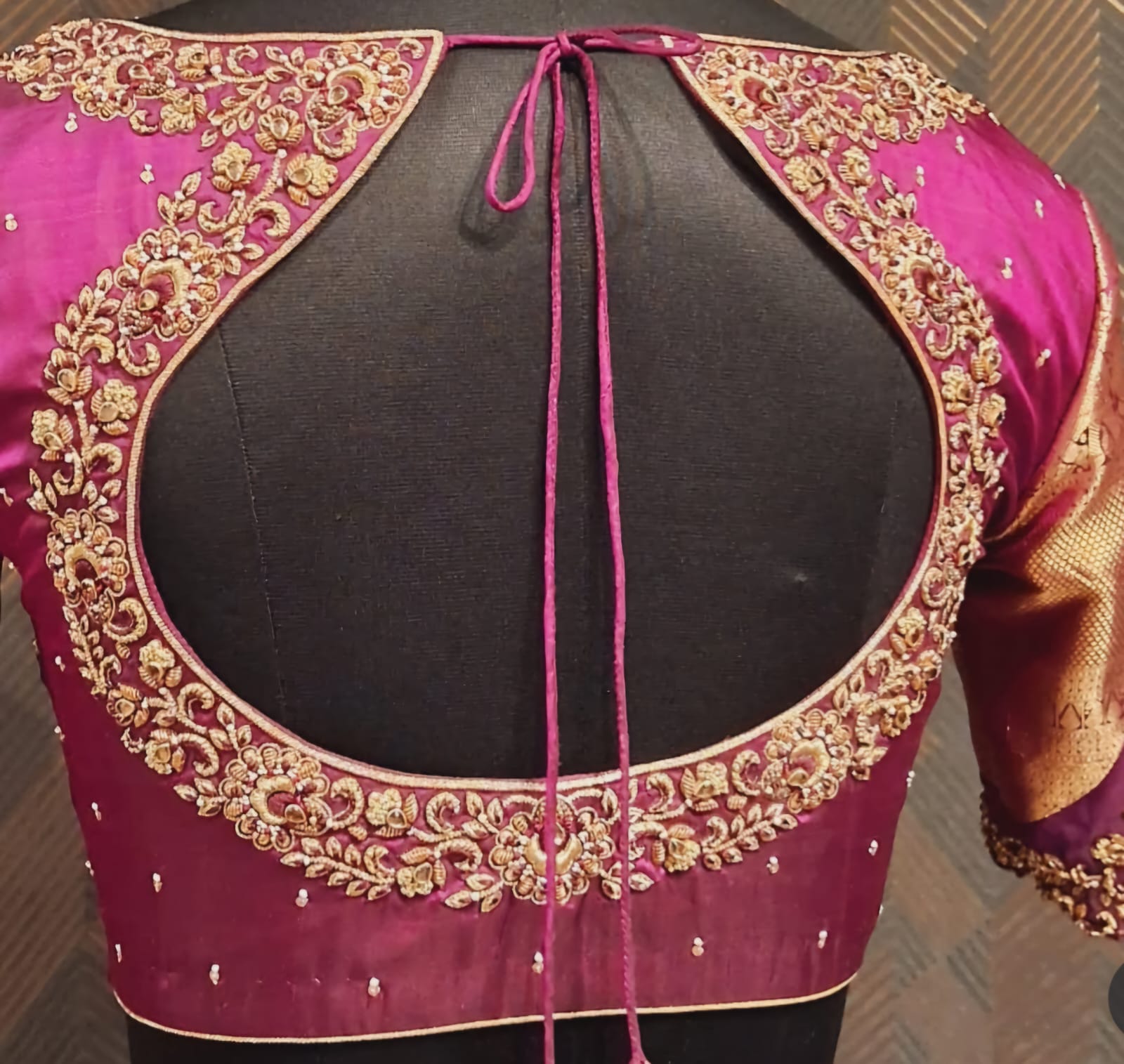 The Royal Bloom blouse is the epitome of grace and luxury. Its delicate pink hue combined with exquisite Zardosi work makes it an elegant addition to any wardrobe. Whether for a bride or someone looking for a show-stopping piece, this blouse offers sophistication and style in one.